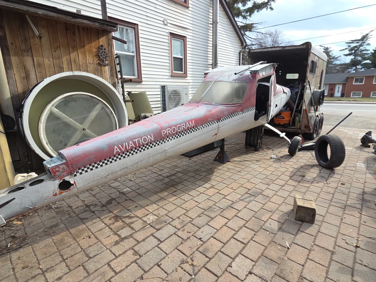 Fuselage from an "Aviation Program" aircraft. This is a substantial piece, likely from a small plane. It's currently on jack stands and being prepared for transport. It's a unique item for aviation enthusiasts or educational projects.