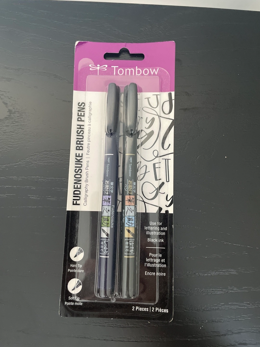 Two black Tombow Fudenosuke brush pens. Ideal for lettering and illustration. Features hard and soft tips.
