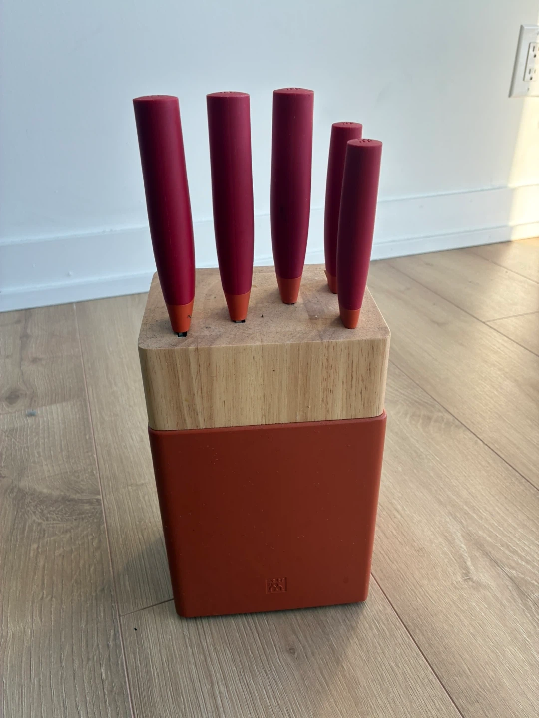 104I'm selling a ZWILLING J.A. Henckels knife block set. The set features a stylish red and wood design. It's perfect for keeping your knives organized and within easy reach in the kitchen