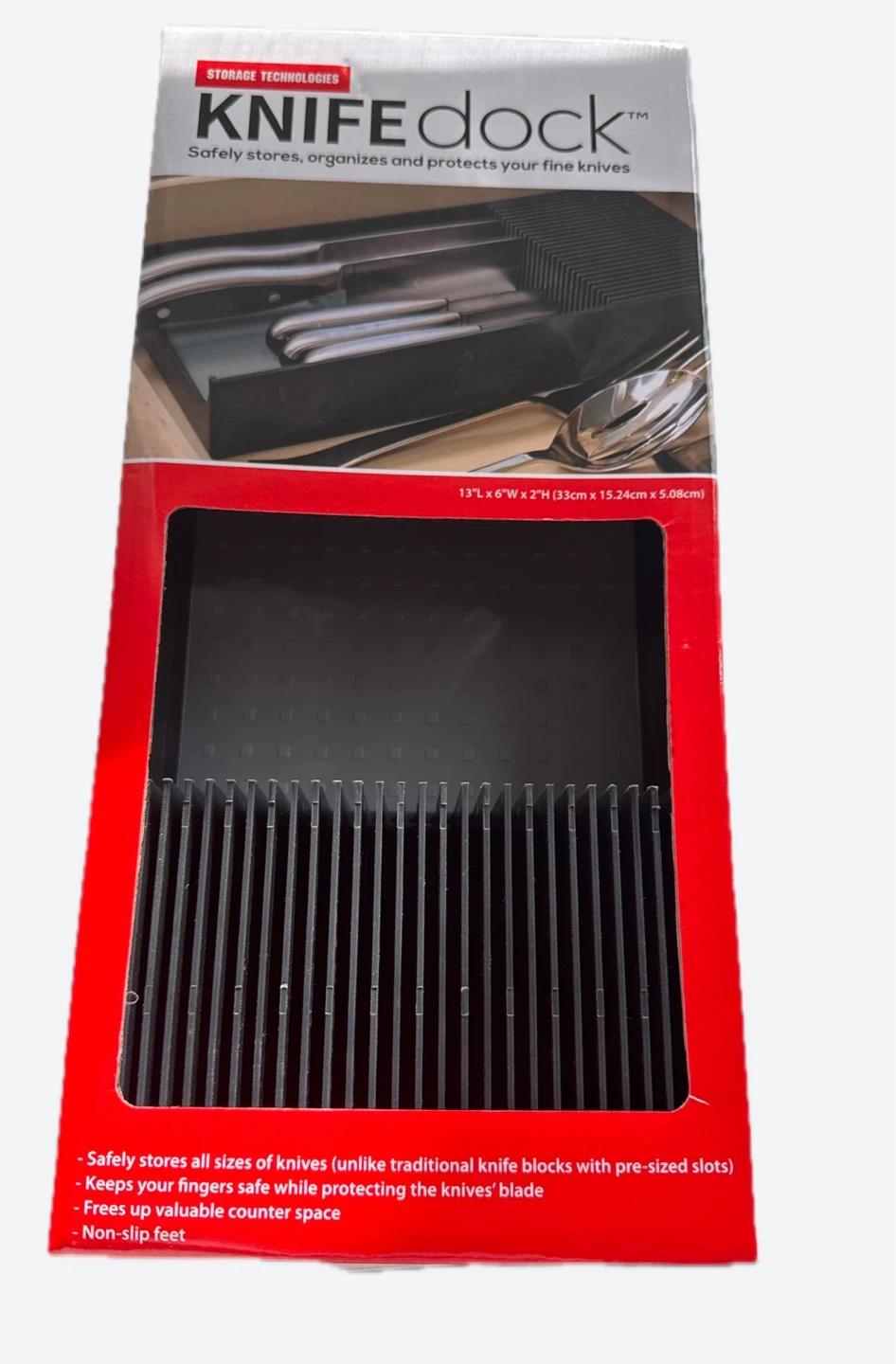 10The Knife Dock safely stores, organizes, and protects your fine knives. It safely stores all sizes of knives, unlike traditional knife blocks with pre-sized slots. It also keeps your fingers safe while protecting the knives' blade and frees up valuable counter space. It also has non-slip feet. Dimensions: 13"L x 6"W x 2"H (33cm x 15.24cm x 5.08cm)
