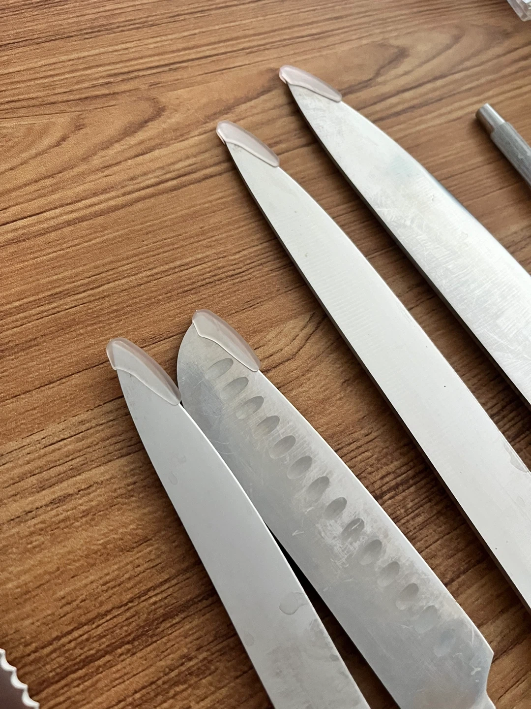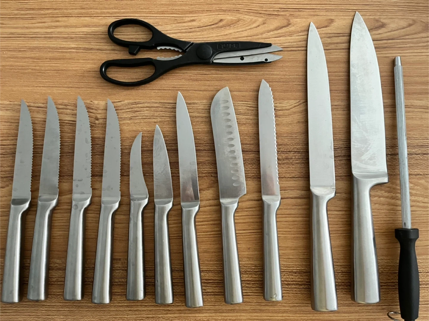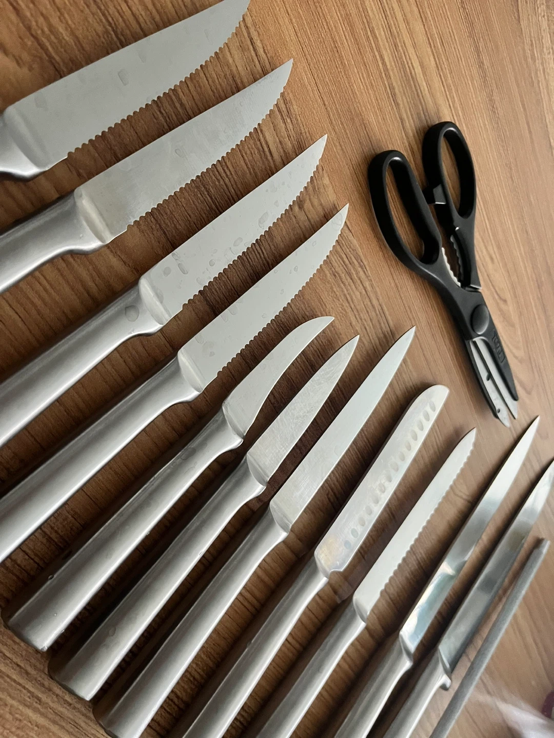 ********Moving-out Sale****** Pick-up is available only between Oct 26 and Oct 27 Knife Block Set, Homever 16-Piece Kitchen Knife Sets with Block, High-Carbon Stainless Steel, Chef Knives with Sharpener, Super-Sharp Blade & Ergonomic Steel Handles, 6 Steak Knives, Easy Clean, Black Used for about 3 years, but mostly used the utility knife, other knives were hardly used. Please note that 2 steak knives are missing and the wooden block is not included(It's broken) They will be wrapped safely for you :) From Amazon https://a.co/d/ctARzi4