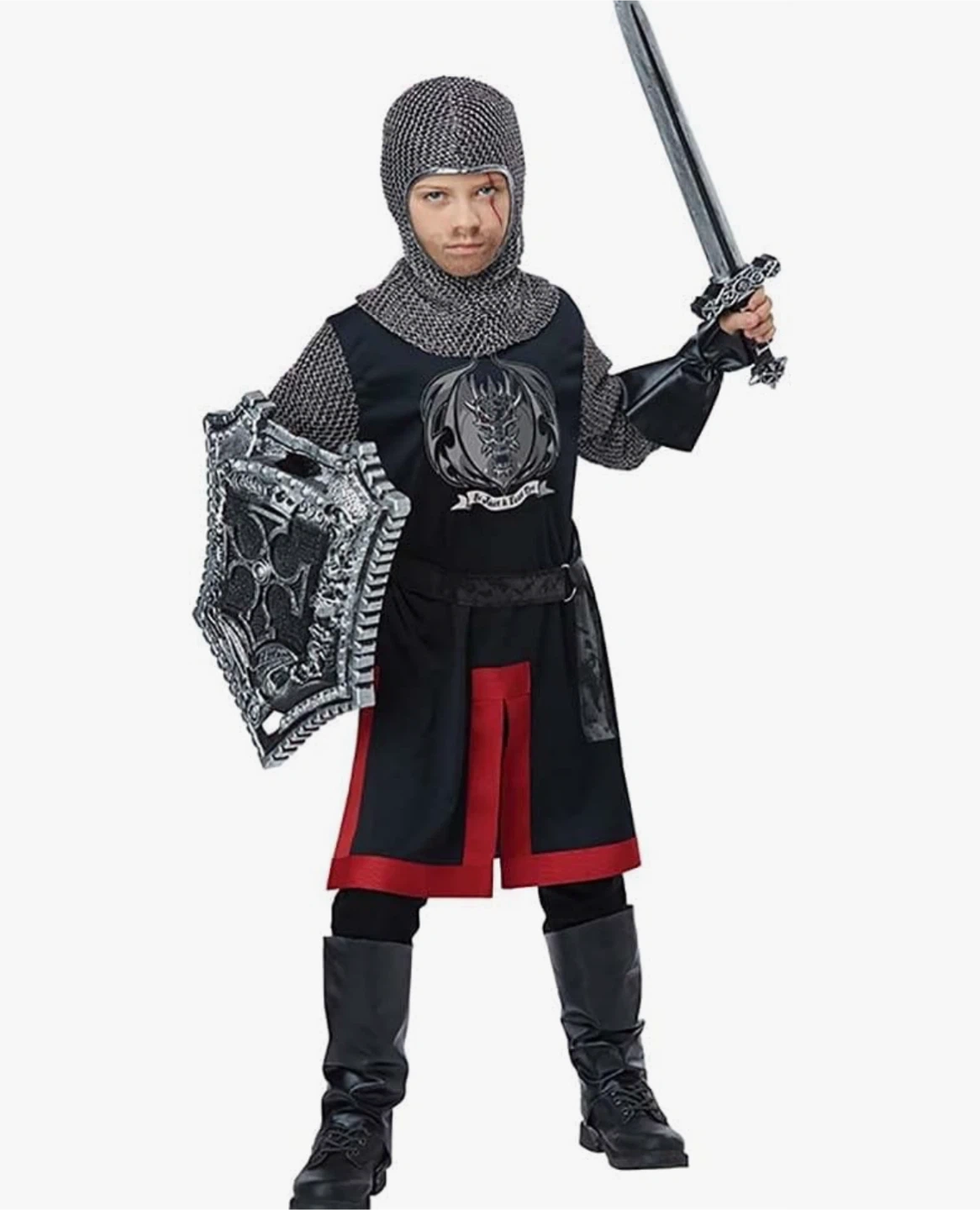 Cool knight costume for kids! Includes helmet, shield, sword, and tunic. Great for dress-up or Halloween!