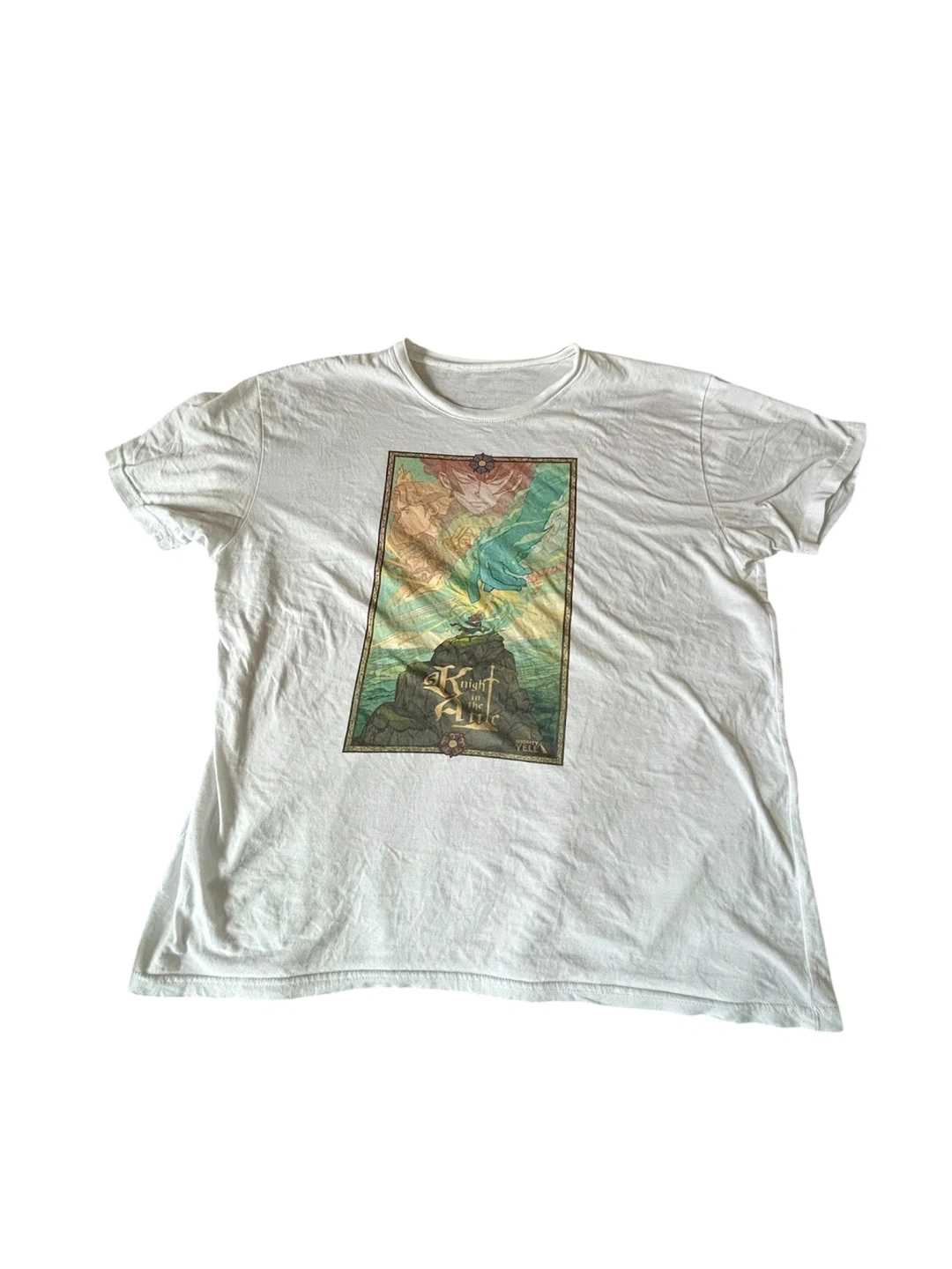 Here's a white t-shirt featuring a design that says 'Knight in the Attic'. It's in good condition and ready for a new home! The material is light and soft cotton, and the size is large or extra large. Free with purchase!