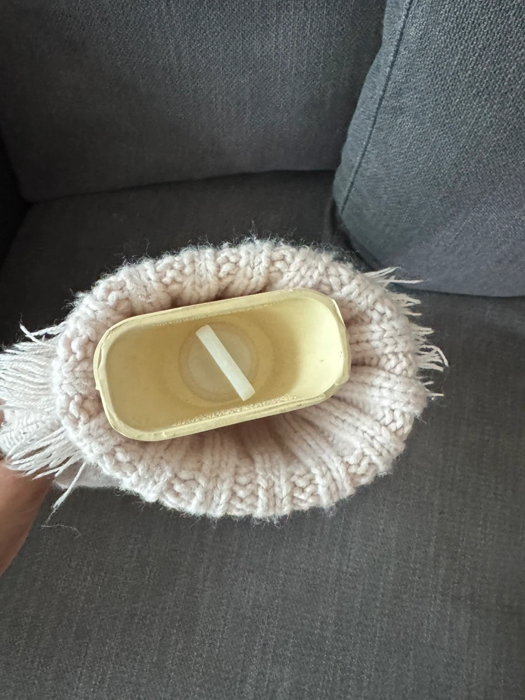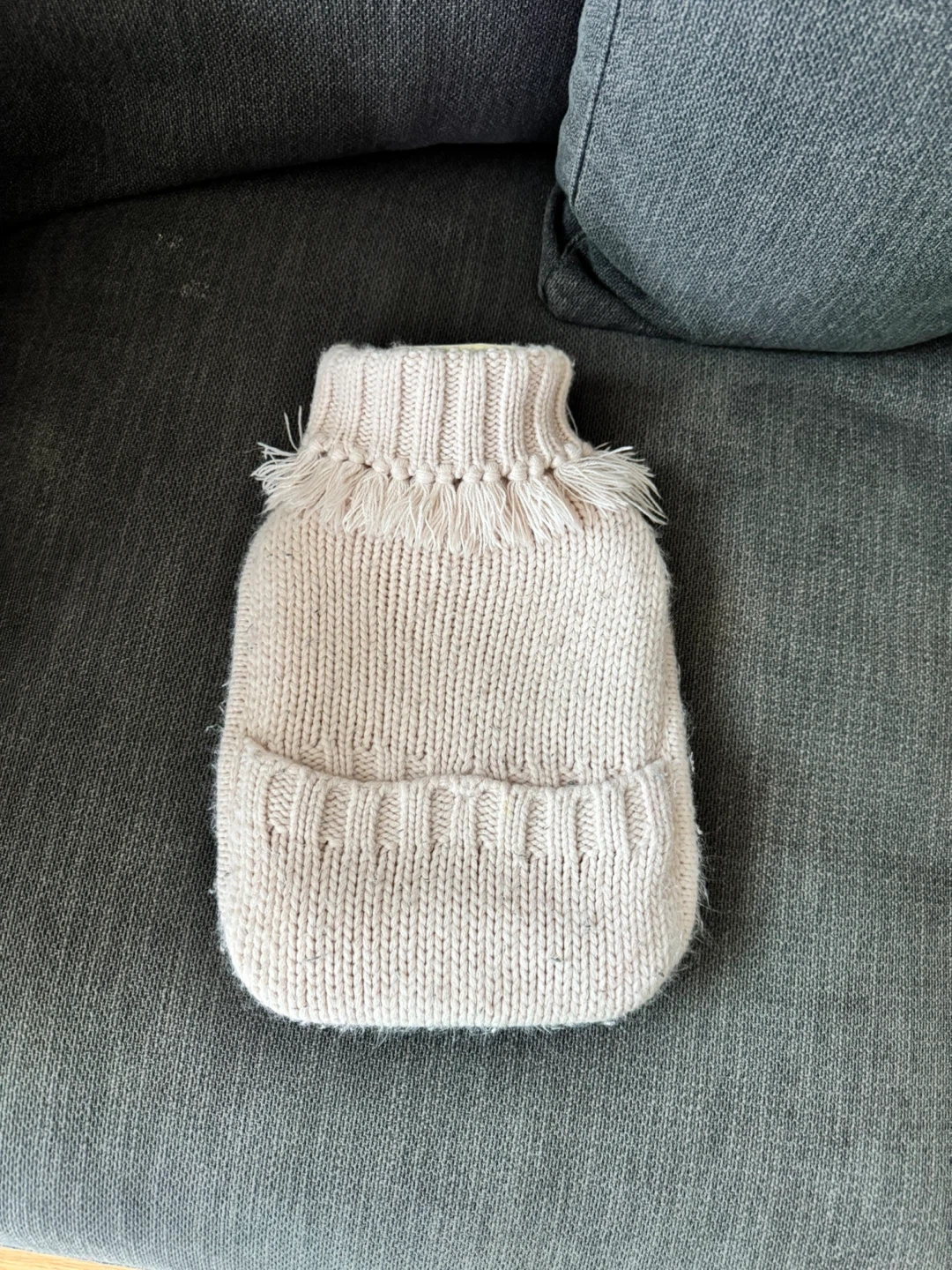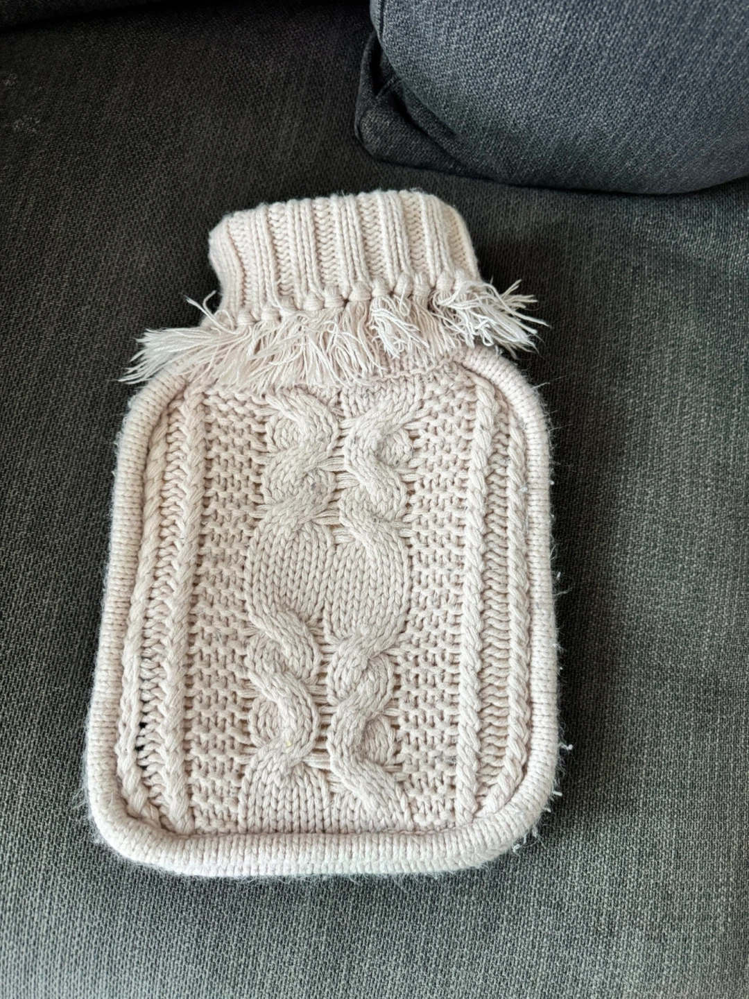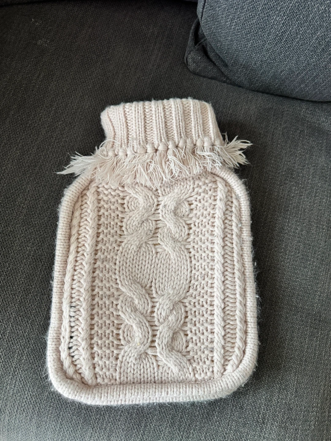 Selling a cozy, knitted hot water bottle cover and hot water bottle. It's in great condition and ready to keep you warm on chilly nights. The cover is a soft, light pink colour with a lovely cable knit design and fringe detail at the top. Perfect for adding a touch of warmth and comfort to your home