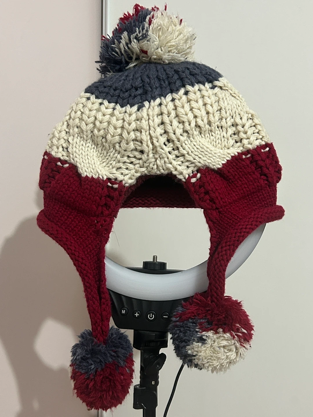 28Cozy knitted hat with fun pom poms! The colours are a lovely mix of red, white, and blue. Perfect for keeping warm during the colder months!