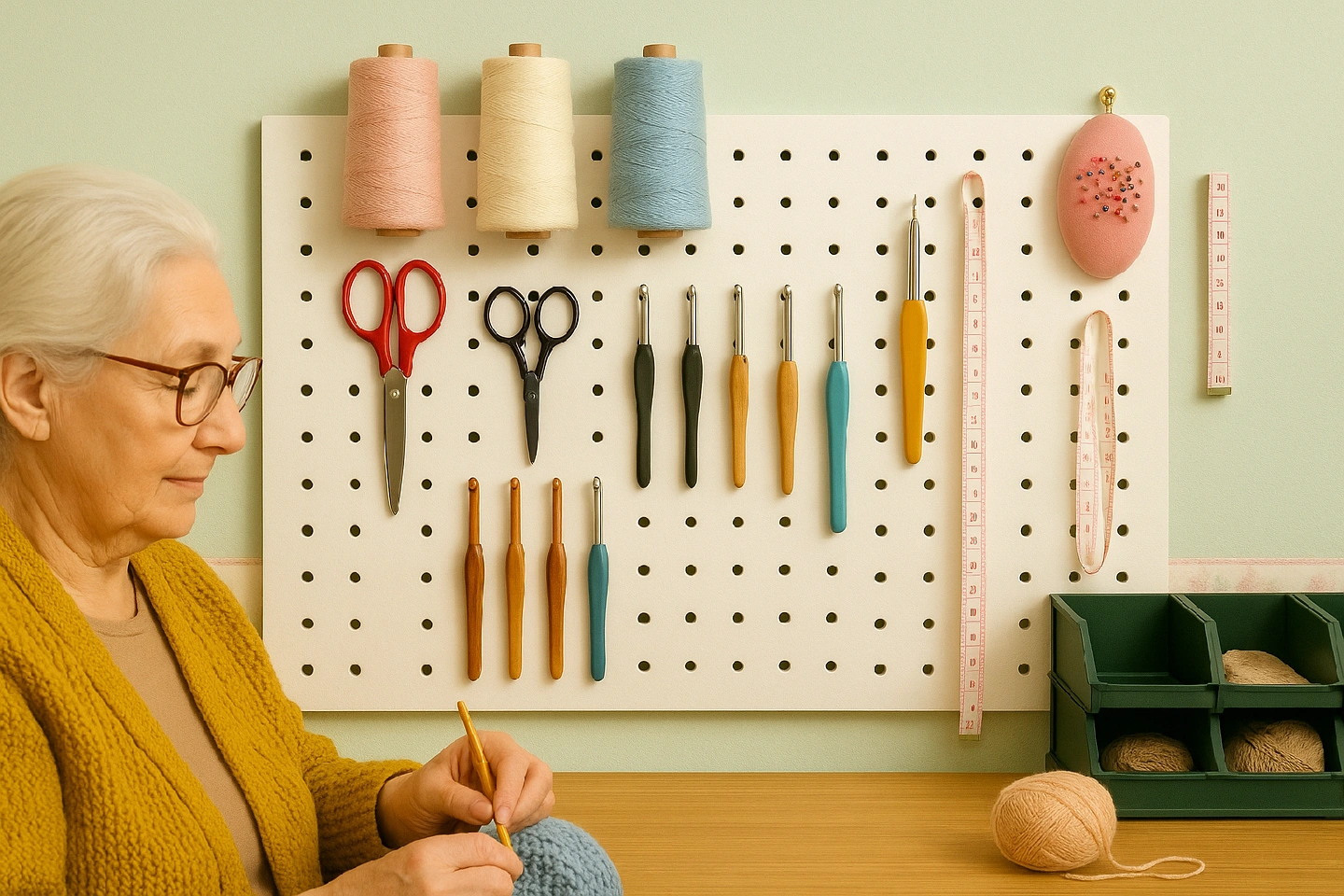 a piece of pegboard to organize your collection of knitting and crochet supplies. Great for anyone who enjoys these crafts!