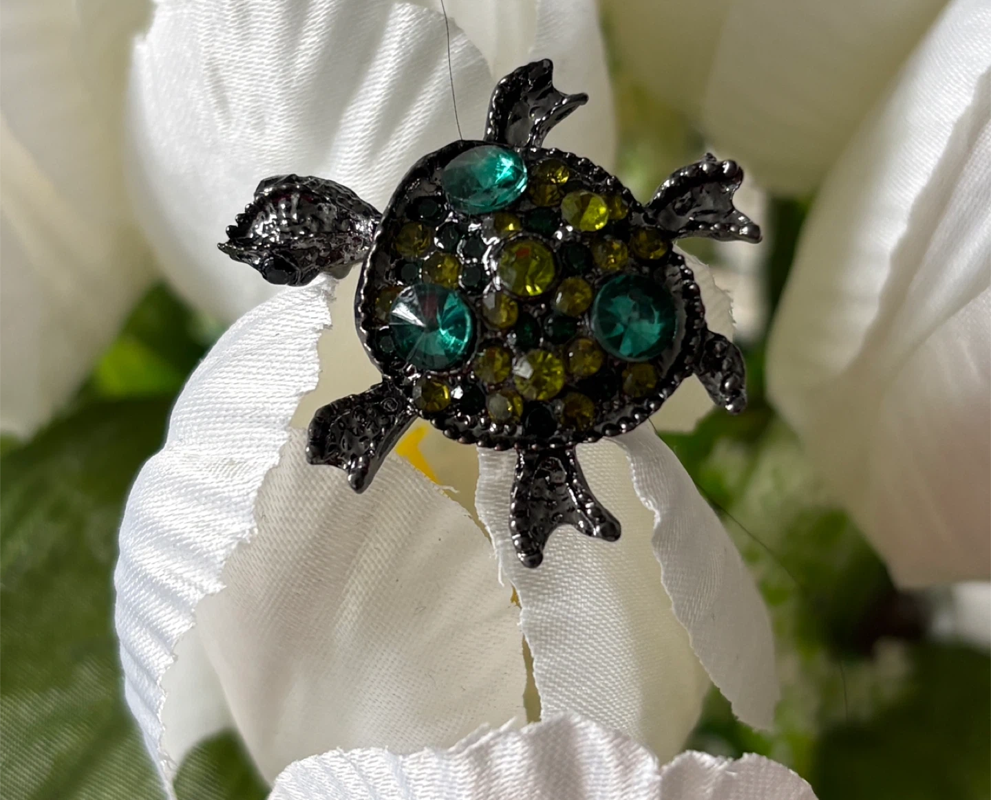 A cute charming turtle-shaped brooch pin adorned with green and bluish rhinestones. Its dark metal finish gives it a vintage look. It's small, perfect for adding a touch of whimsy to a jacket or scarf.