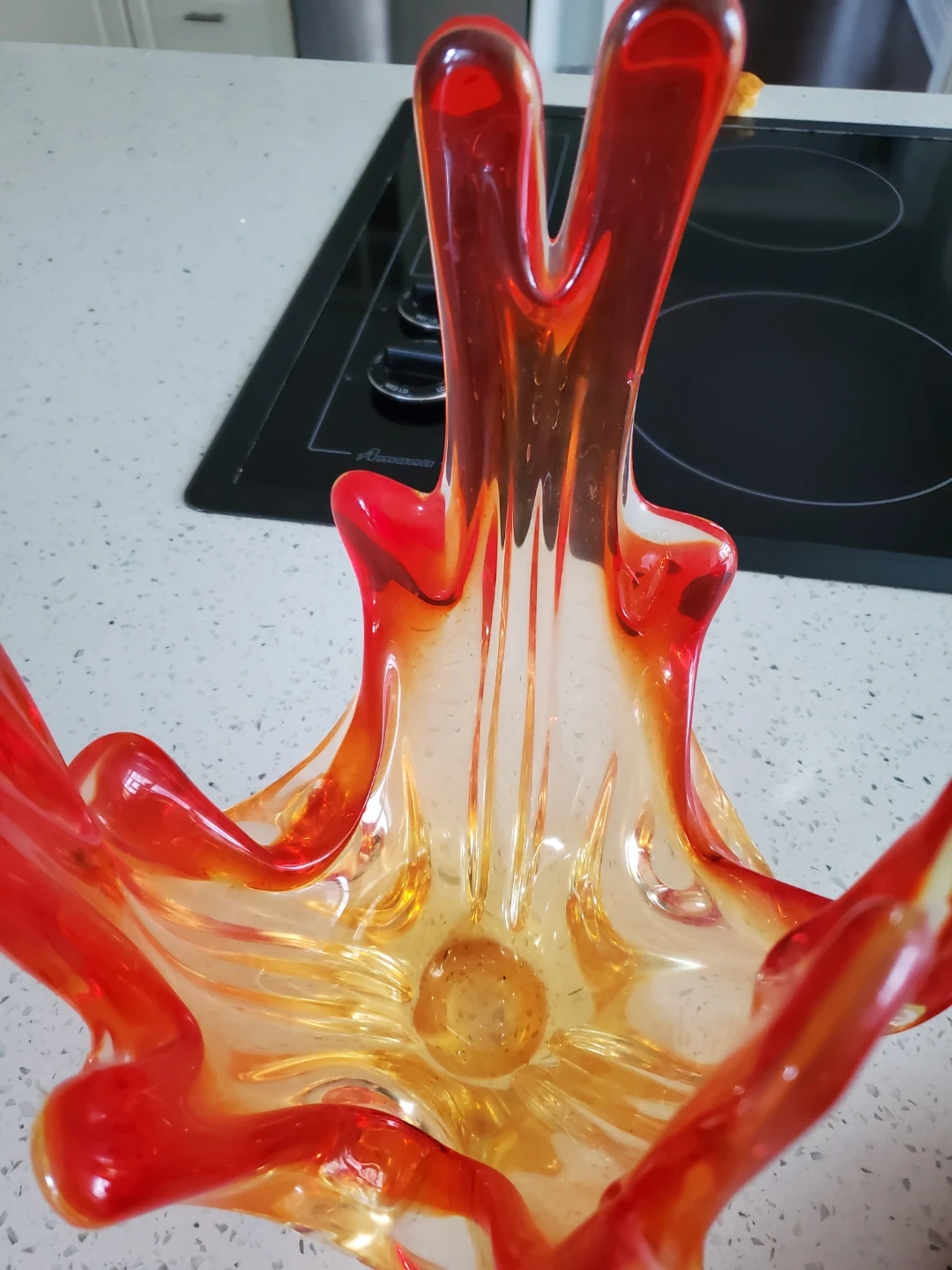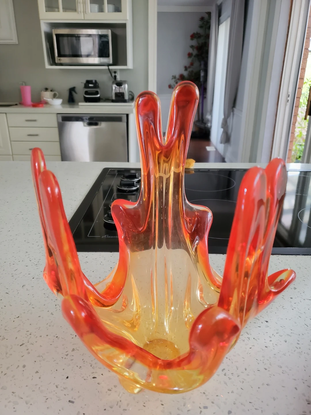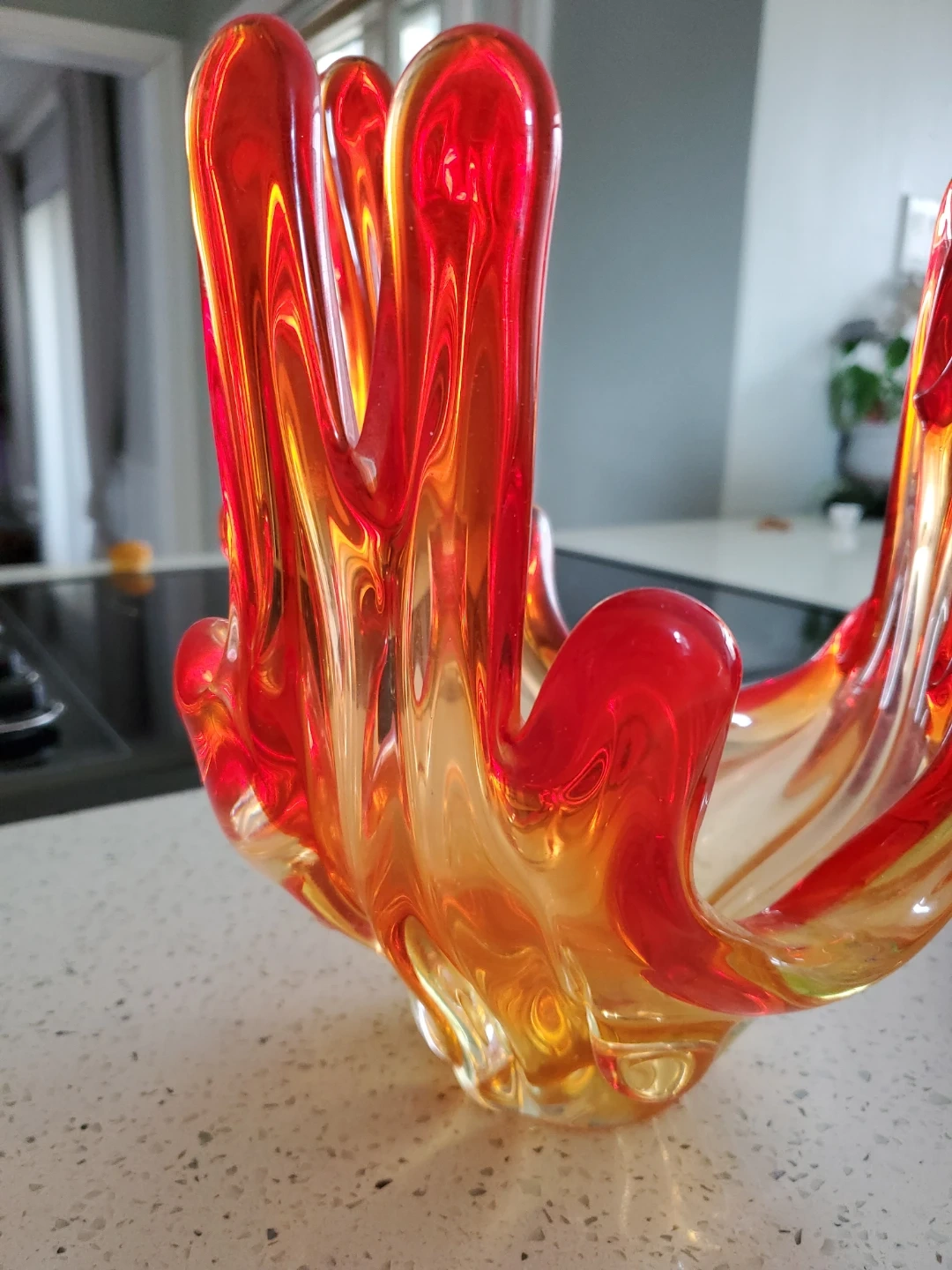 Gorgeous art glass vase with a vibrant red and orange swirl design. It's made of blown glass and has a unique, sculptural shape. This piece makes a stunning centrepiece!