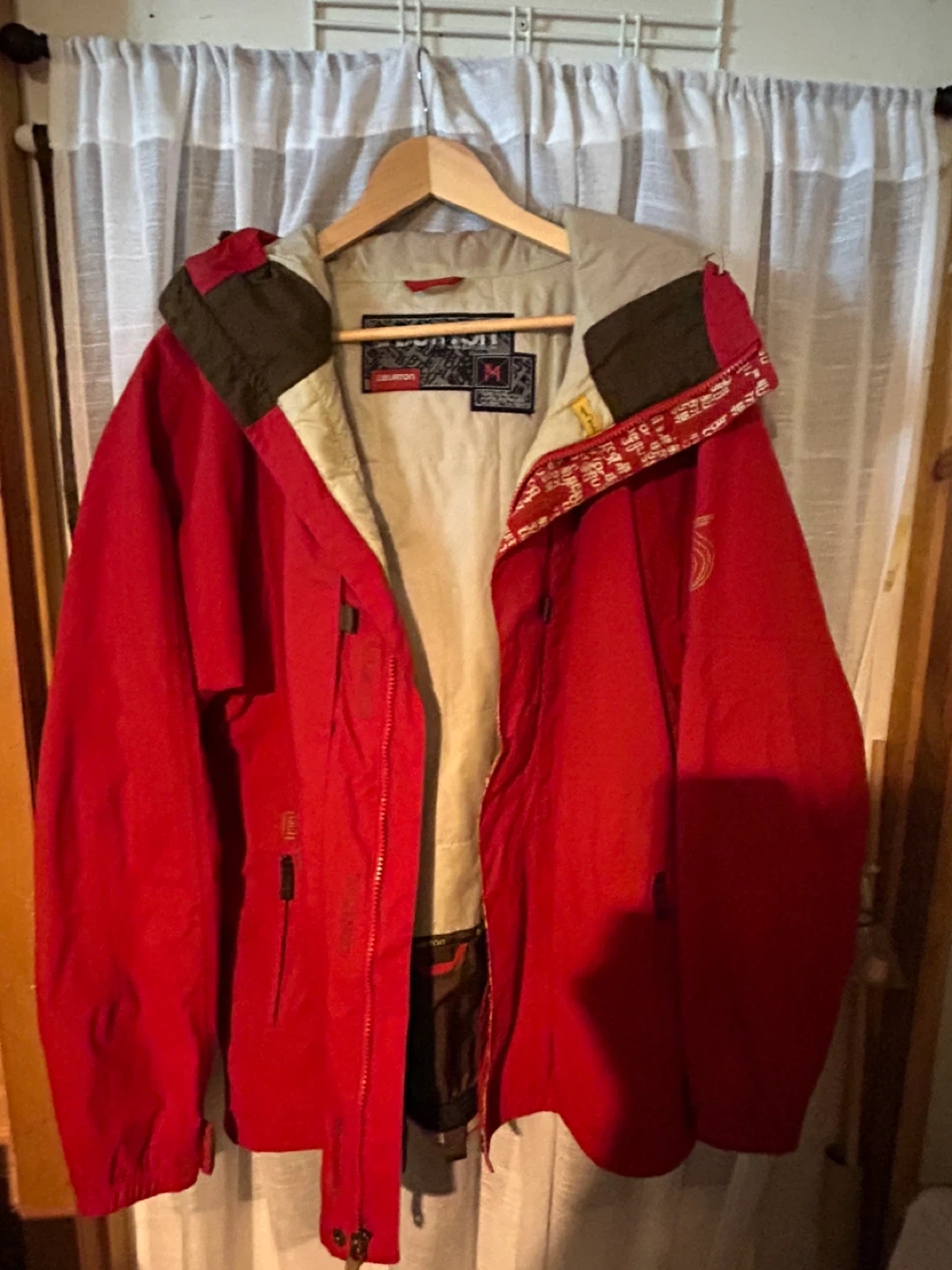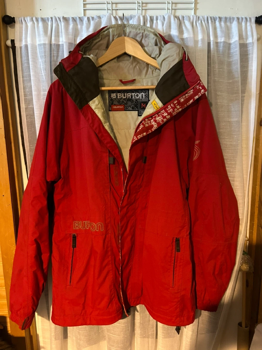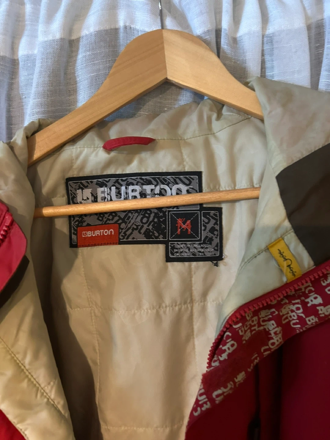 This is a red Burton snowboard jacket. It's a size medium and features a hood for extra warmth. It's great for hitting the slopes!