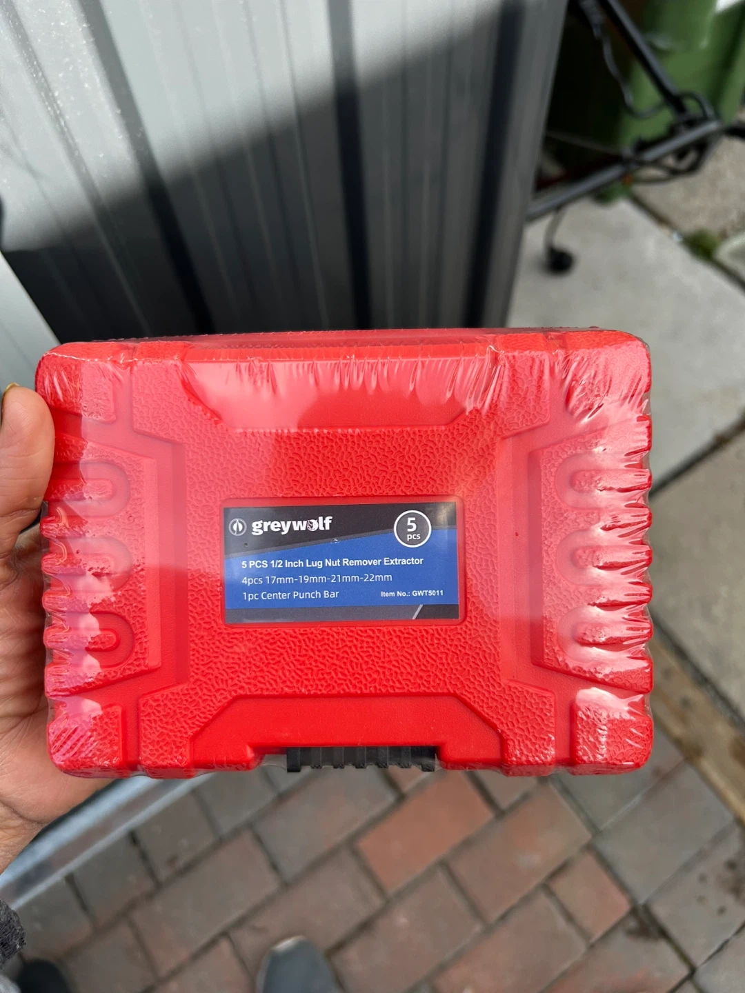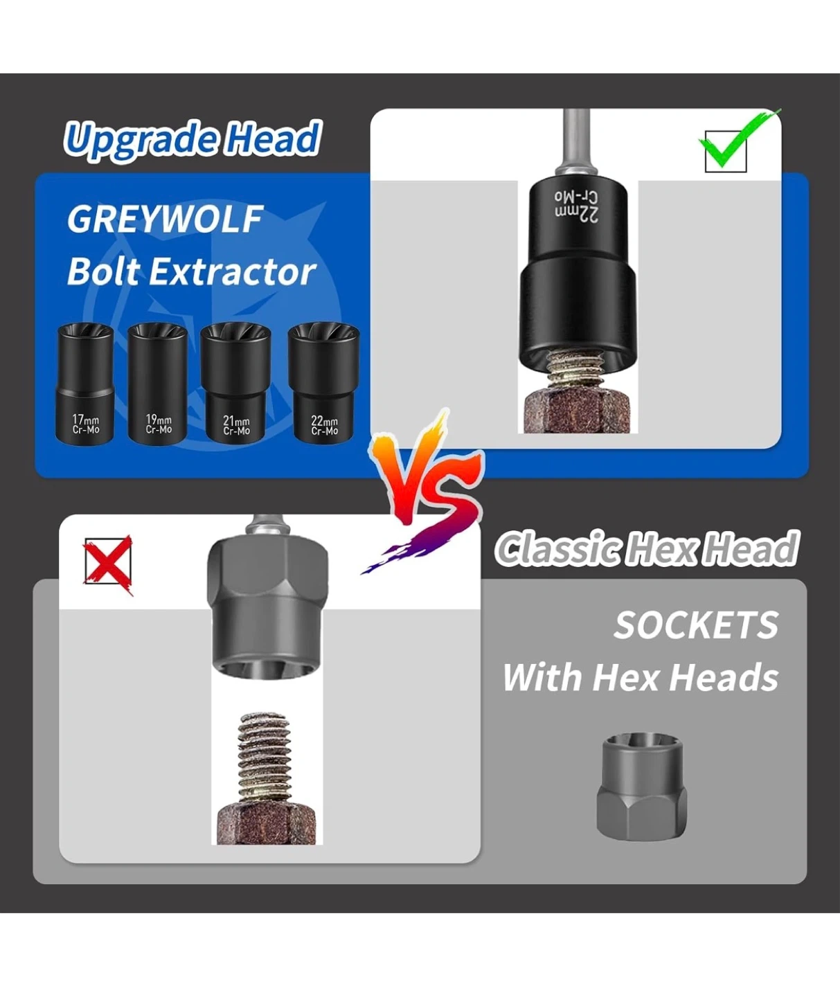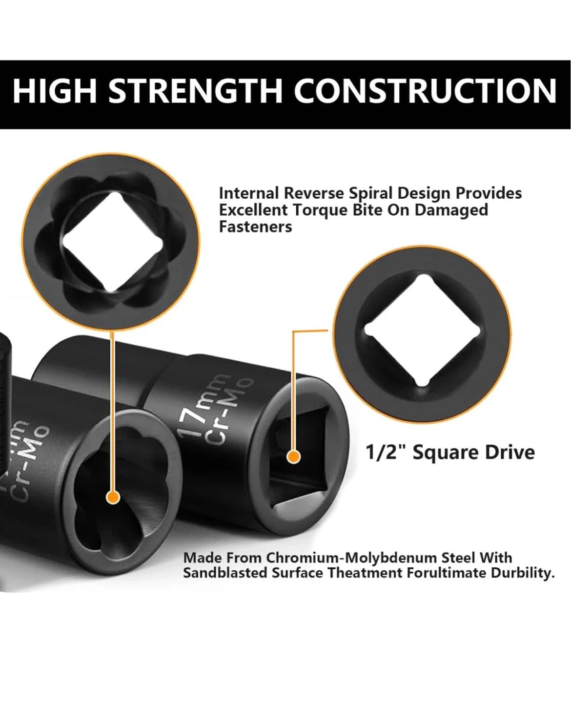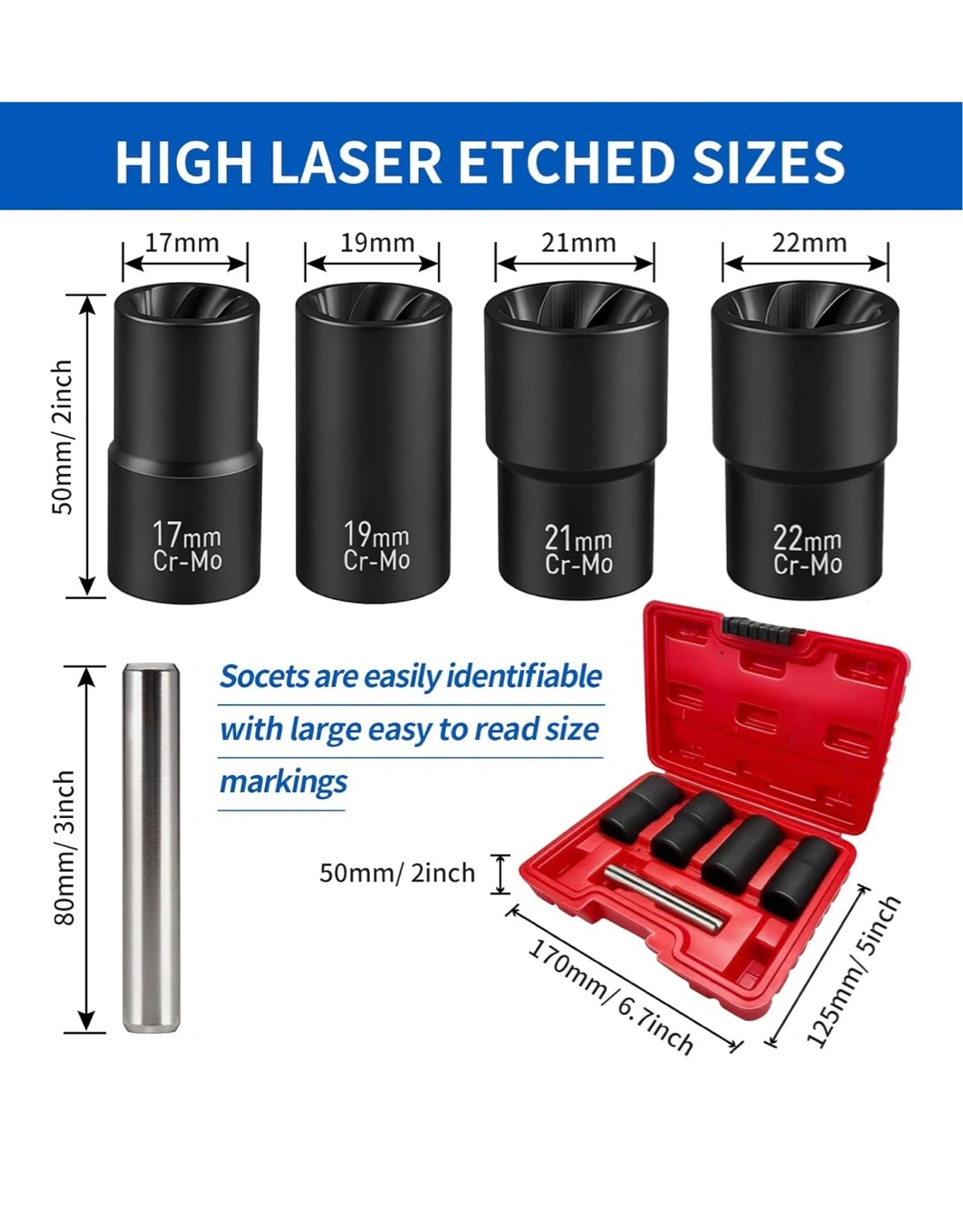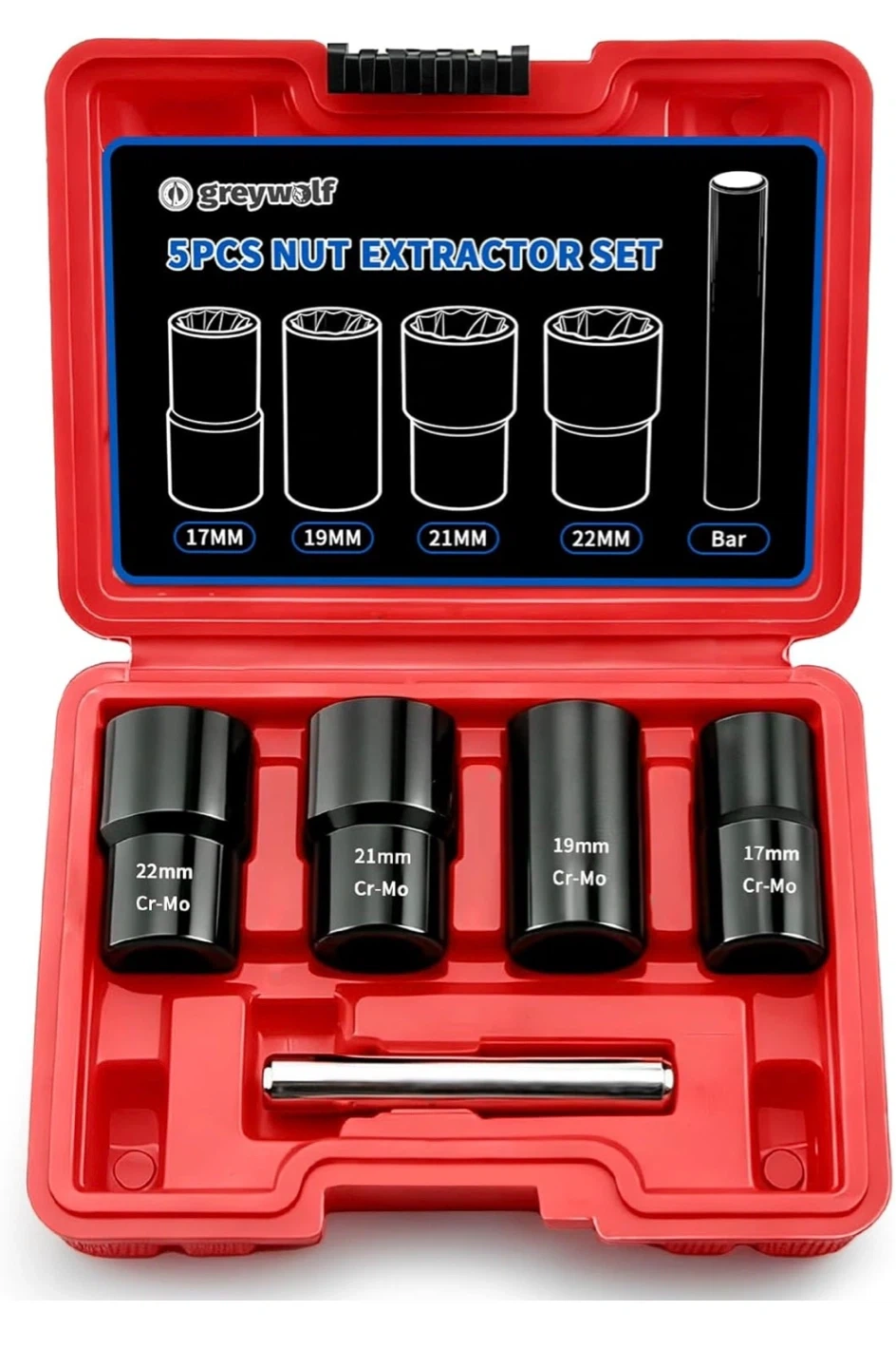 This Greywolf nut extractor set includes four sockets (17mm, 19mm, 21mm, 22mm) and one bar. Sockets are made from Cr-Mo steel with an internal reverse spiral design for gripping damaged fasteners. 1/2" square drive size.