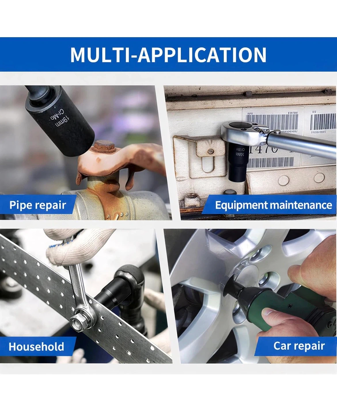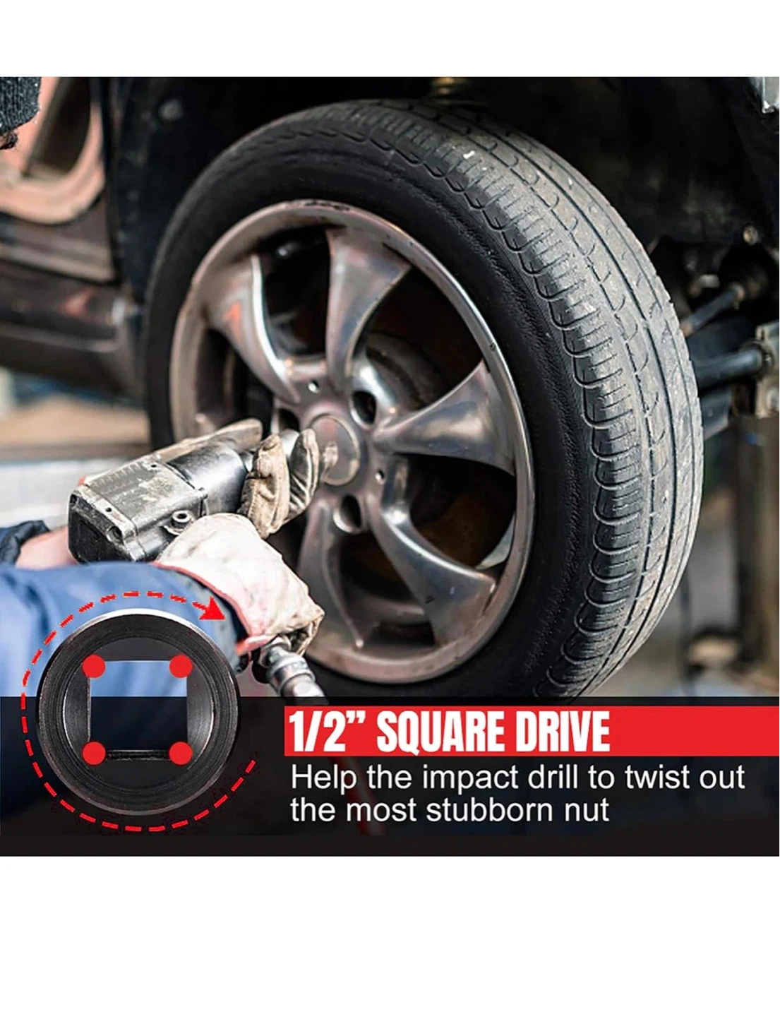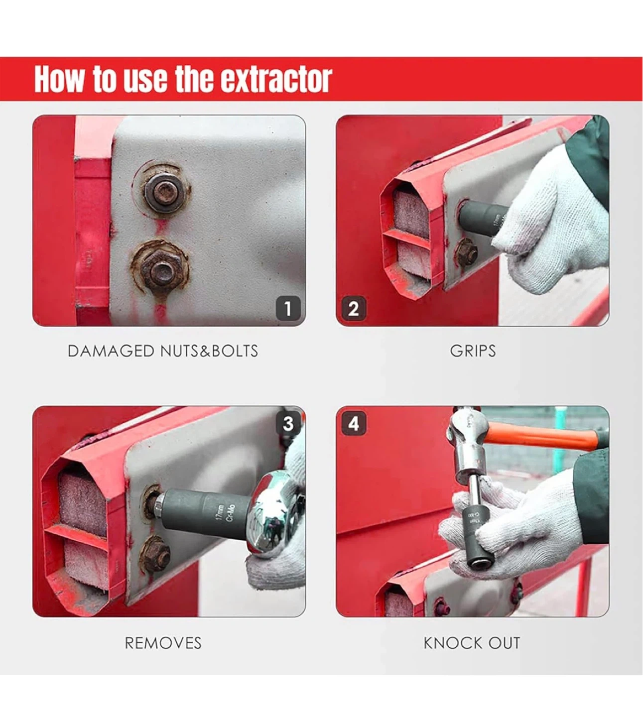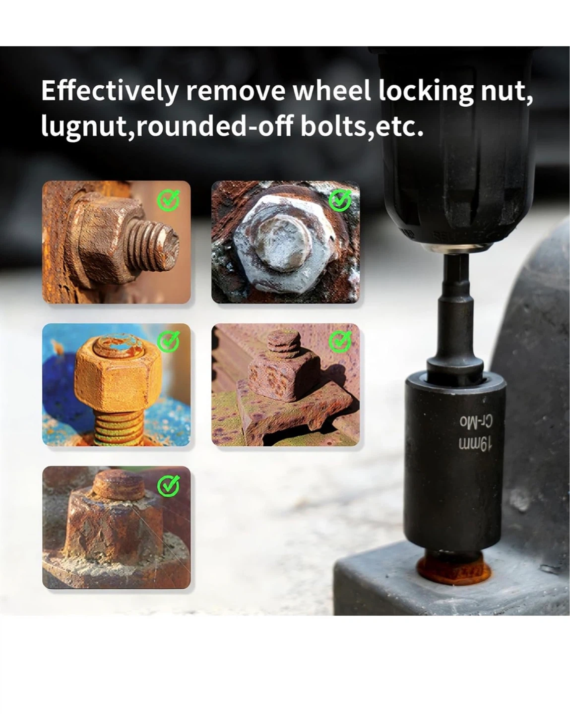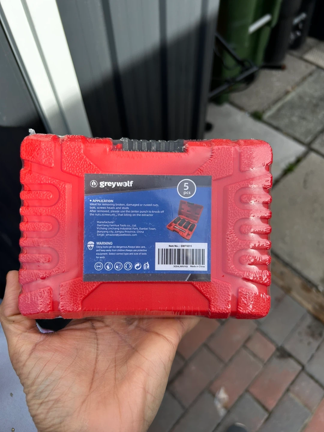 This Greywolf nut extractor set includes four sockets (17mm, 19mm, 21mm, 22mm) and one bar. Sockets are made from Cr-Mo steel with an internal reverse spiral design for gripping damaged fasteners. 1/2" square drive size.