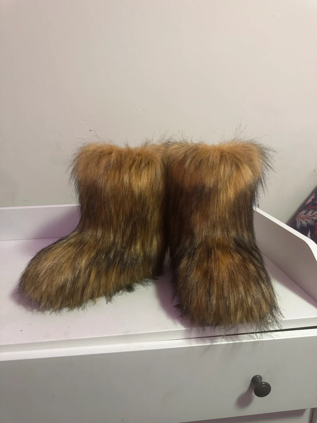 These fuzzy boots are covered in soft, faux fur. They're a warm brown colour with darker tips for a natural look. Keep your feet cosy!