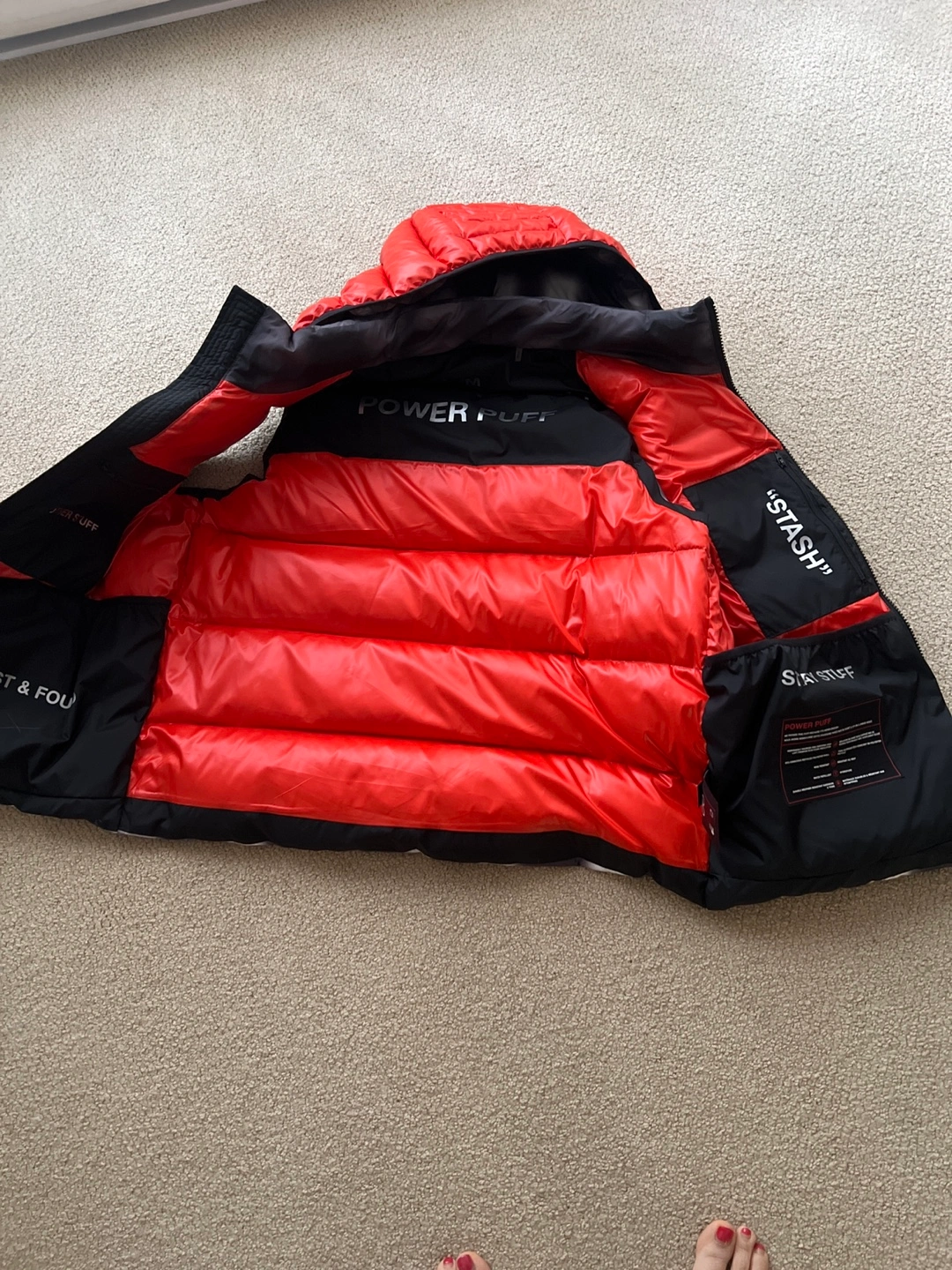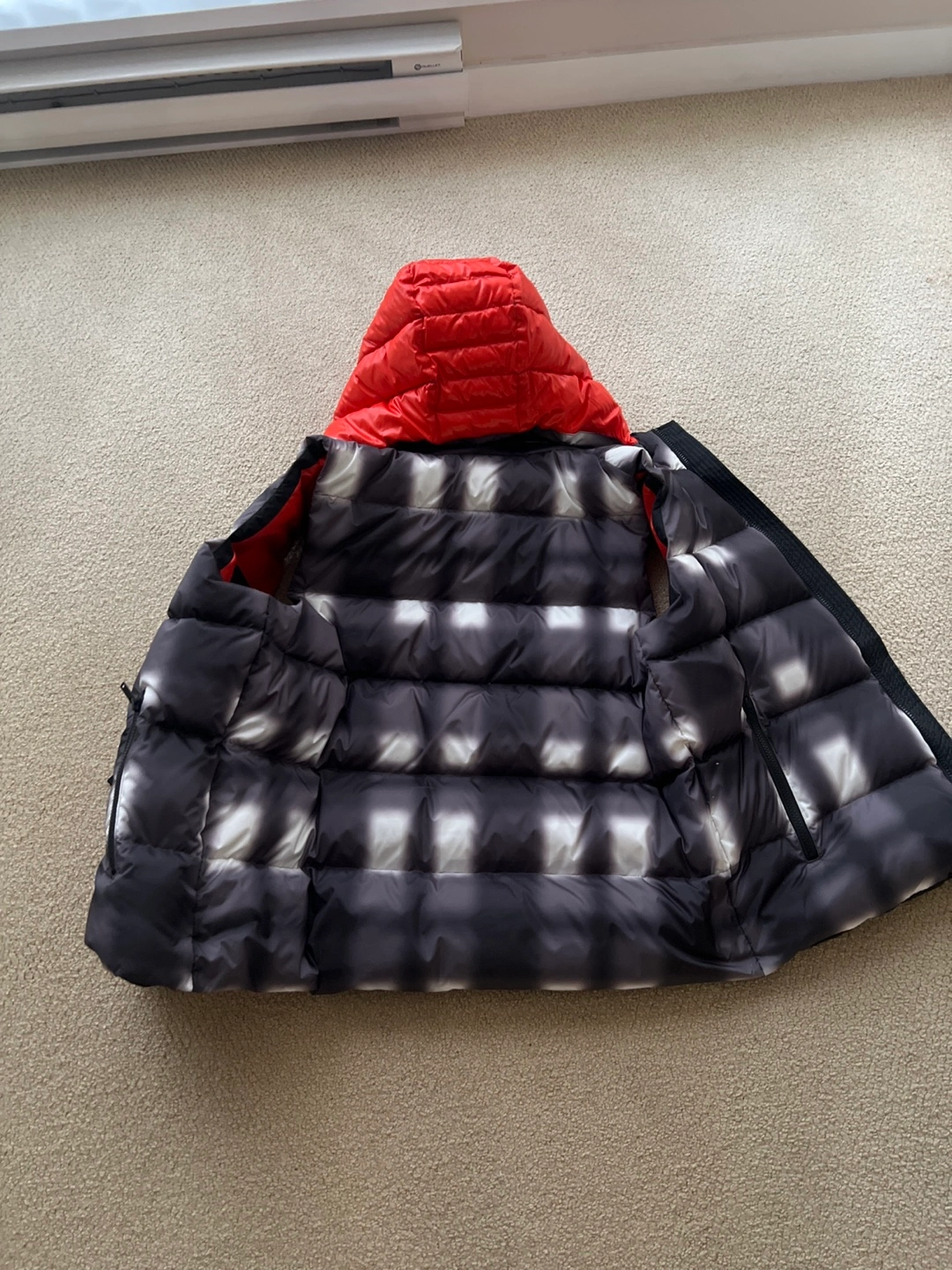 164puffer vest. Black and white checkered pattern. Red interior. Attached hood. Zipper closure. Side pockets. Excellent condition.