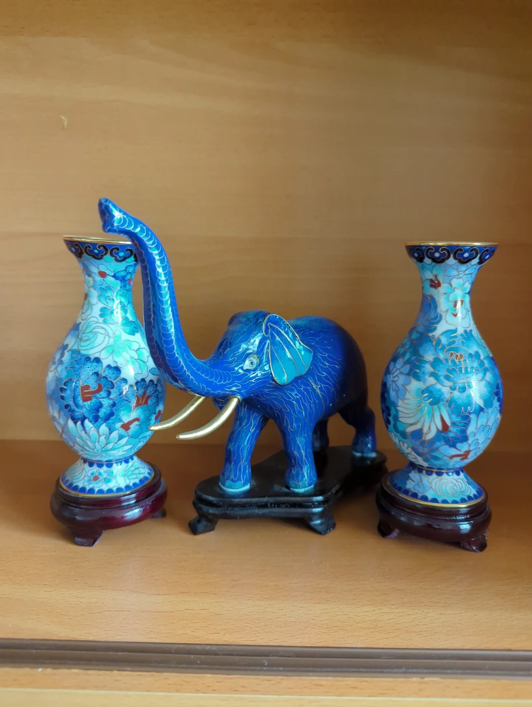 A vibrant blue elephant figurine with gold tusks, presented on a dark base. It's flanked by two matching Cloisonné vases, decorated with intricate floral patterns in blues, reds, and greens. These pieces add a touch of traditional artistry to any shelf. They're beautiful decorative items roughly 6" tall.
