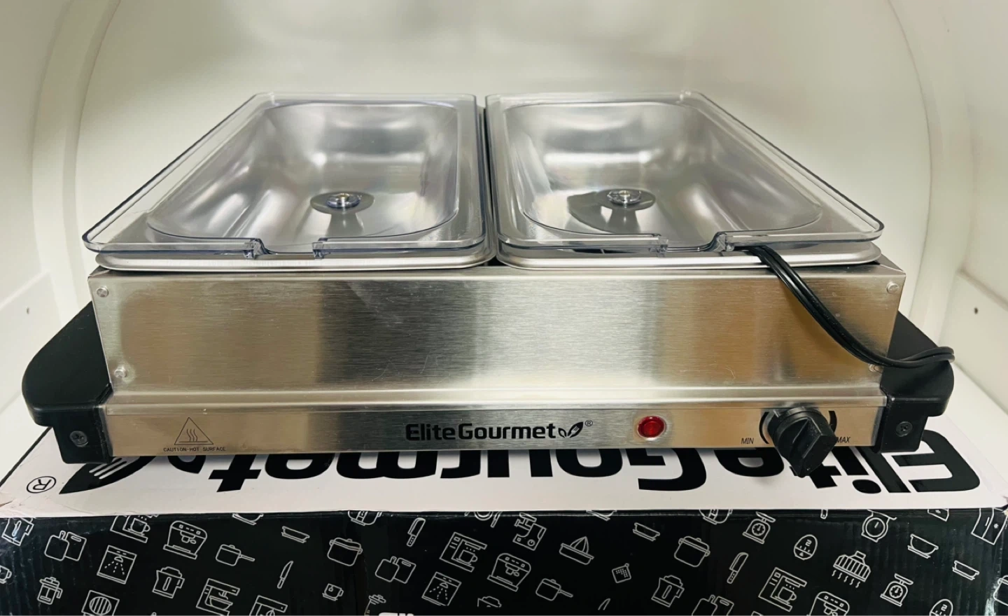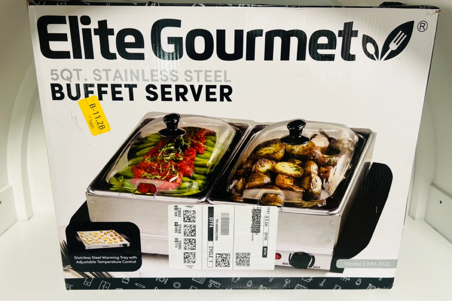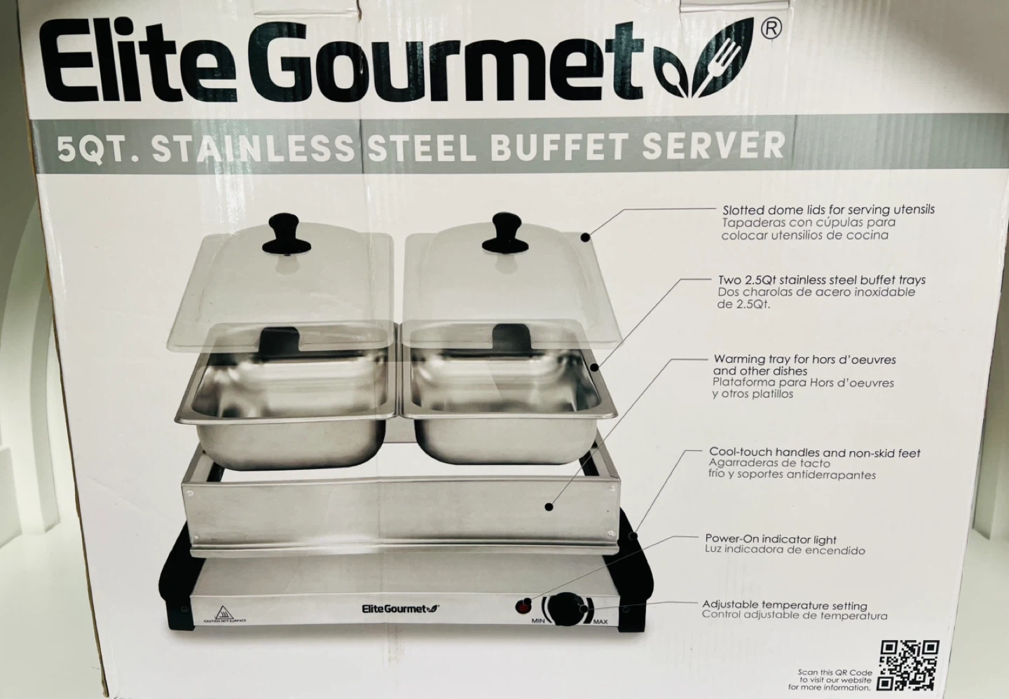 Keep your food warm with this Elite Gourmet 5QT. stainless steel buffet server. It comes with two 2.5QT stainless steel buffet trays and slotted dome lids for serving utensils. Features cool-touch handles, non-skid feet, and adjustable temperature setting.