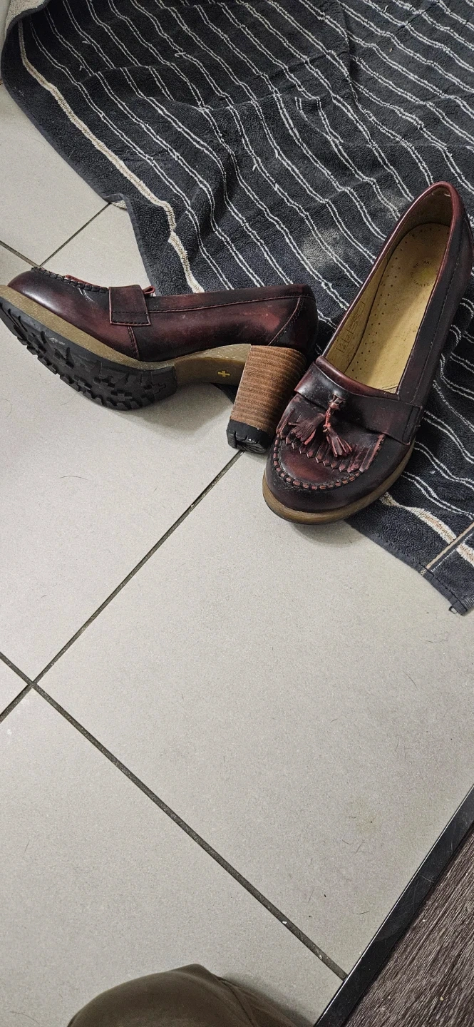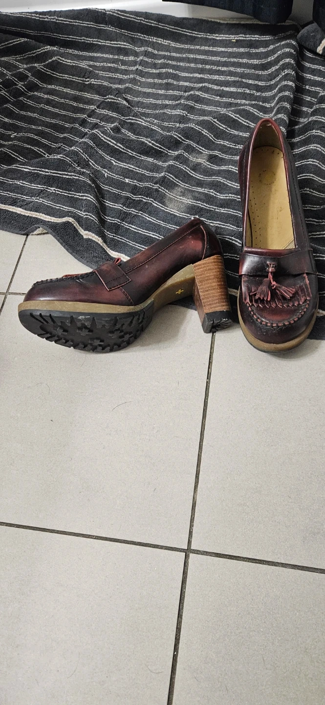 These Dr. Martens heeled loafers are a deep burgundy colour. They feature a tassel detail on the front and a comfortable block heel. Leather material.