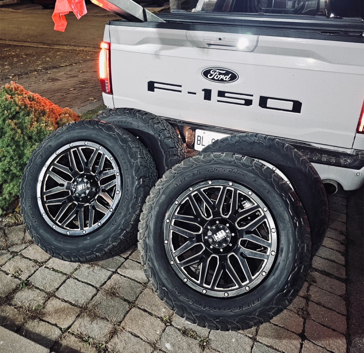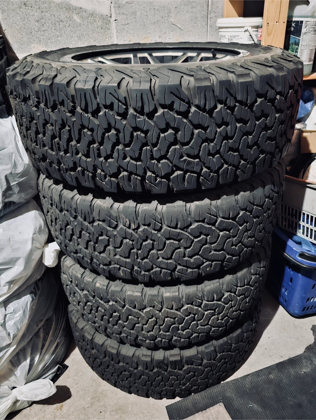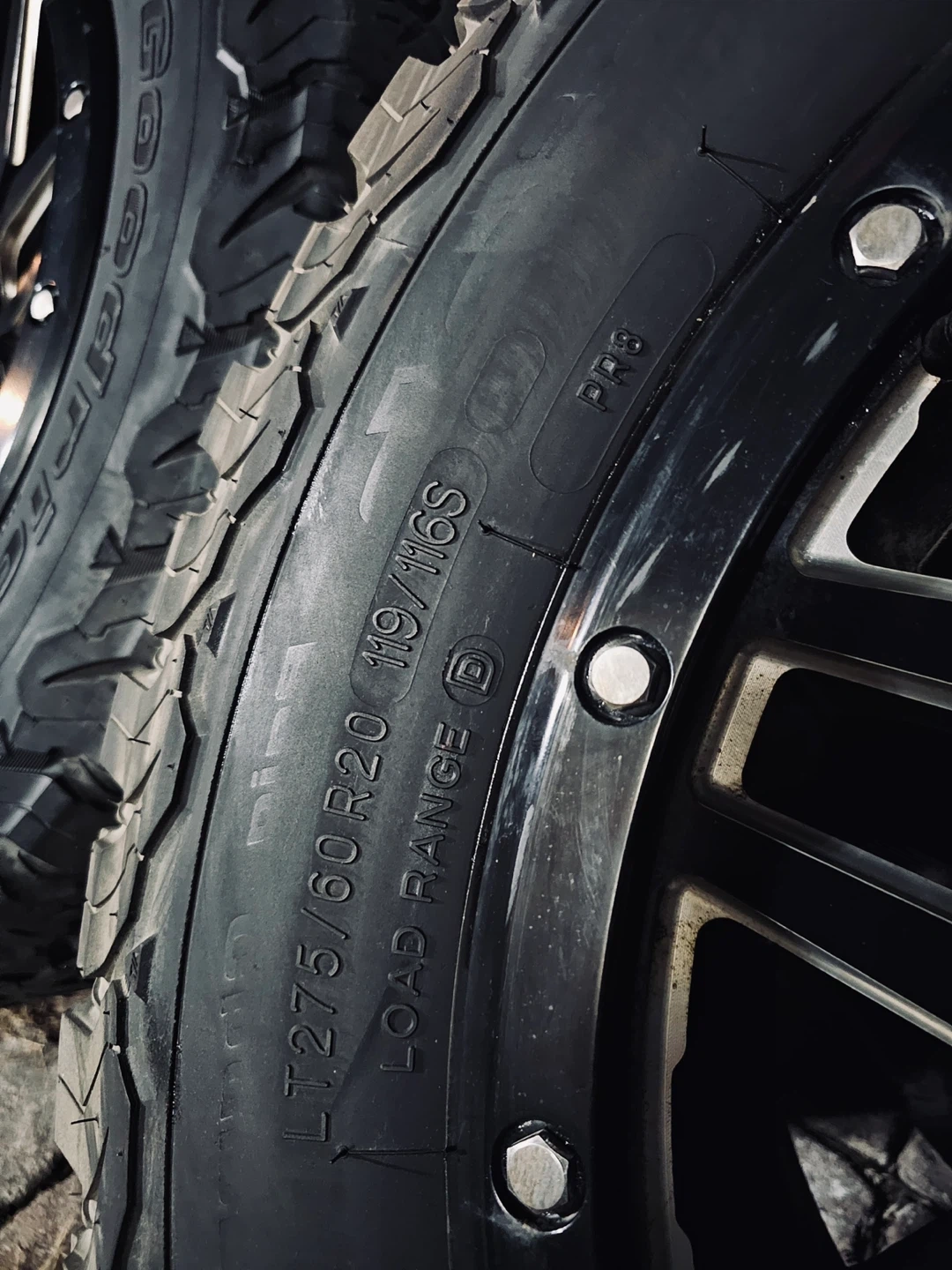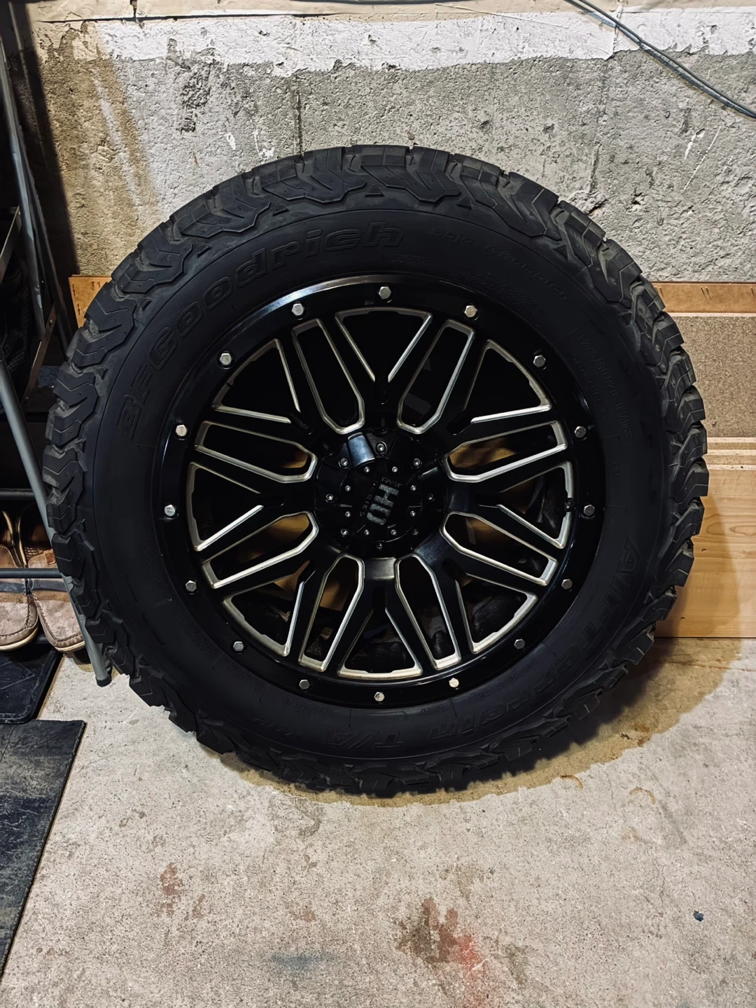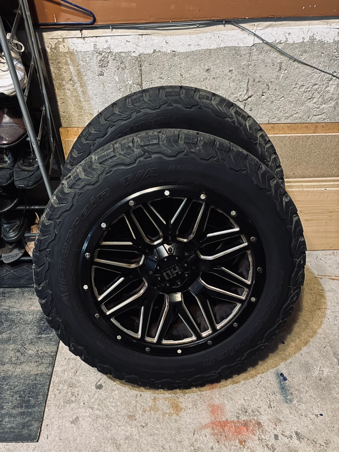 22Set of 4 BFGoodrich All-Terrain T/A KO2 tires, size LT275/60R20 119/116S Load Range D. Mounted on black Fuel alloy rims with silver accents. Tires are in mint condition, used minimally and stored indoors. Ideal for trucks and SUVs—excellent off-road grip, snow-rated, and built with CoreGard technology for tougher sidewalls. Manufactured in the USA, these are BFGoodrich’s most rugged all-terrain tires Price is negotiable