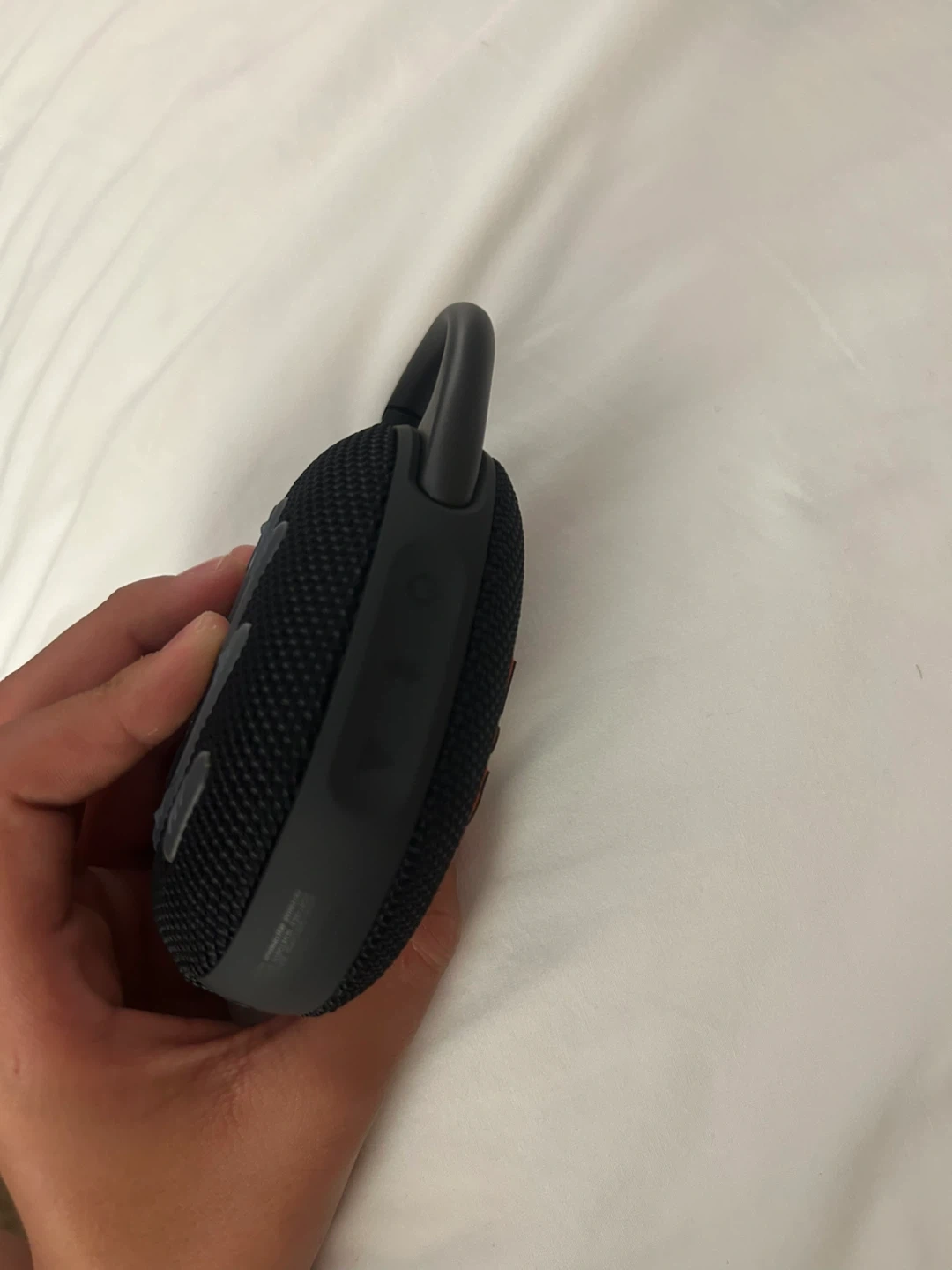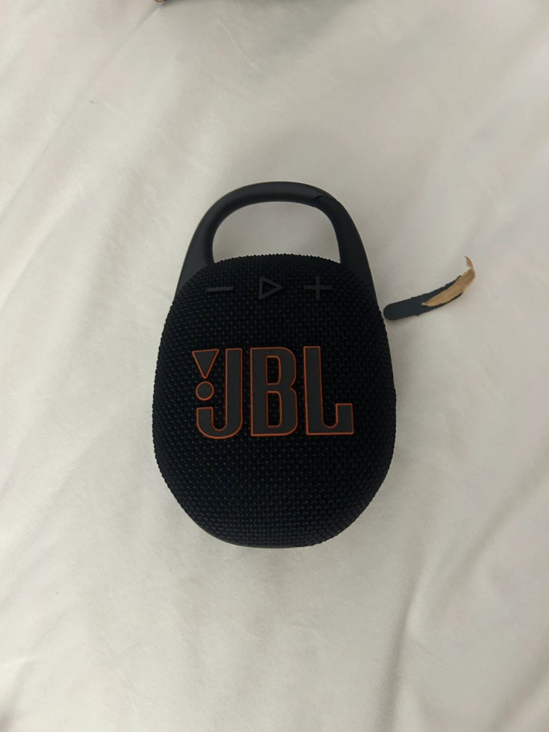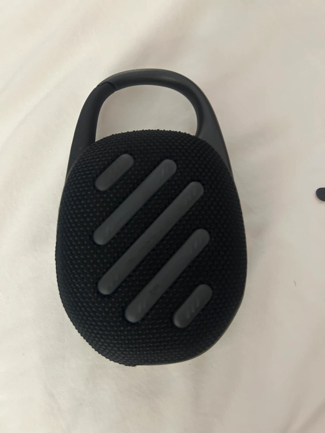 This is a black JBL Clip 5 portable Bluetooth speaker. It's waterproof and dustproof, offering up to 12 hours of playtime. It's great for outdoor use.