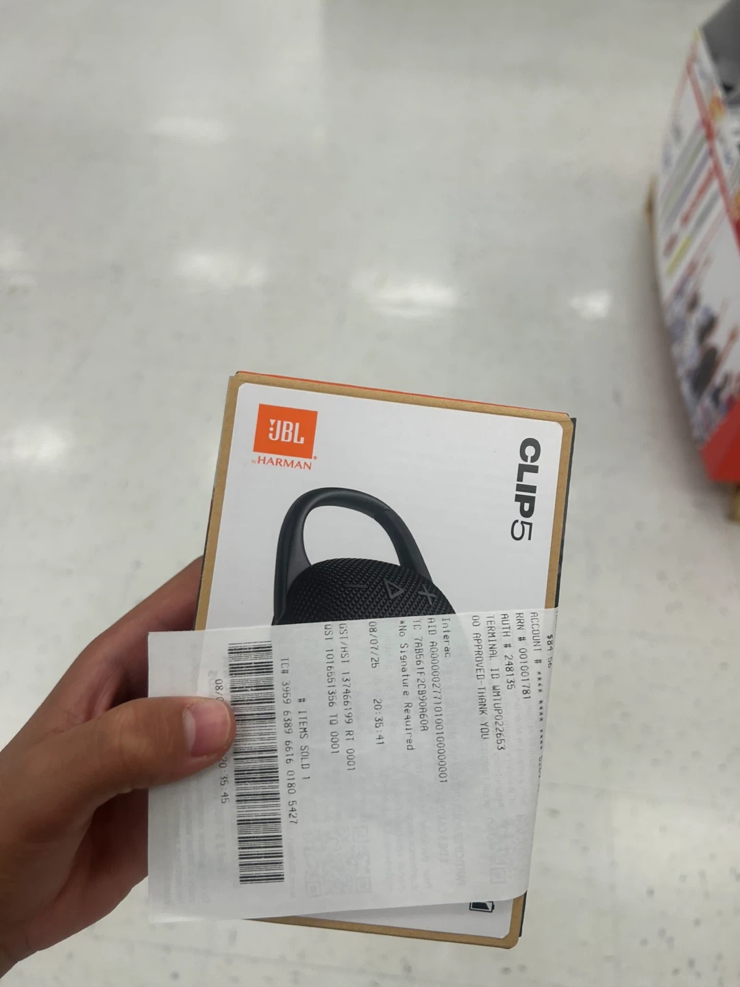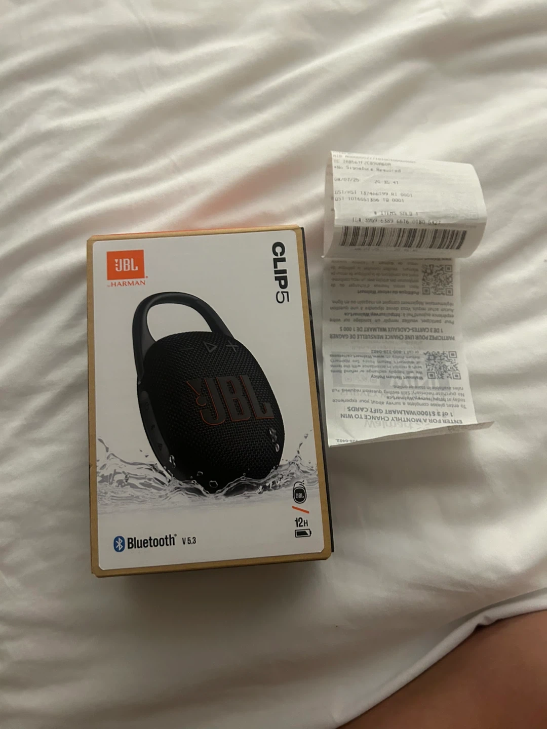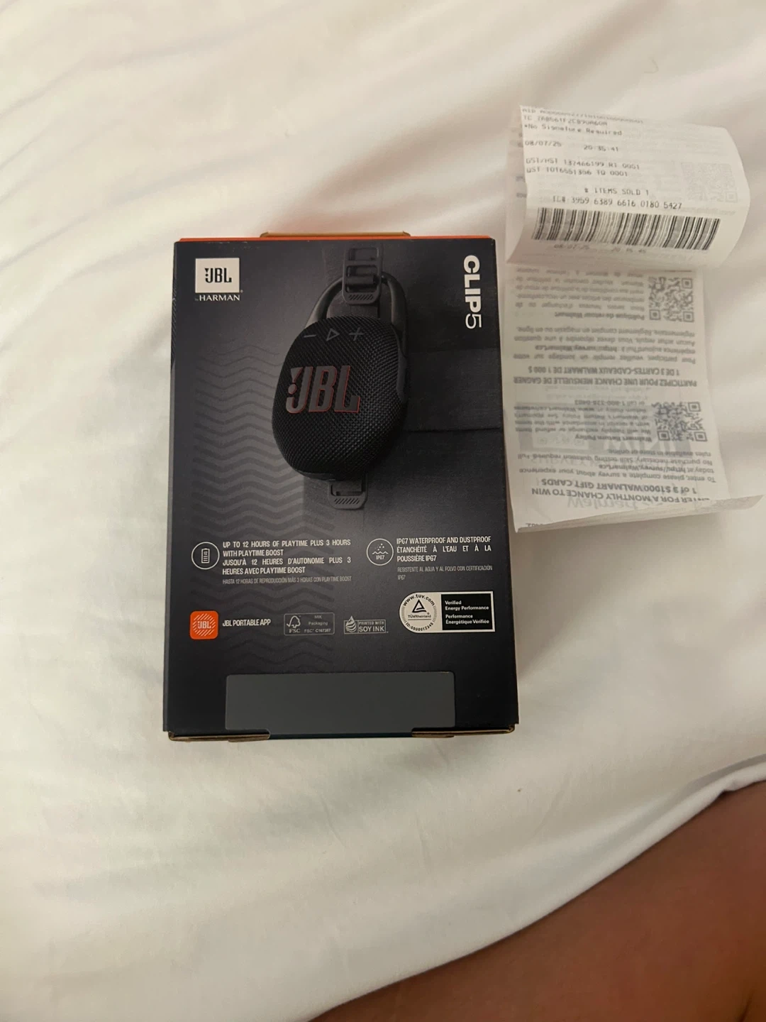This is a black JBL Clip 5 portable Bluetooth speaker. It's waterproof and dustproof, offering up to 12 hours of playtime. It's great for outdoor use.