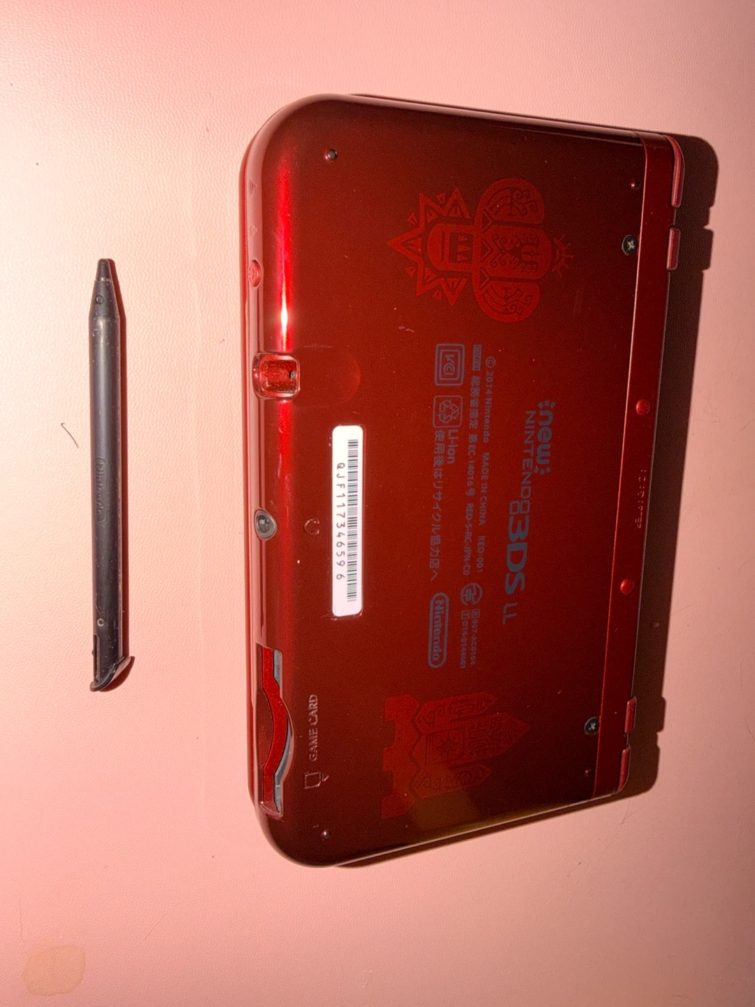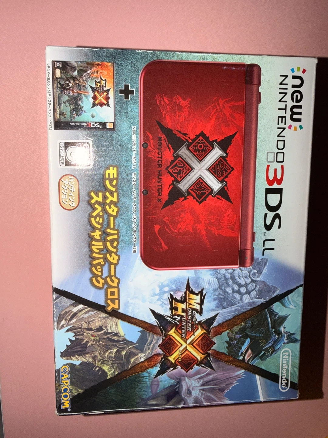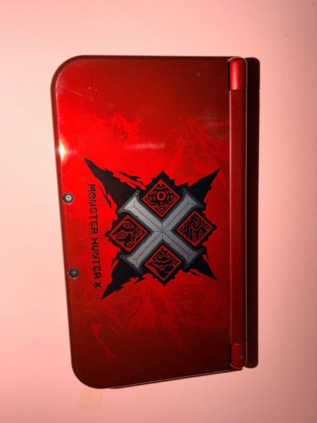 This is a red Nintendo New 3DS LL console with a Monster Hunter X design. It comes with a stylus and original box. The LL model offers a larger screen size.