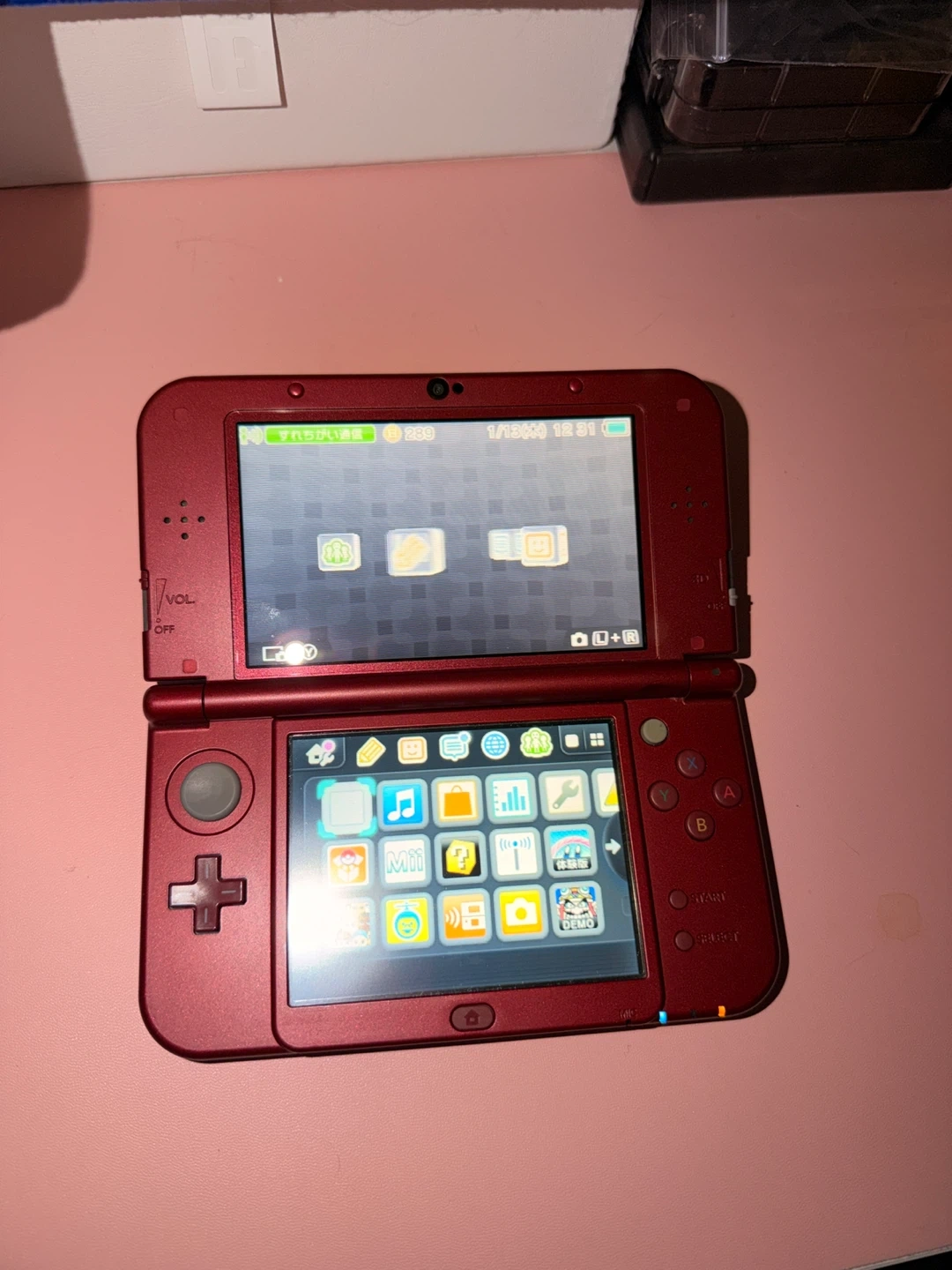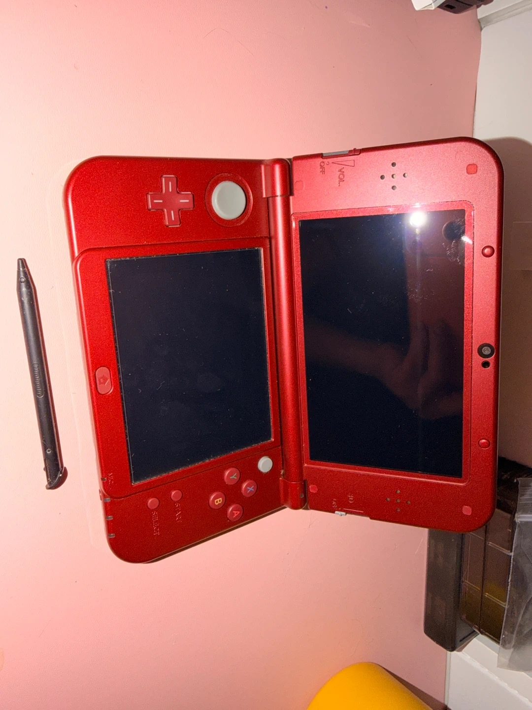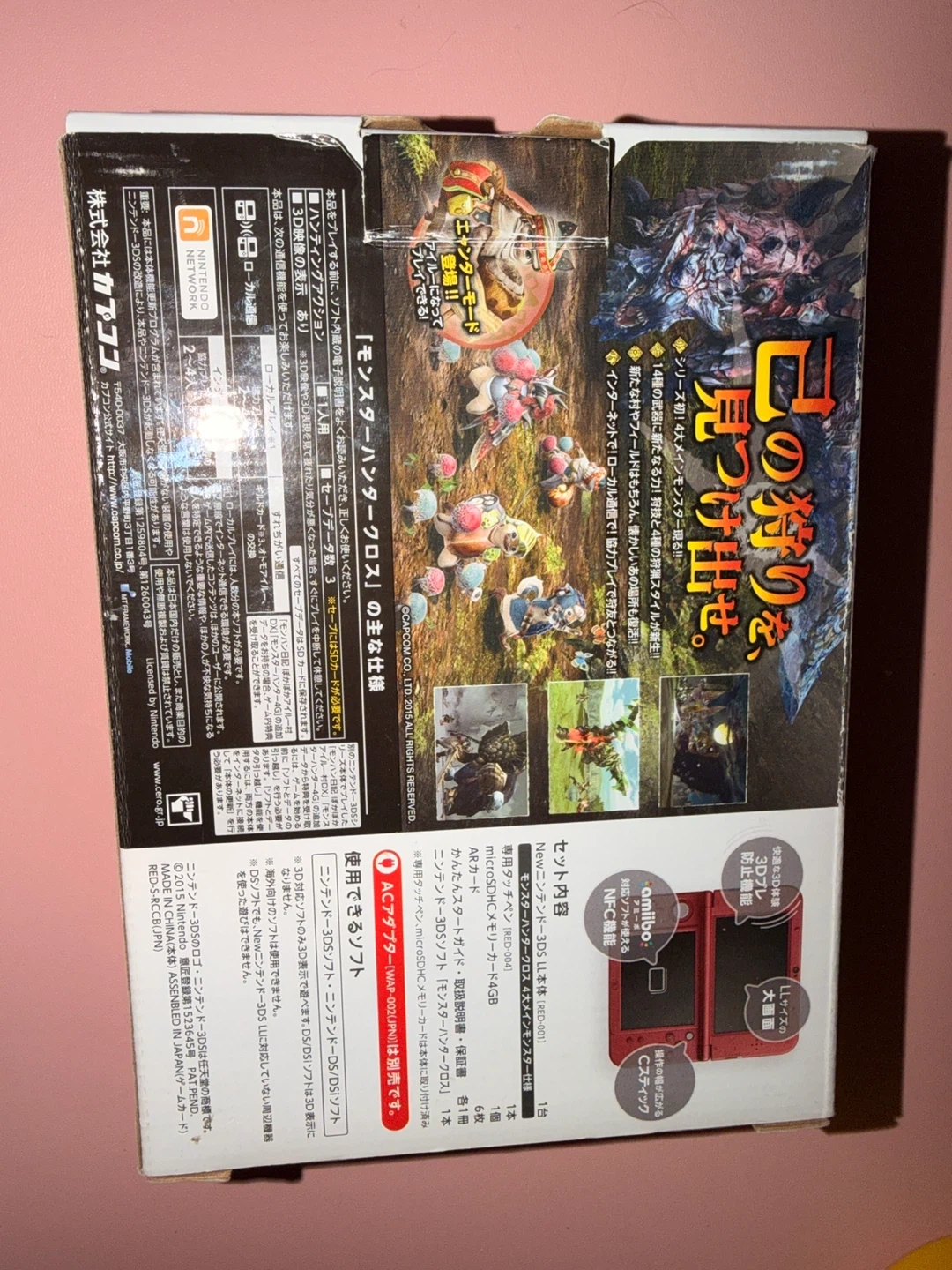 This is a red Nintendo New 3DS LL console with a Monster Hunter X design. It comes with a stylus and original box. The LL model offers a larger screen size.