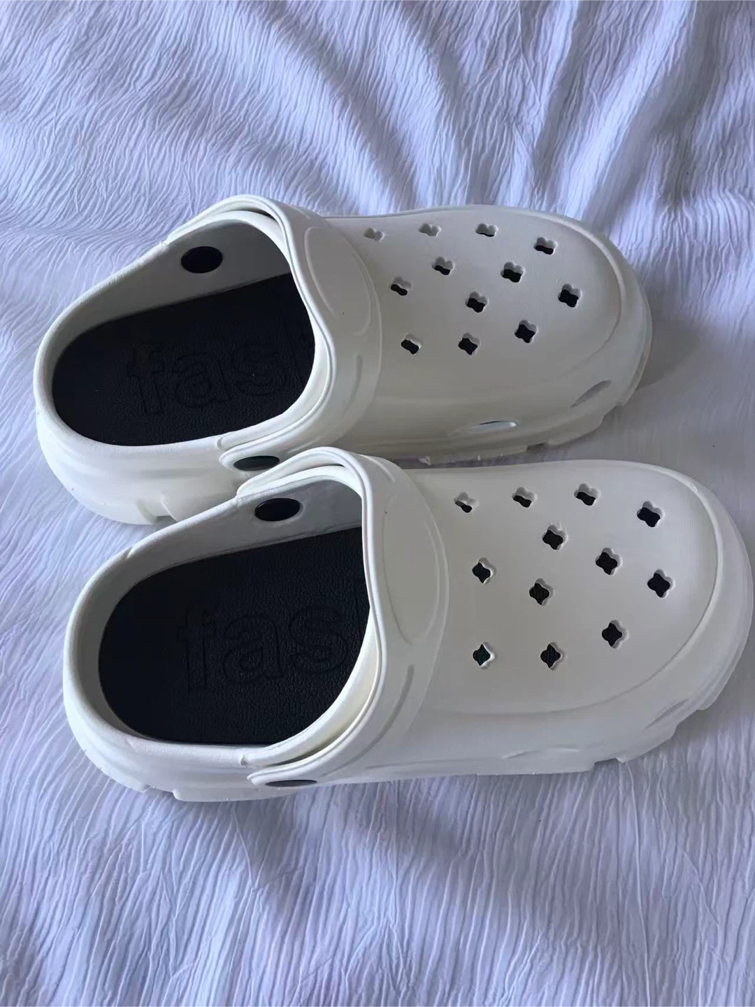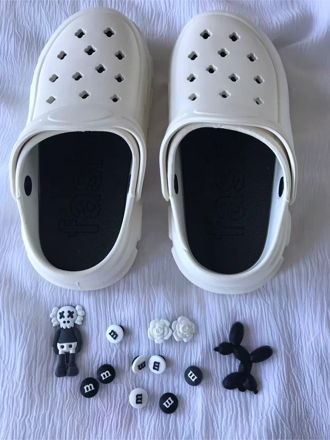 White clogs with black insoles and ventilation holes. Includes FREE assorted decorative charms: KAWS-inspired figure, balloon dog, roses, and letter 'm' emblems. These are a fun, customizable footwear option!