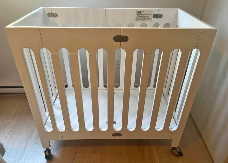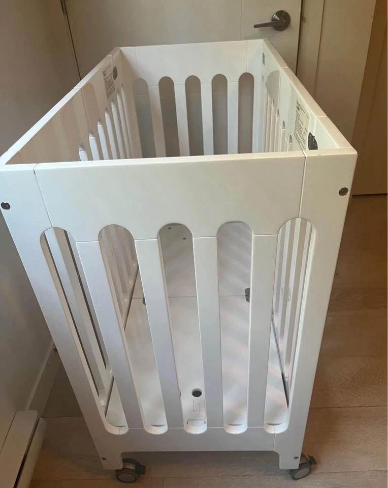 Pick it up in Langley. Comes with two sheets and crib mesh. Price for this mini crib new it’s 750.00us+ taxes. Patented fold and smaller footprint. Designed for next-to-parents-bed safe sleep. Sized for smaller spaces and room-to-room mobility, includes 4 lockable castor wheels which allow it to slide through a standard size door. Solid wood construction made from solid American beech wood sourced from sustainable forests. Baby safe, confirming to CPSC and ATSM standards, uses only low VOC baby safe finishes, formaldehyde-free and MDF free.
