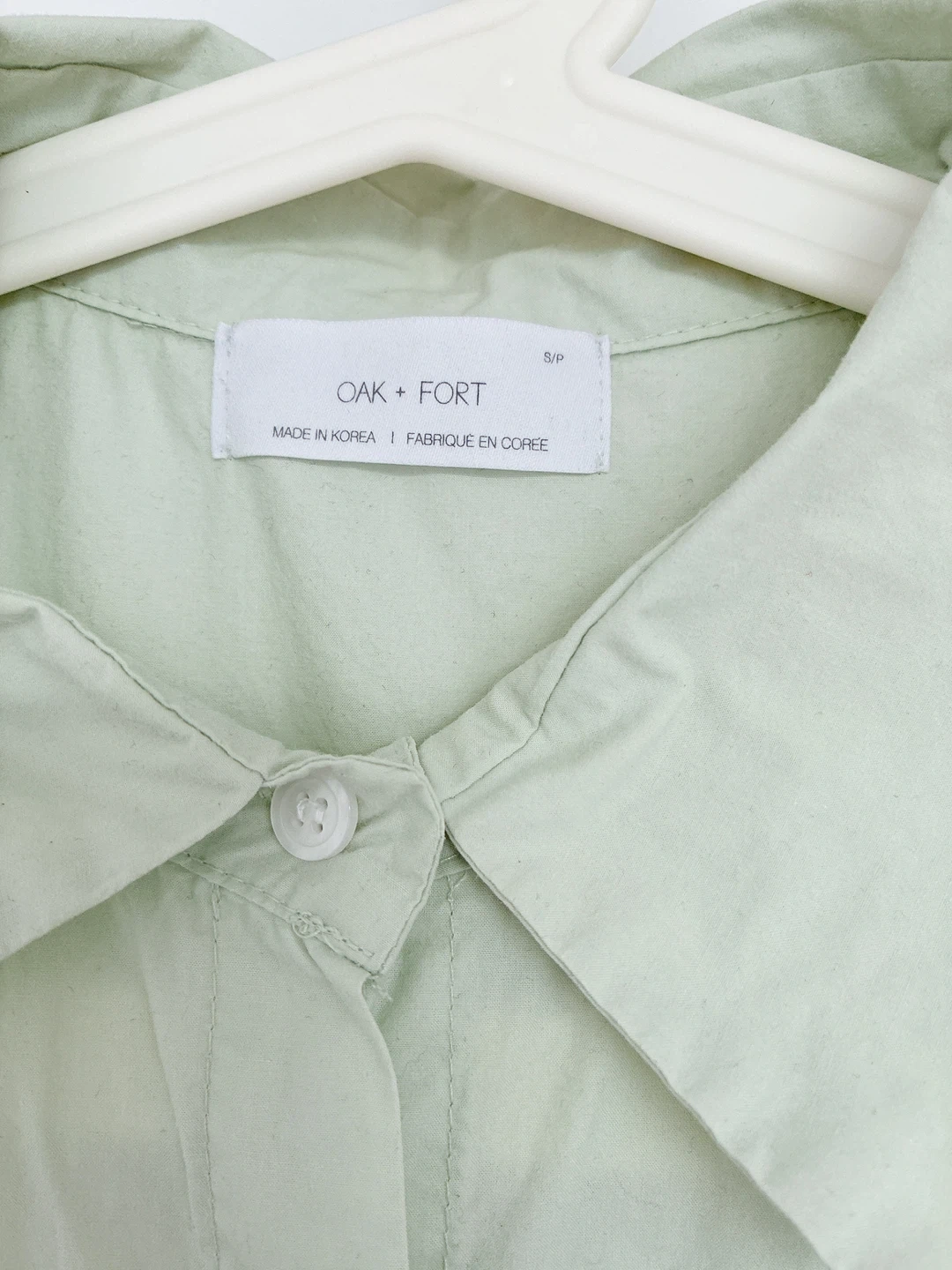 This is an Oak + Fort short sleeve shirt dress in a light green colour. It's a size S/P and made in Korea. It's a simple button-up style.