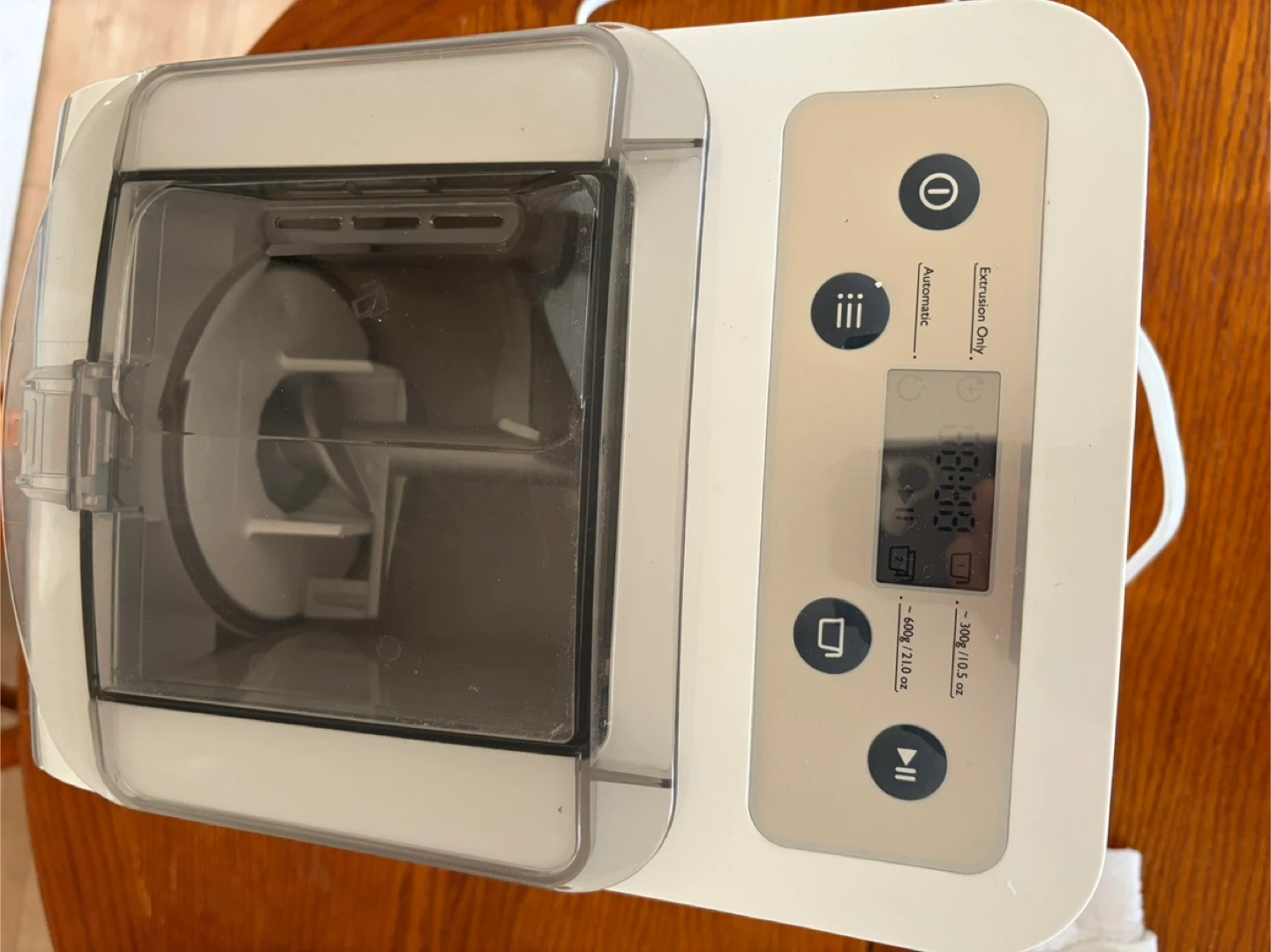 This Philips pasta maker is in great condition and works well. It comes with settings for extrusion only and automatic operation. You can make 300g (10.5 oz) of pasta at a time. It's easy to use for homemade pasta nights!