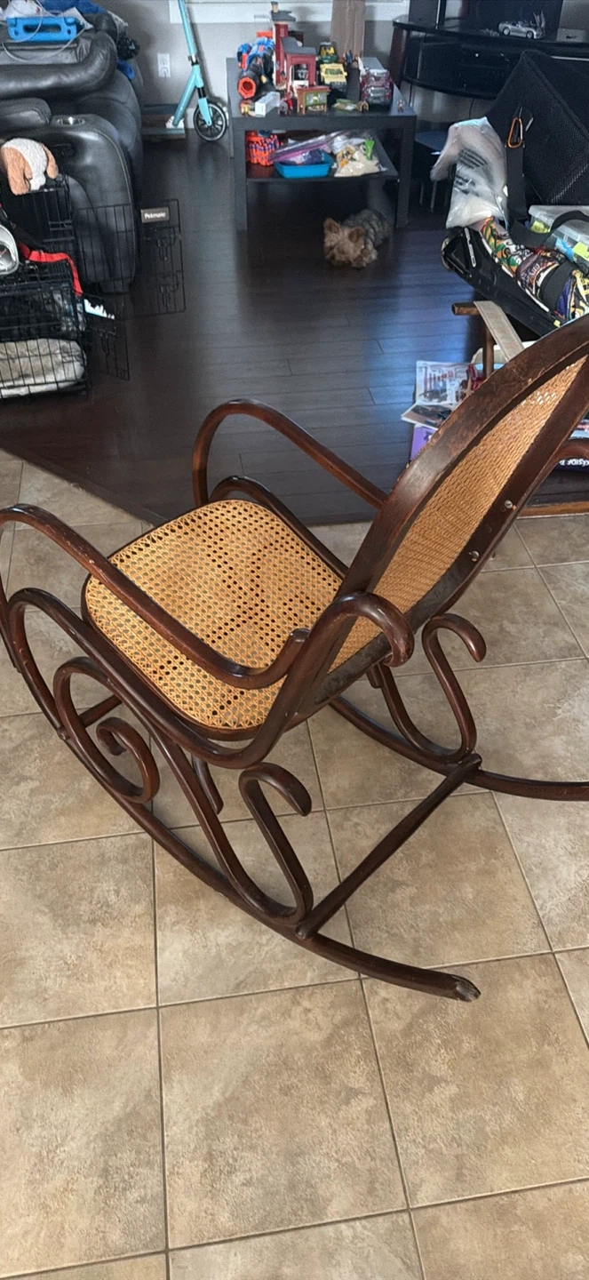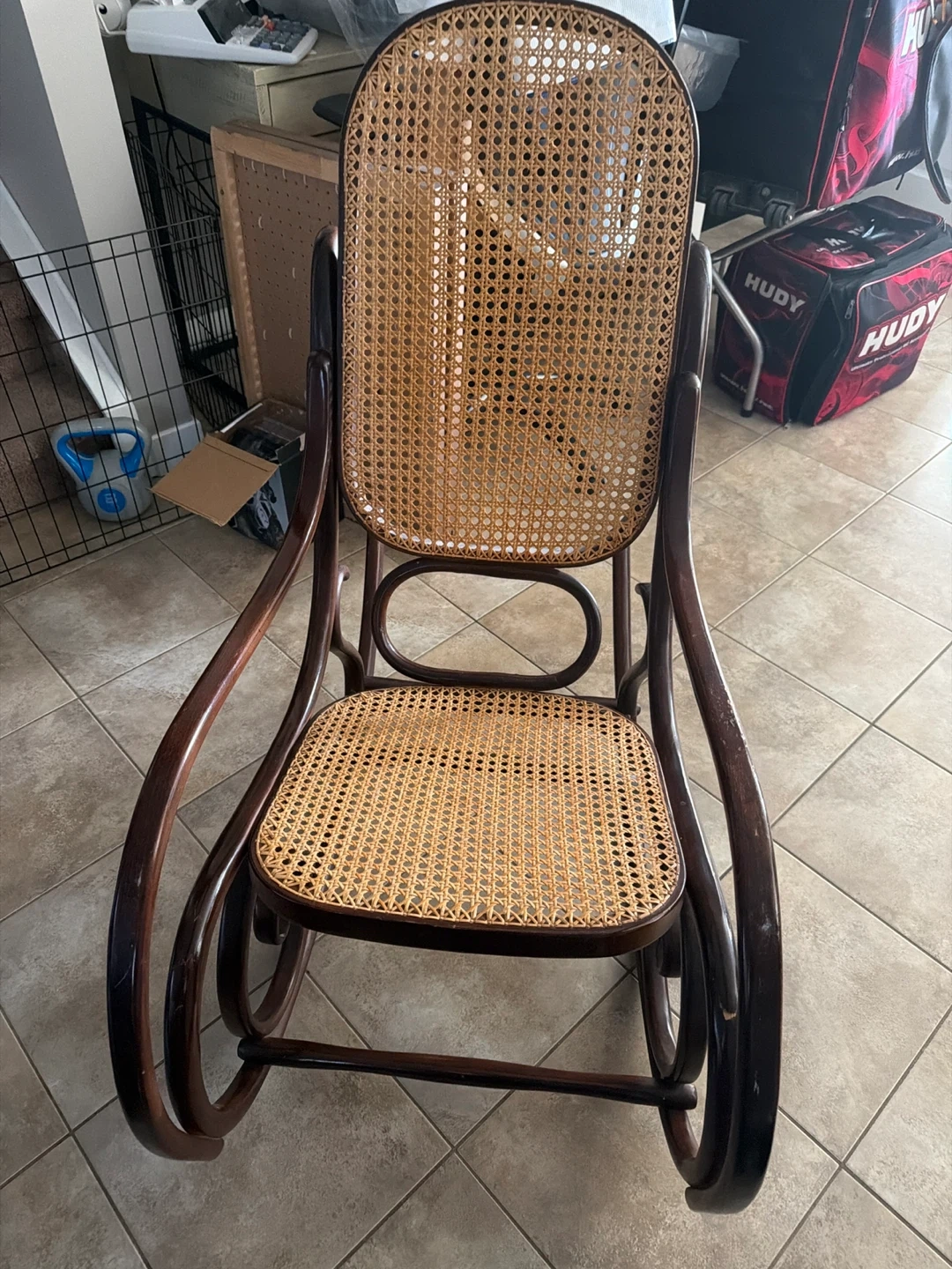 Classic bentwood rocking chair featuring a woven cane seat and backrest. Its dark wood finish and curved frame offer timeless style. This chair's smooth rocking motion is perfect for relaxing moments.