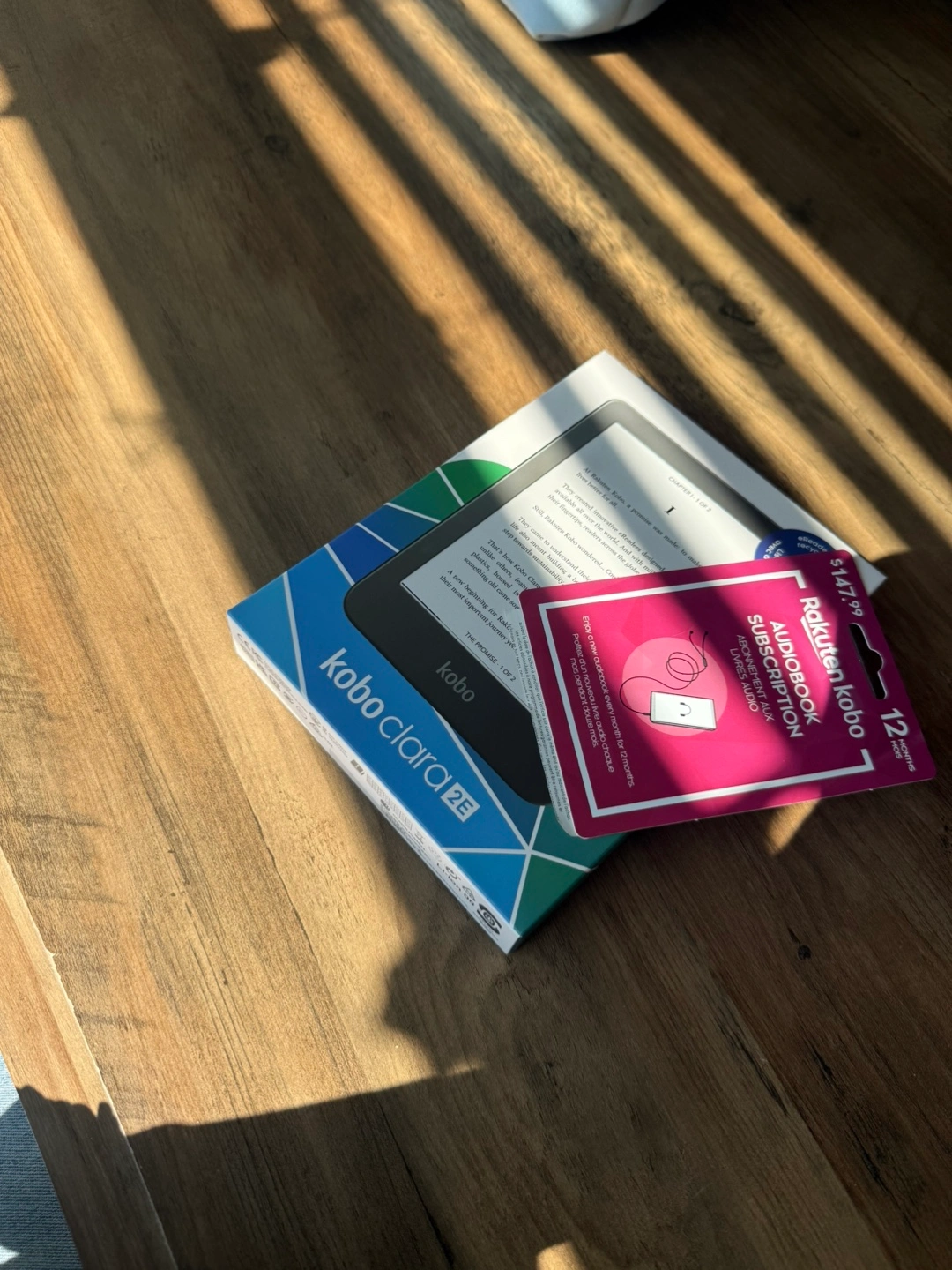10An unopened Kobo Clara 2E with a Rakuten Kobo audiobook subscription card. The e-reader is brand new, still in its original packaging. It is a perfect way to escape into a good book, anytime, anywhere.