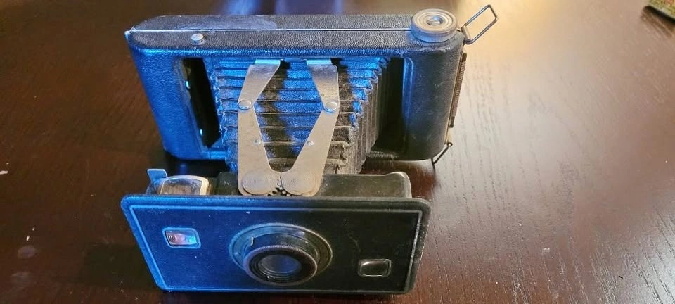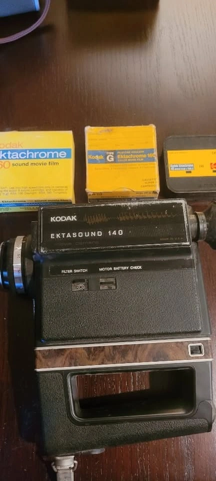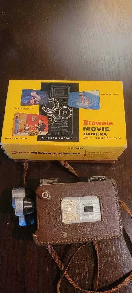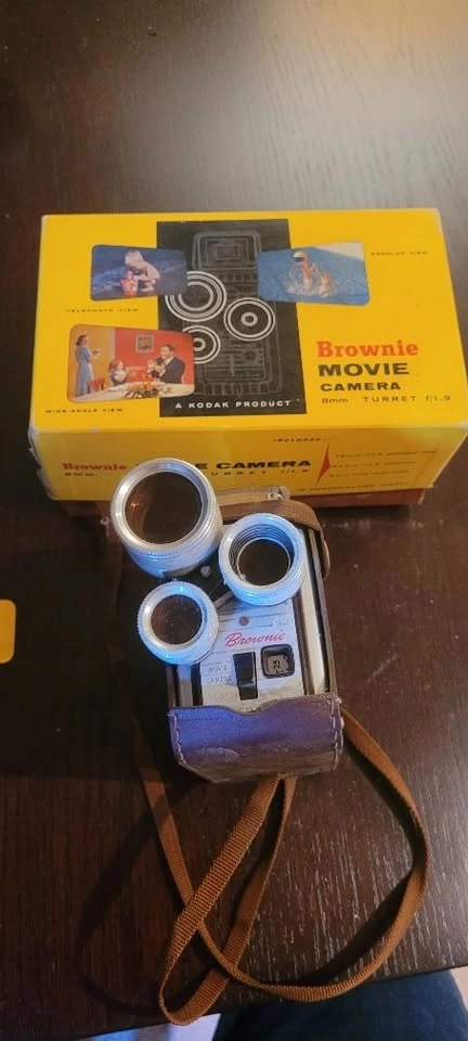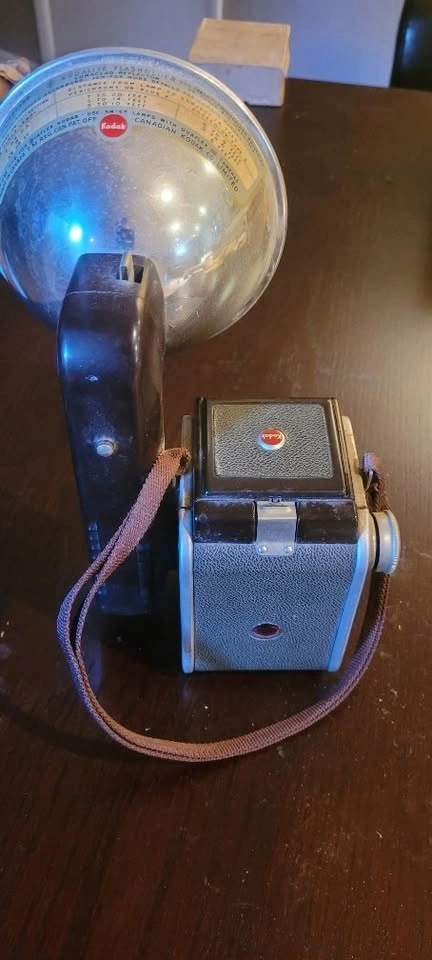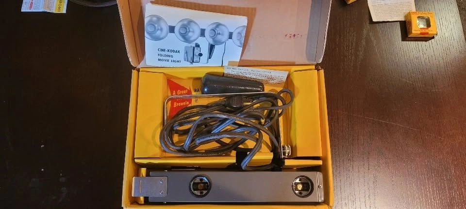 Kodak camera,s and accessories from the 30,s to the 70,s includes post viewfinder and 110 slides, Kodak Brownie, Kodak Dual flex 4 camera with flash attachment, Kodak brownie movie camera in original box, Kodak Jiffy camera, Kodak Ektasound 140 movie camera with unopened film and microphone, and a Kodak light bar in original box.