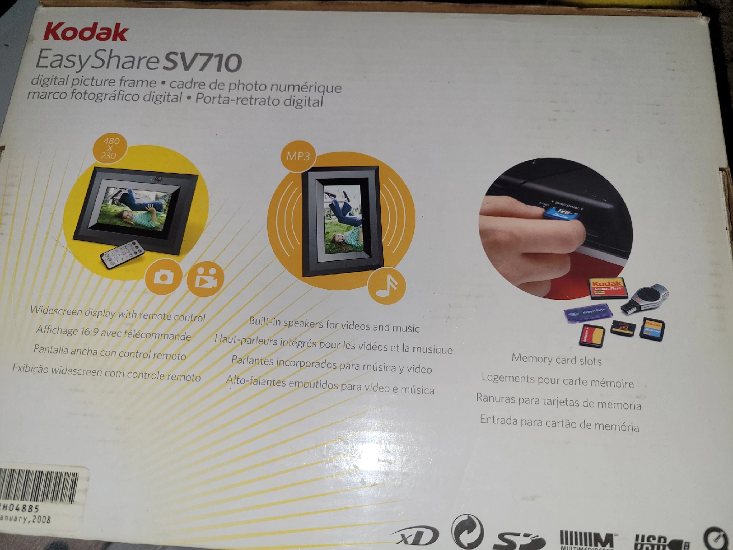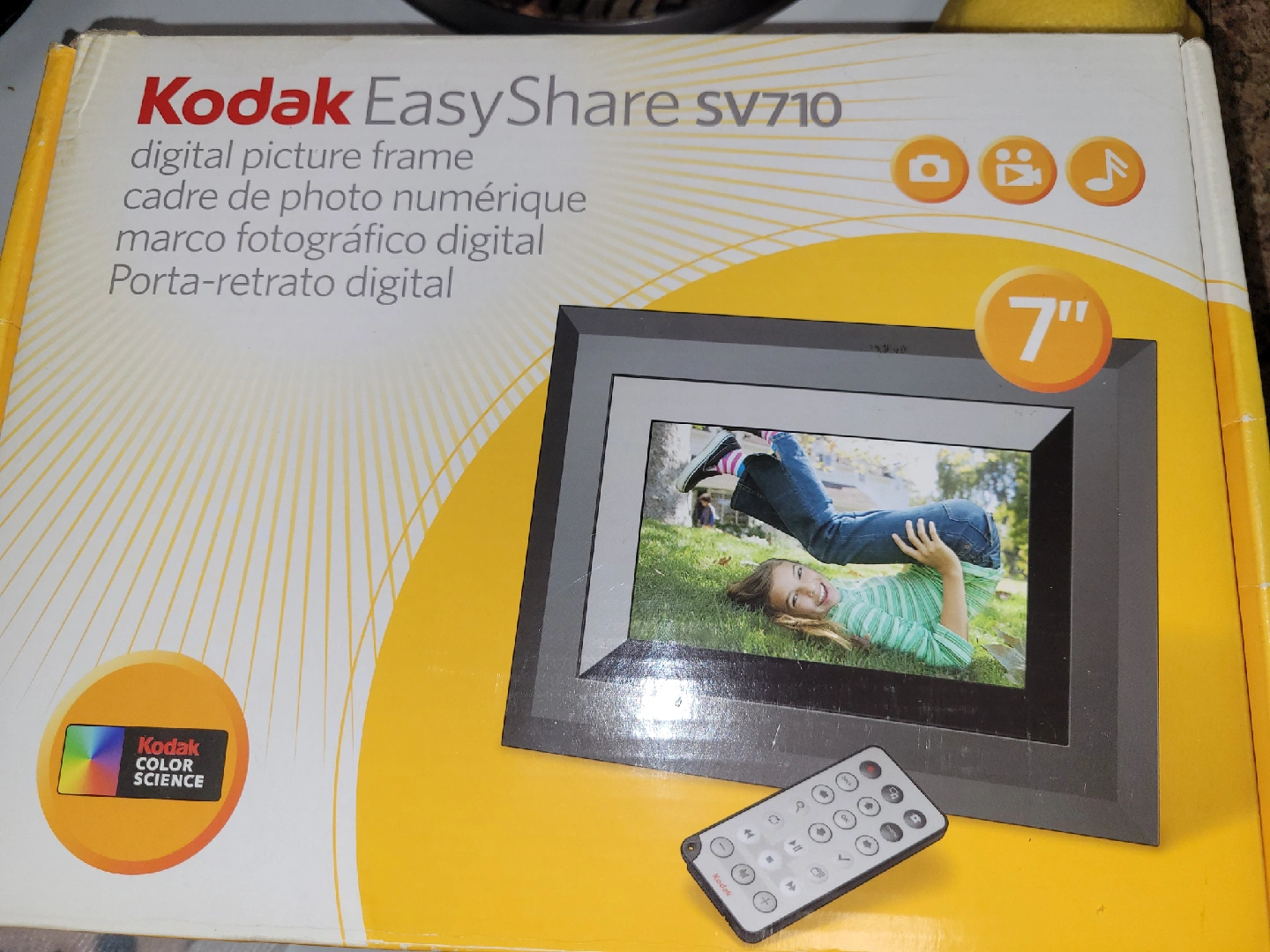 34Selling a Kodak EasyShare SV710 digital picture frame! It's a 7-inch frame that comes with a remote control. It has built-in speakers for videos and music. The box includes memory card slots for various types of memory cards. Has not been taken out of box.