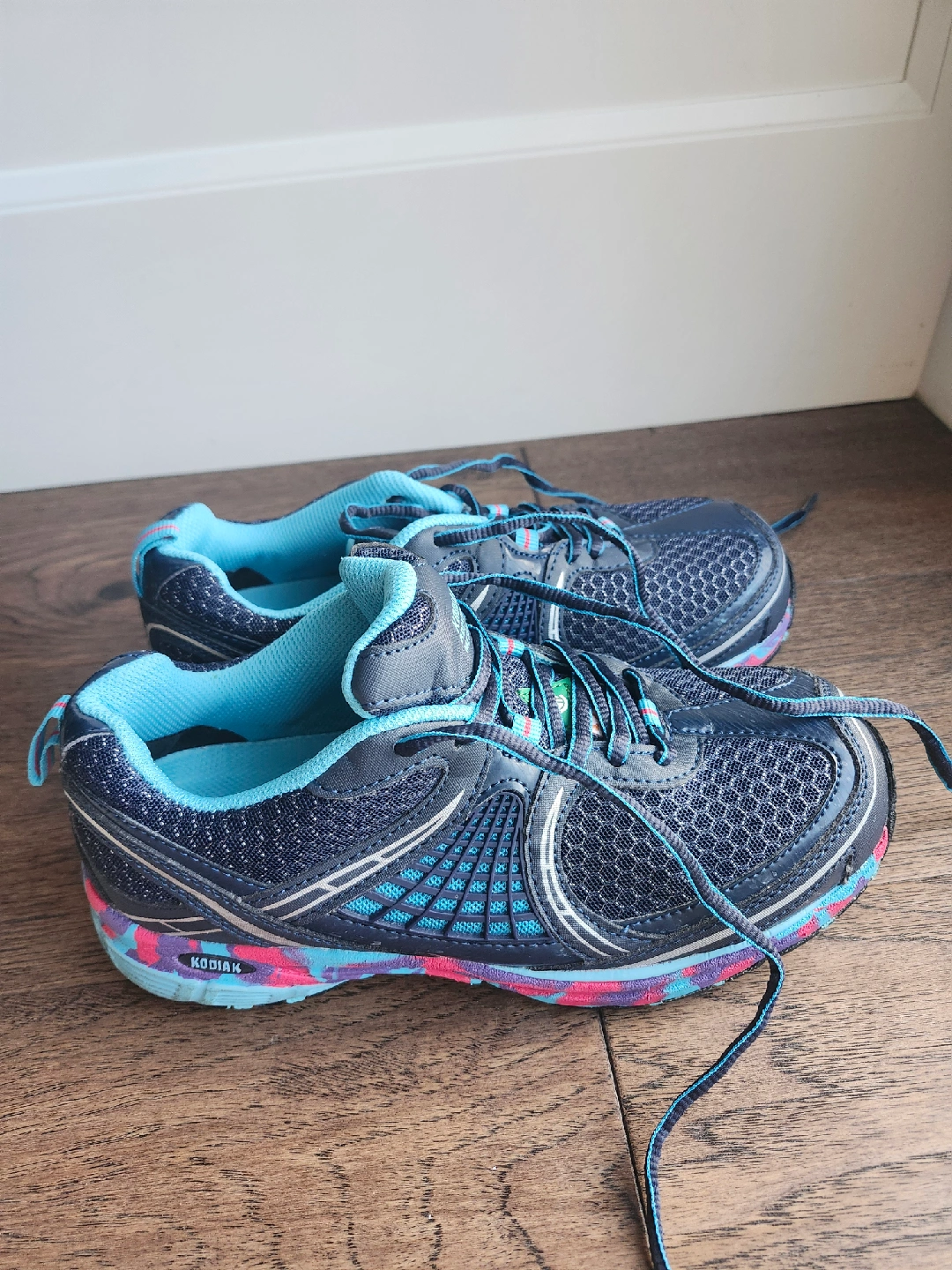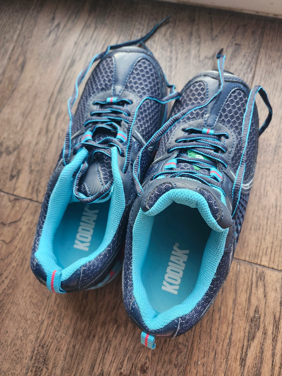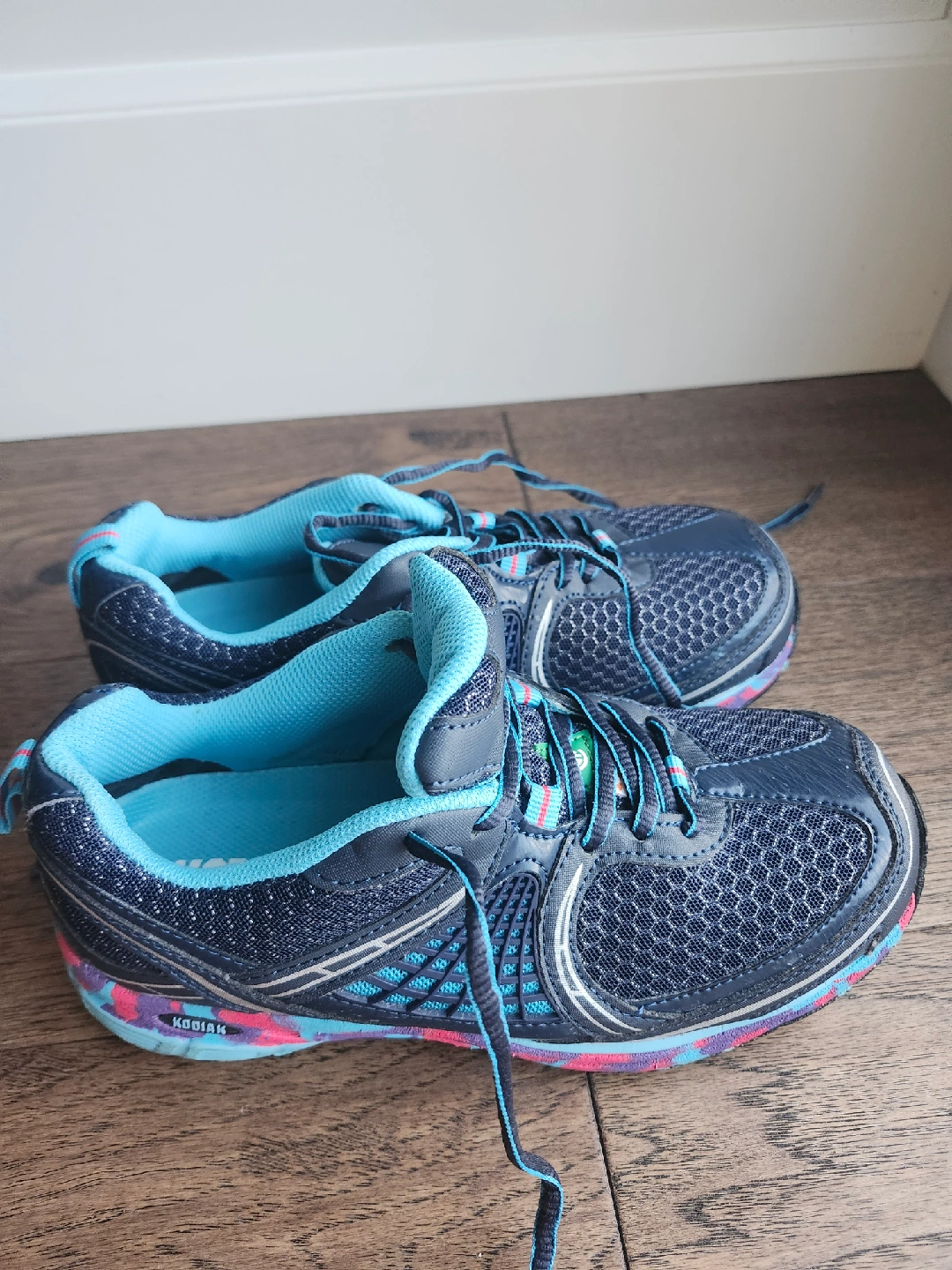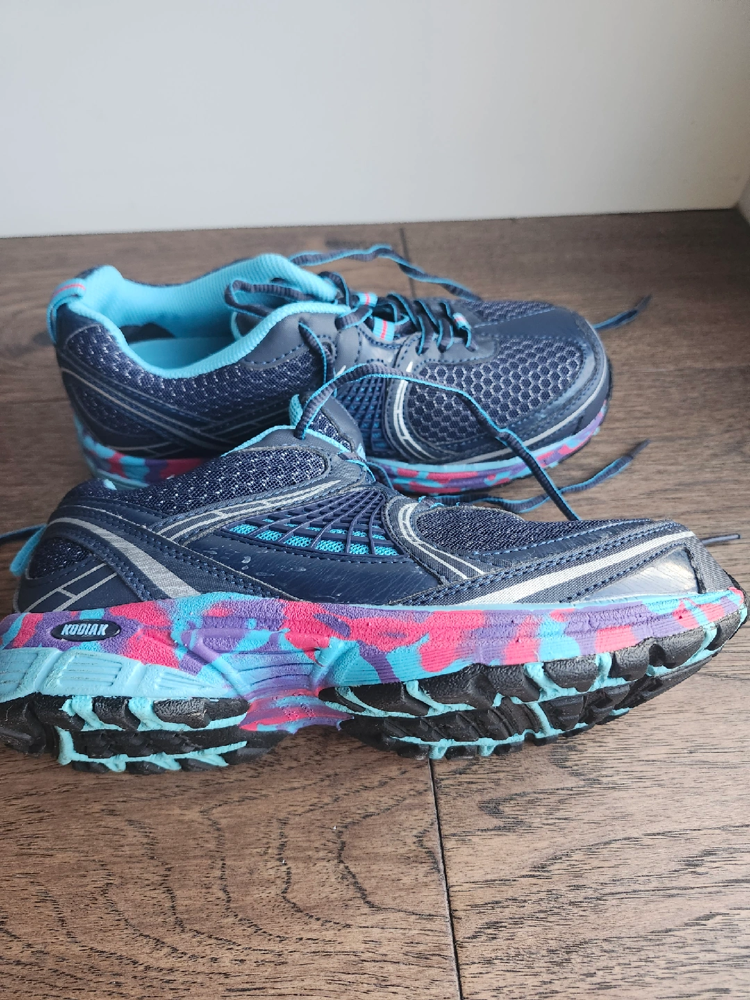 Selling a pair of Kodiak safety shoes in woman size 8. They feature a navy blue and turquoise colour scheme with a unique colourful sole. Great for protect your toes