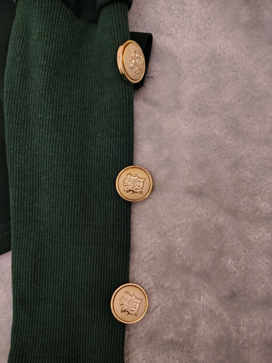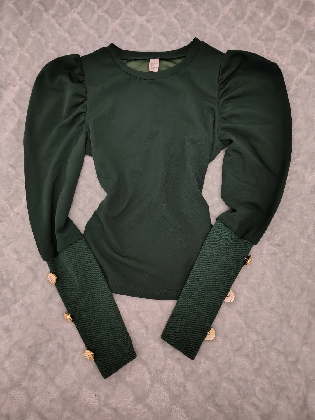 A stylish top in a deep green hue. It features voluminous puff sleeves and decorative gold button details on the cuffs. The knit cuffs provide a snug fit.