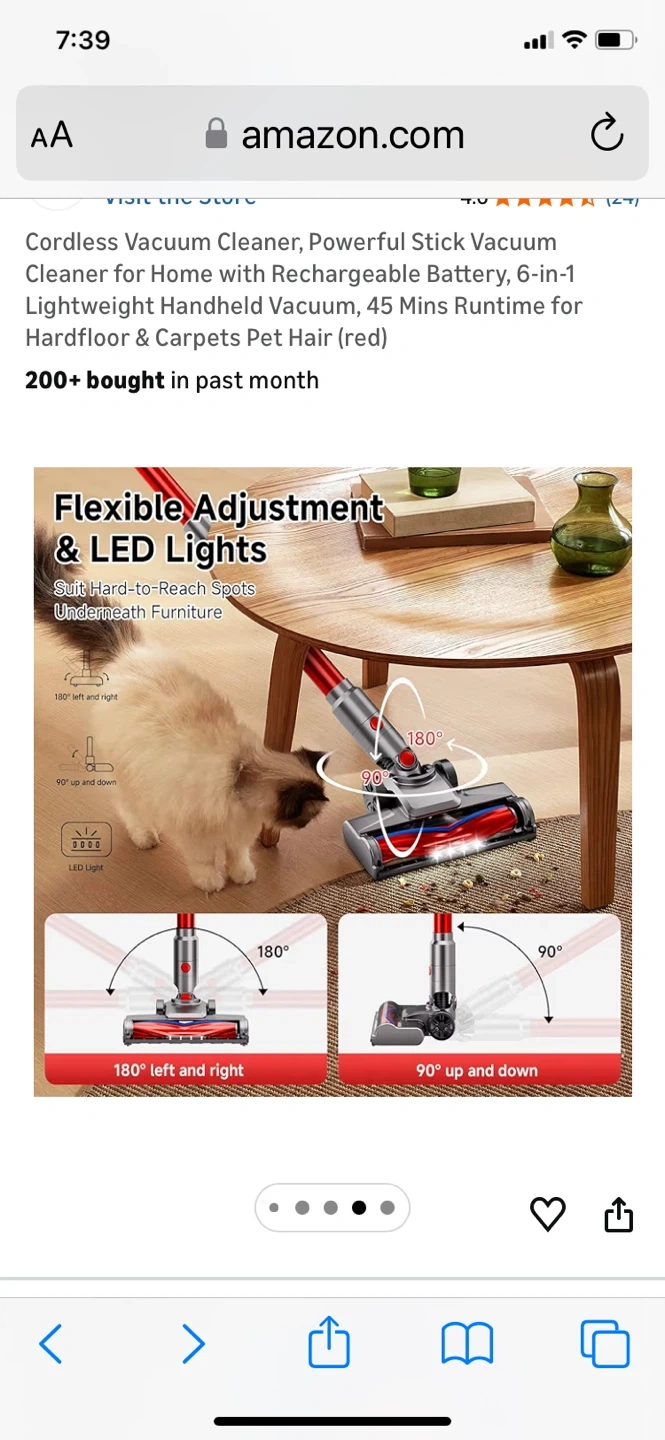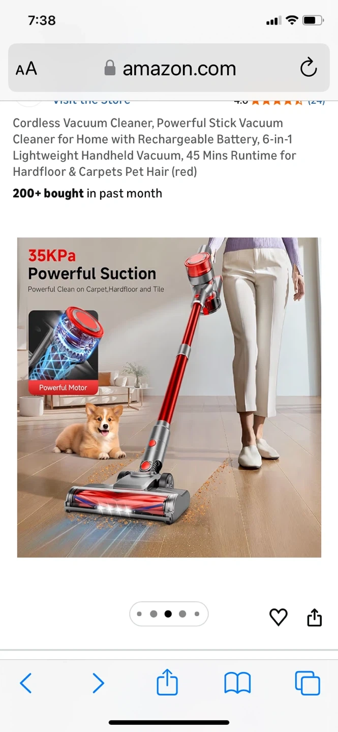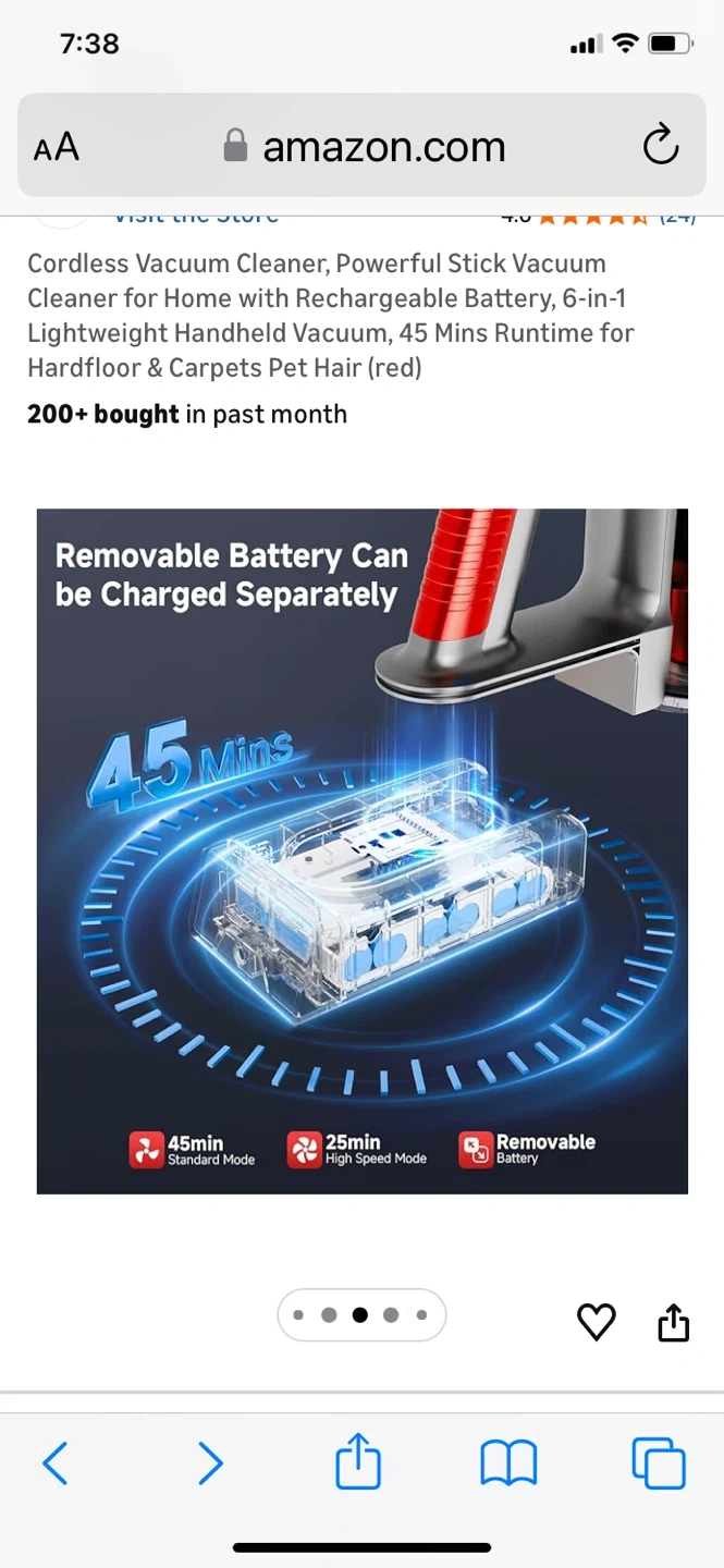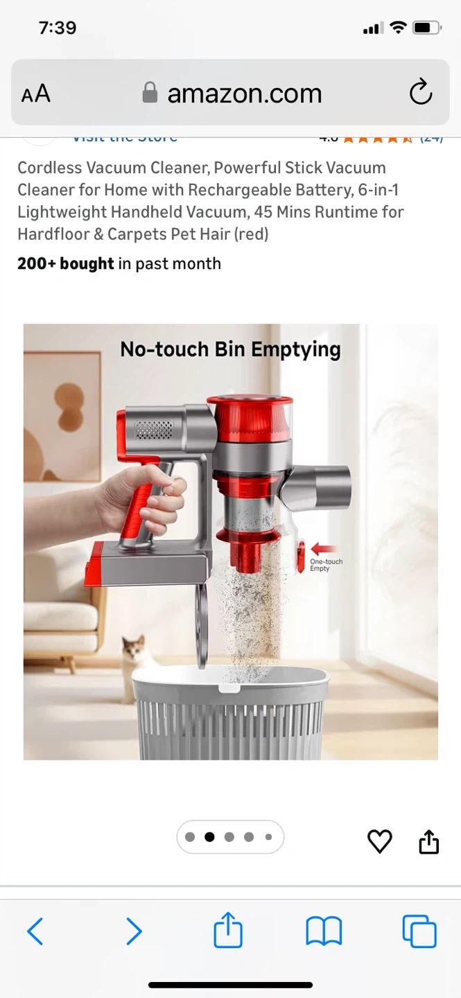 This is a red cordless stick vacuum cleaner with a rechargeable battery. It offers 45 minutes of runtime and a 6-stage, double cyclone filtration system. It features no-touch bin emptying and a removable battery that can be charged separately.