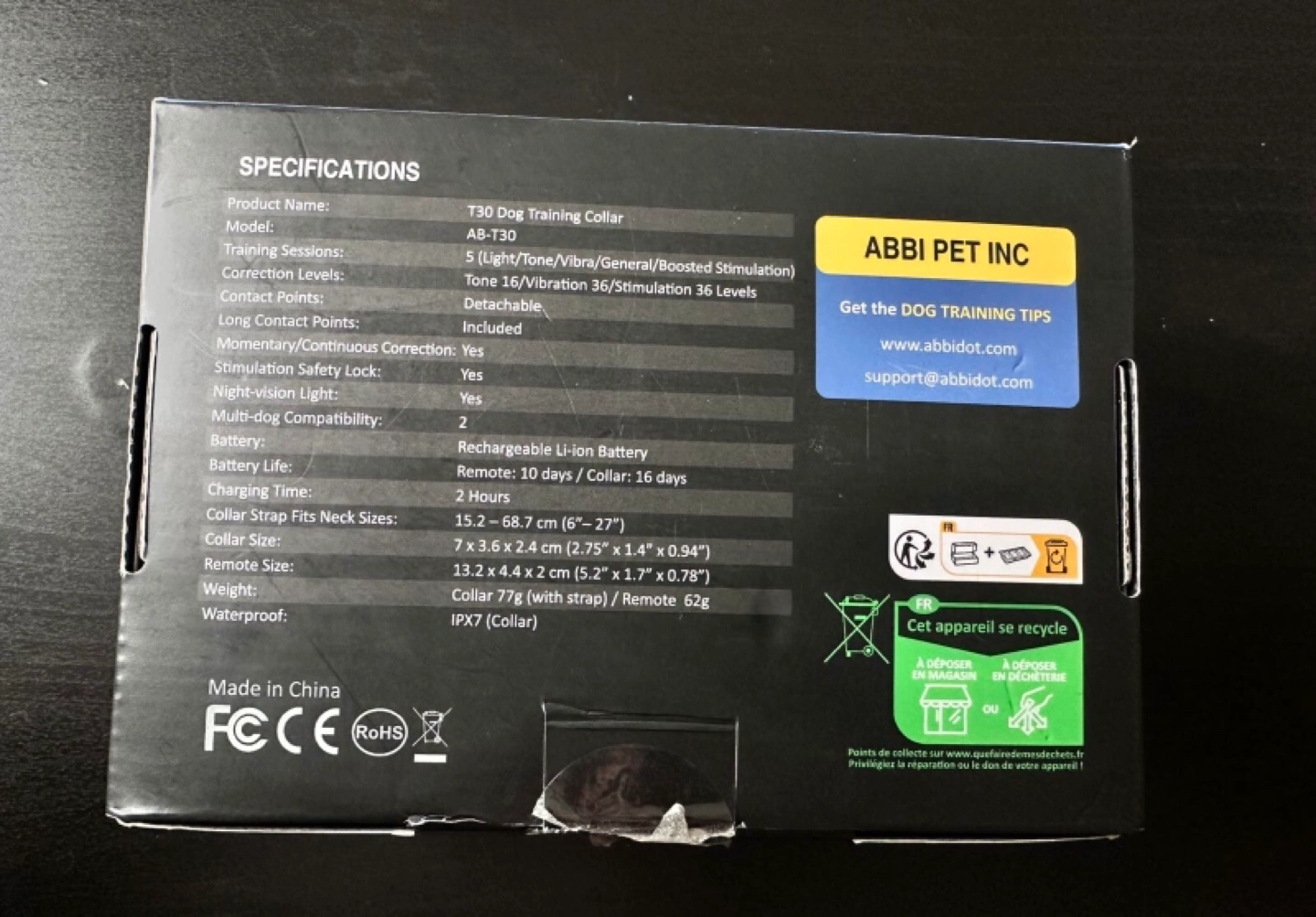 Remote dog training collar. Features 88 correction levels, night vision LED light, and rechargeable battery. Includes two devices and user manual. Long-range capabilities. Suitable for dogs who like to wander.