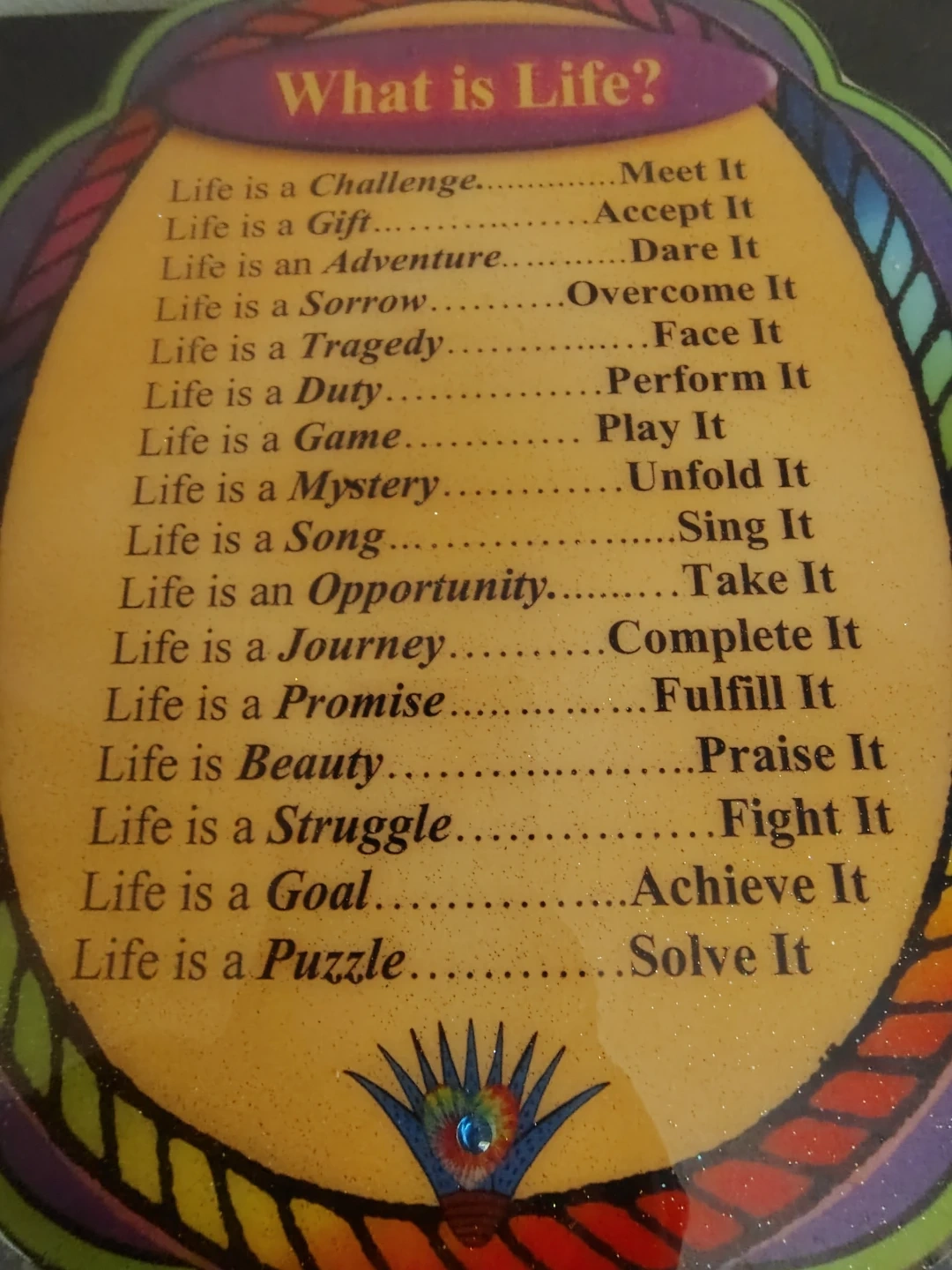 Decorative plaque with "What is Life?" theme. Features a list defining life as challenges, gifts, adventures, and more. Ready to hang.