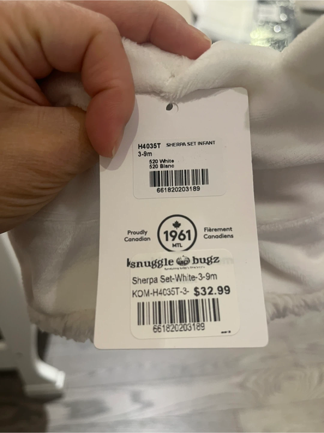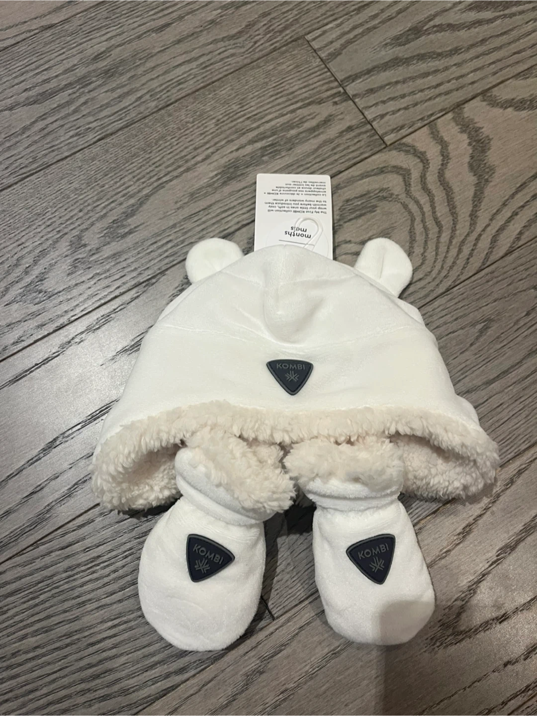 222This is a brand new Kombi Sherpa Set for infants, size 3-9 months in white. The tag shows the model number KOM-H4035T-3, and it was originally priced at $32.99. It's a super cute and cozy set!