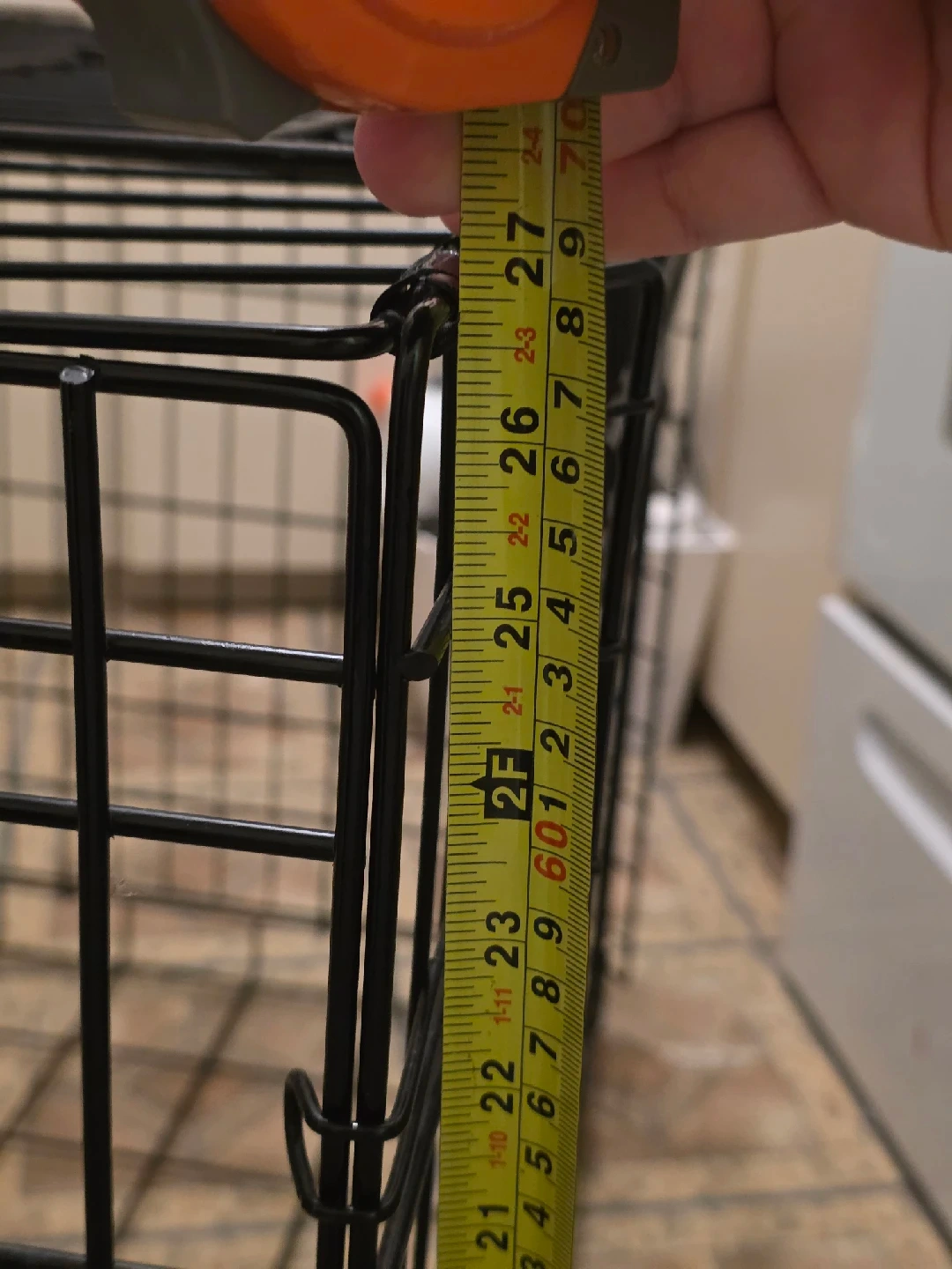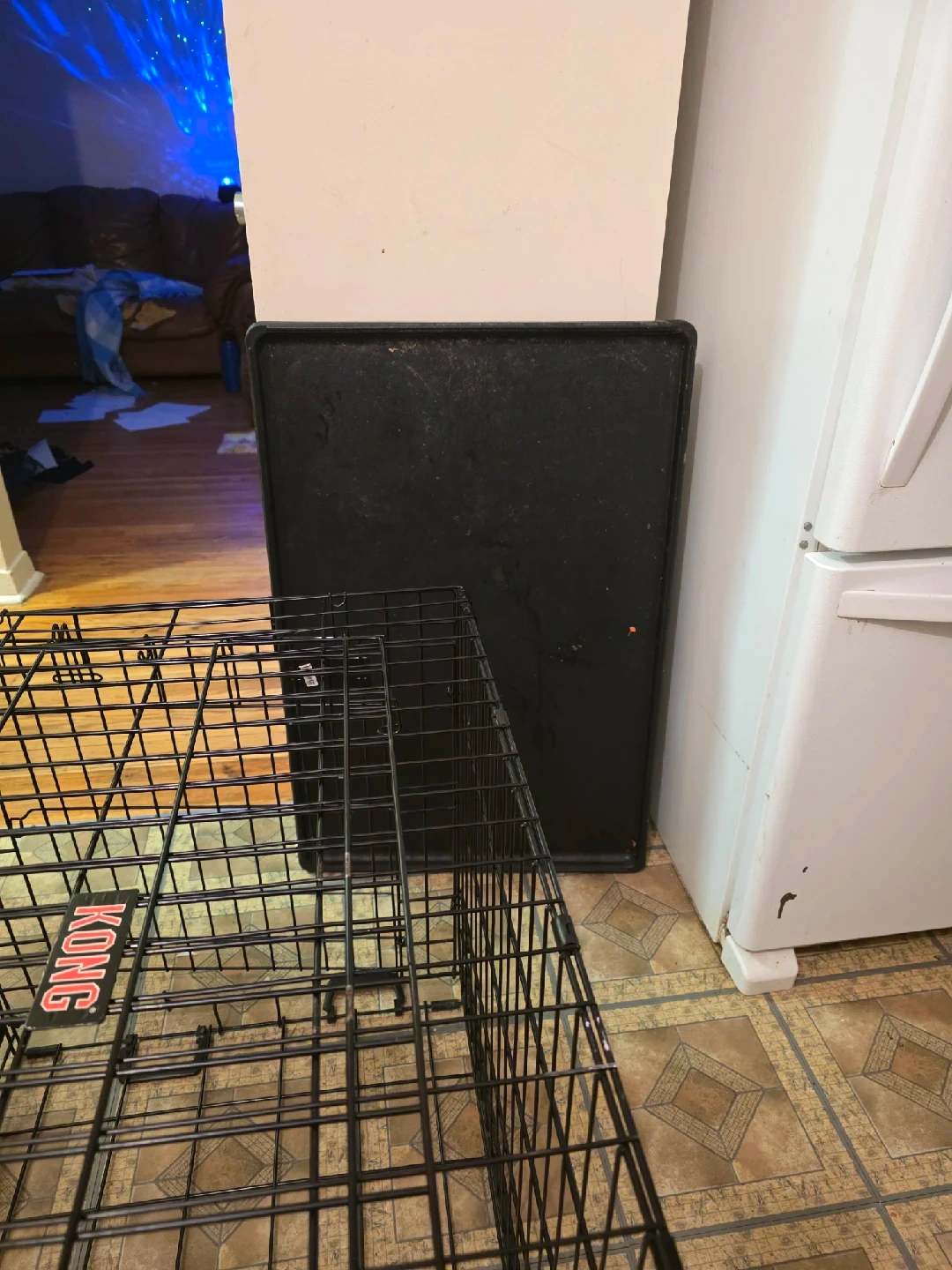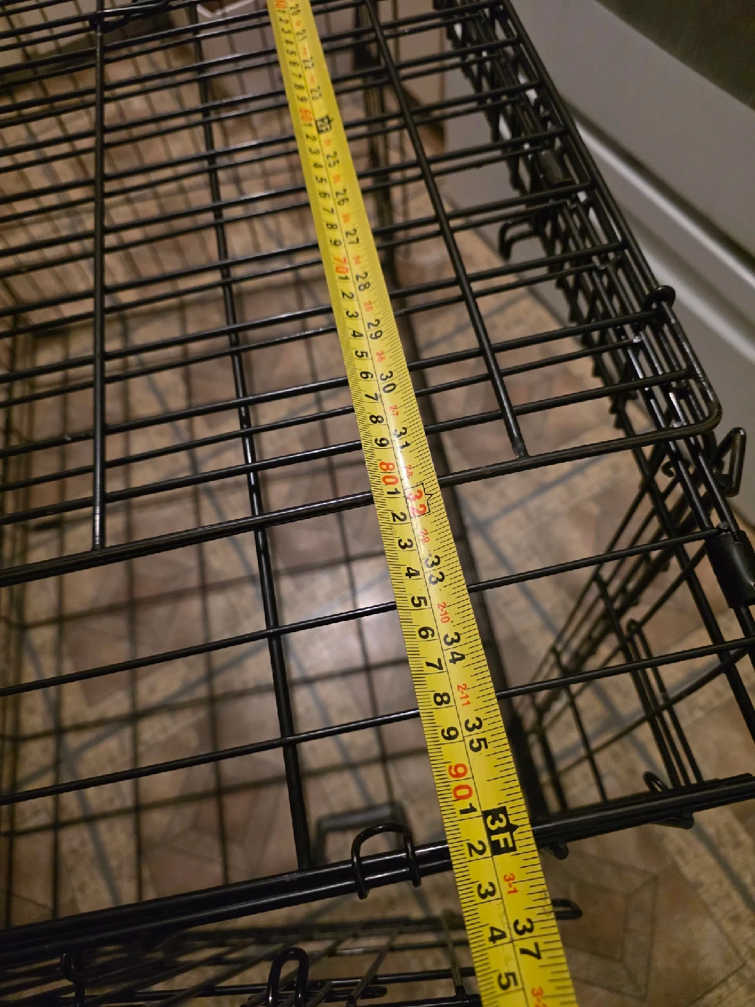 Dimensions are approximately 36 inches long, 24 inches wide, and 26.5 inches tall. Perfect for your furry friend! Has a tray that can be removed and cleaned.