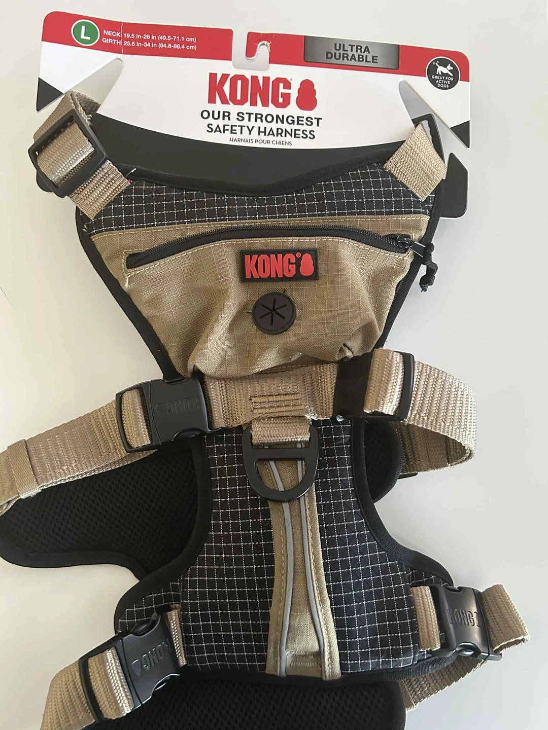 Selling a Kong Our Strongest Safety Harness in size large. It's designed for active dogs and is ultra durable. The neck size is 19.5 in - 28 in (49.5-71.1 cm) and the girth is 25.5 in - 34 in (64.8-86.4 cm)
