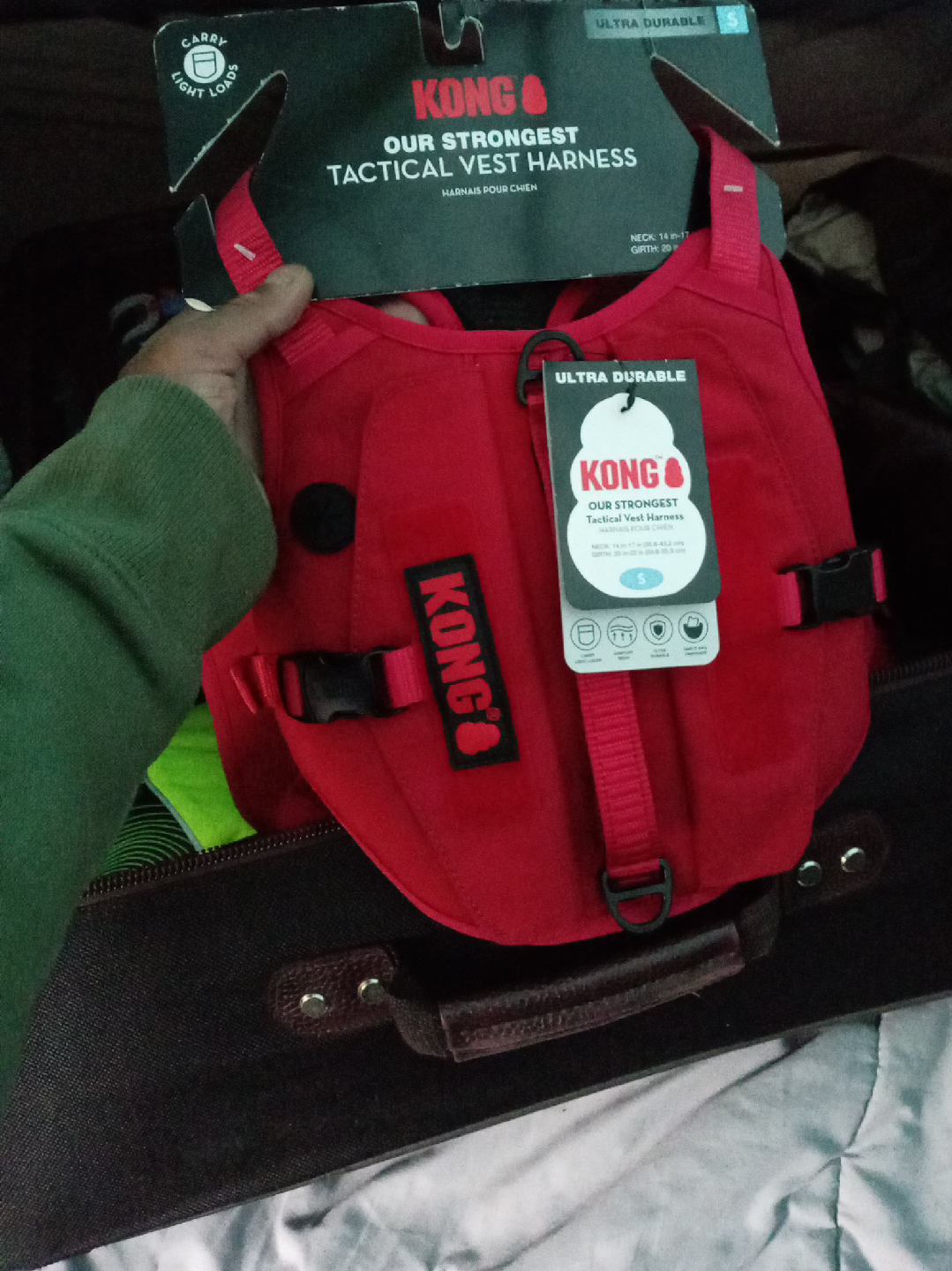 Selling a Kong Our Strongest Tactical Vest Harness in size small! This ultra-durable harness is perfect for your furry friend. It's designed for comfort and is built to last. Neck size: 14-17 inches, Girth: 20 inches