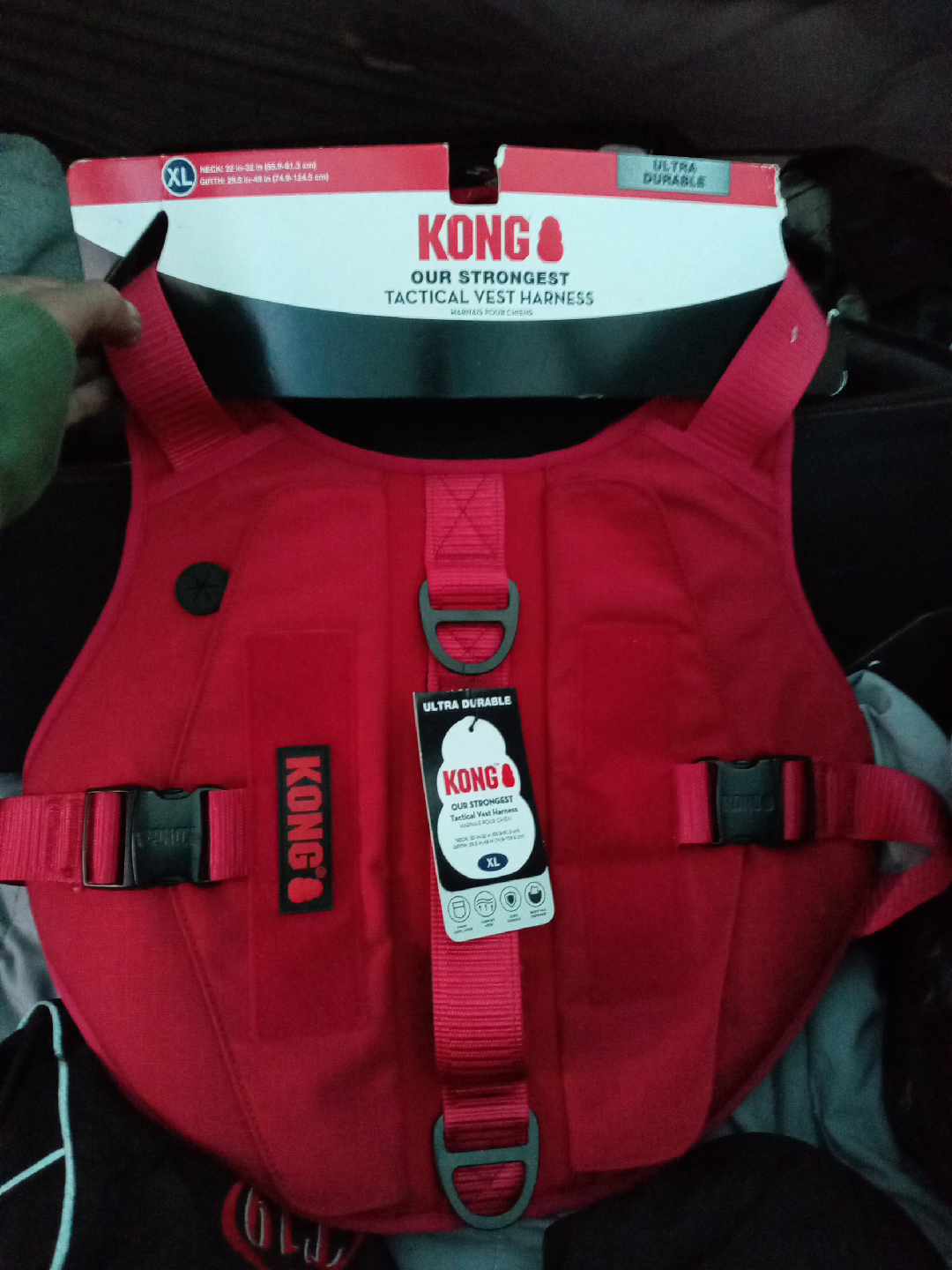 Selling a Kong 'Our Strongest' Tactical Vest Harness for dogs in size XL. It's red and appears to be ultra durable! Neck size is 22-24 inches (55.9-61.3 cm) and girth is 29.5-49 inches (74.9-124.5 cm)