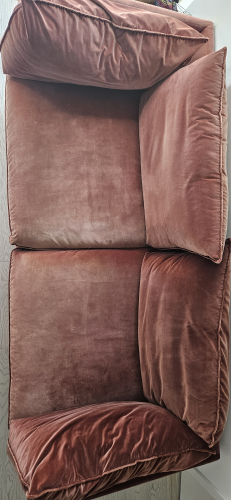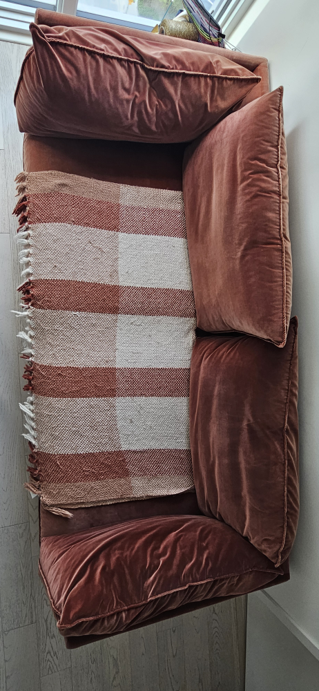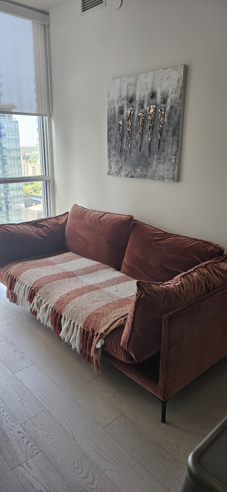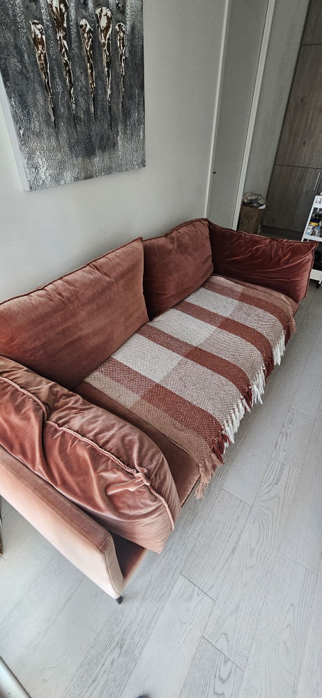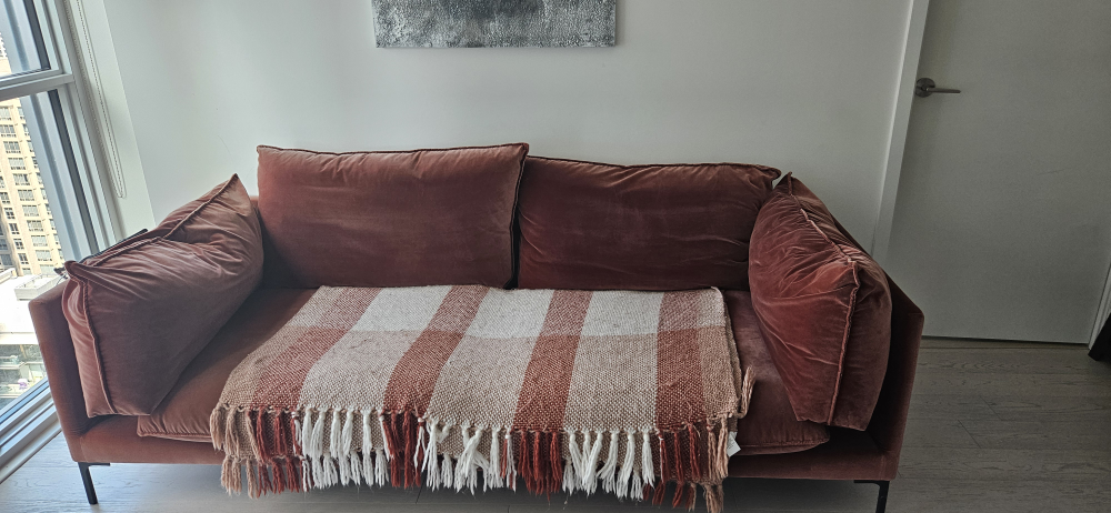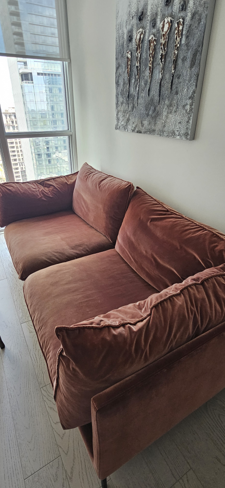 10This contemporary sofa with black metal legs is the perfect fit for the modern living space. The luxurious velvet fabric is soft and adds sophistication to any room. High-quality foams are used to create specific levels of comfort. The engineered frame made of kiln-dried hardwood and moulded plywood add strength and durability. Colour: Cinnamon Dimensions: W88X H31X D39 inches Material : Fabric - 77% Cotton, 23% Polyester Con.struction: Engineered frame made of kiln dried hardwood and plywood. High-quality foam Suspension system made from industrial strength polyester/nylon woven webbing, set to a specific and unified tension gauged by computer for consistency Back and arm cushions are filled with a combination of foam, fibre and feathers for plush comfort Metal leg in black finish Notes: - no pets in the house - some stains on seat cushions - since the blanket has a matching colour with the sofa it is also included in the sale