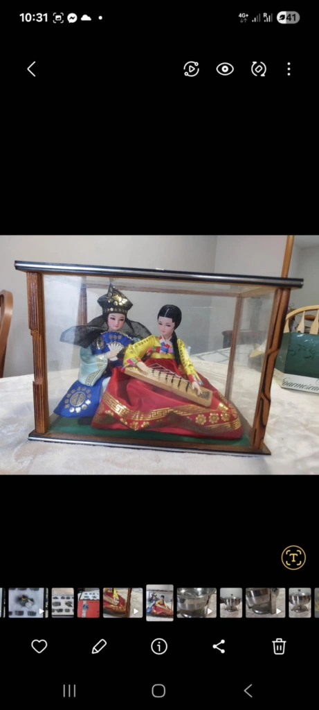 Two Korean dolls displayed in a glass and wood case. They're wearing traditional Korean clothing. Perfect for collectors or as a unique decorative piece! pick up