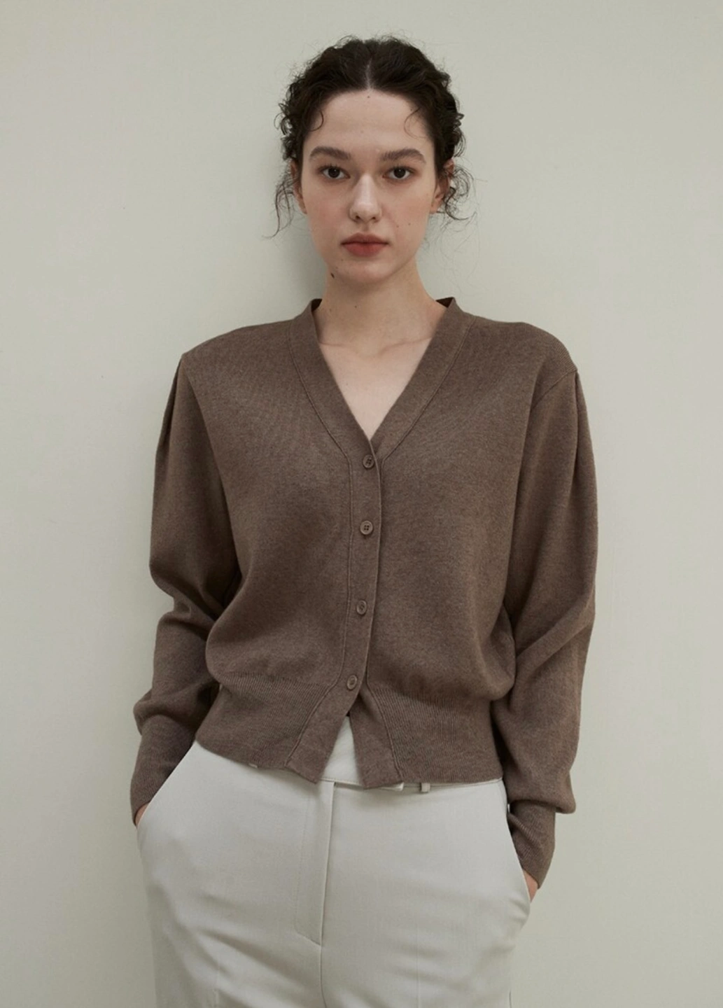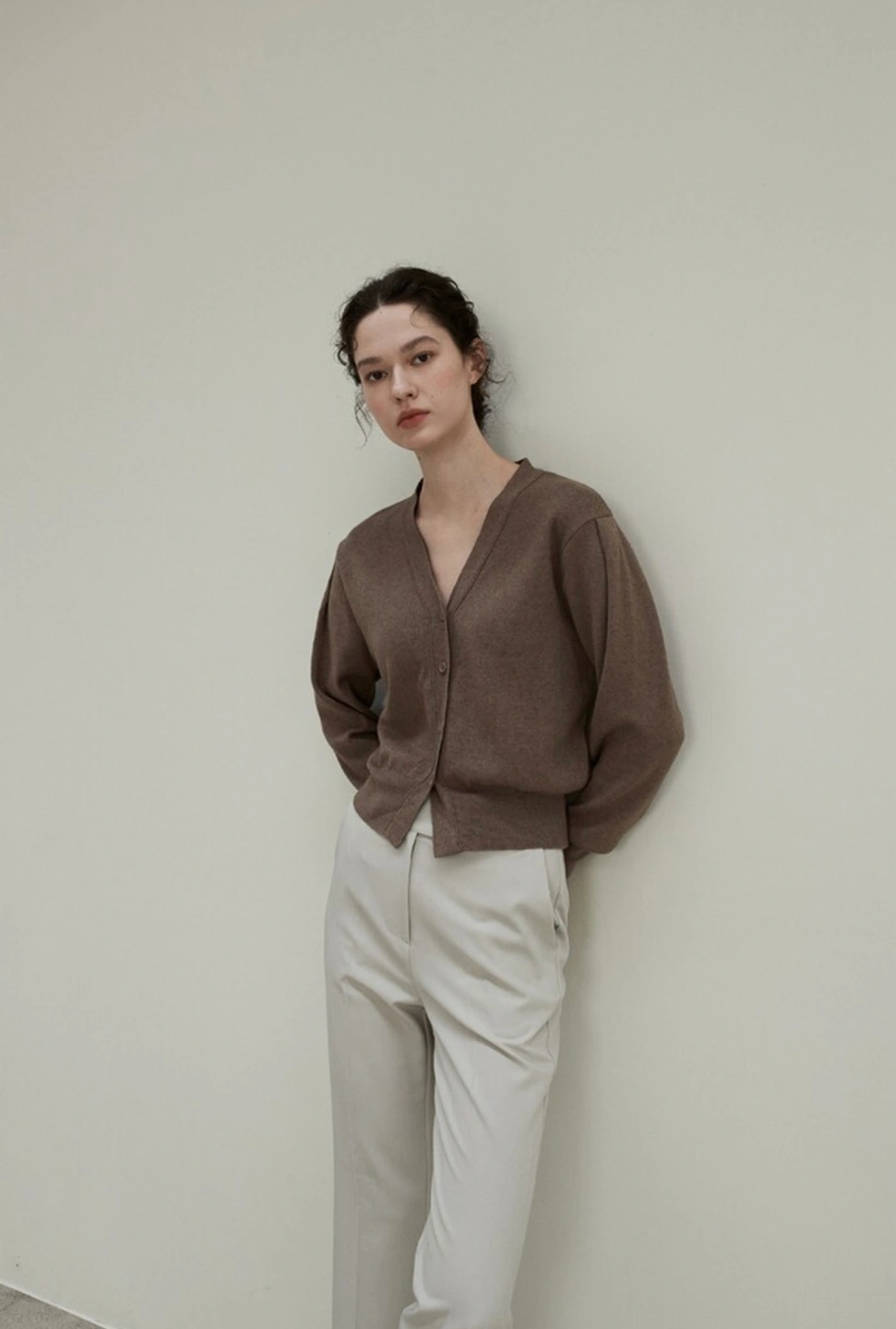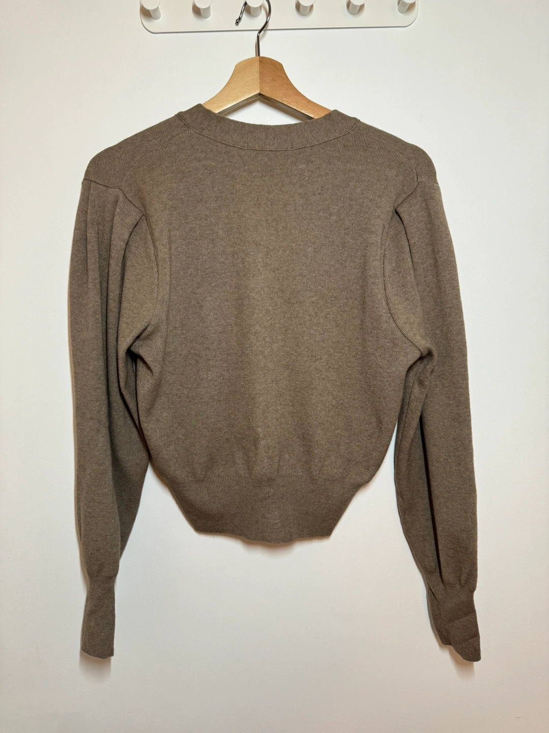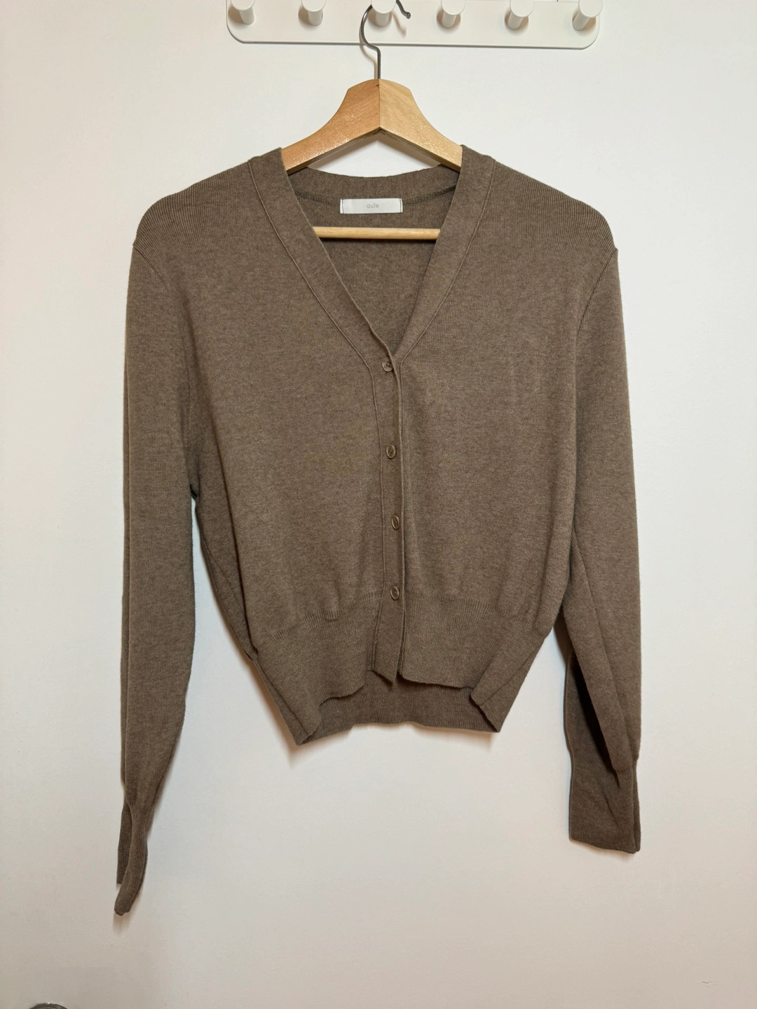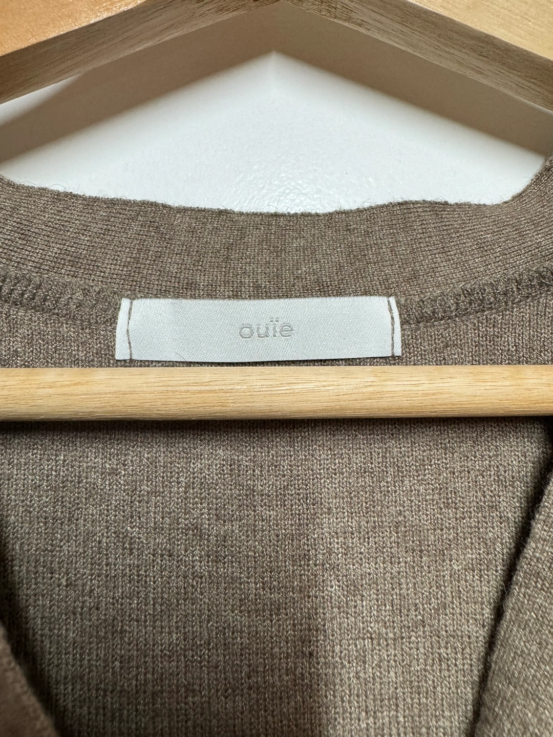 147Brand New, Never Worn! Purchased in Korea. From Korean designer brand Ouie. Free size - usually fits XS-M Original Price: $90 A brown cardigan sweater with long sleeves and a v-neck.