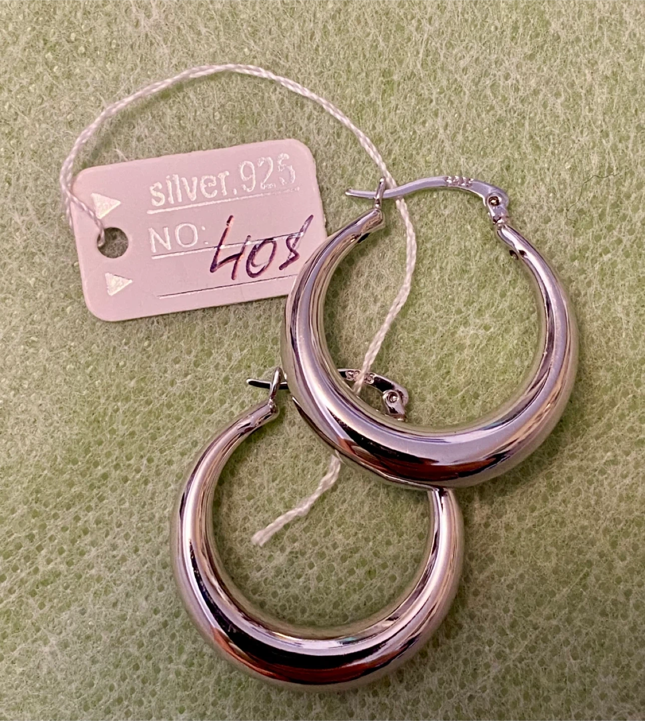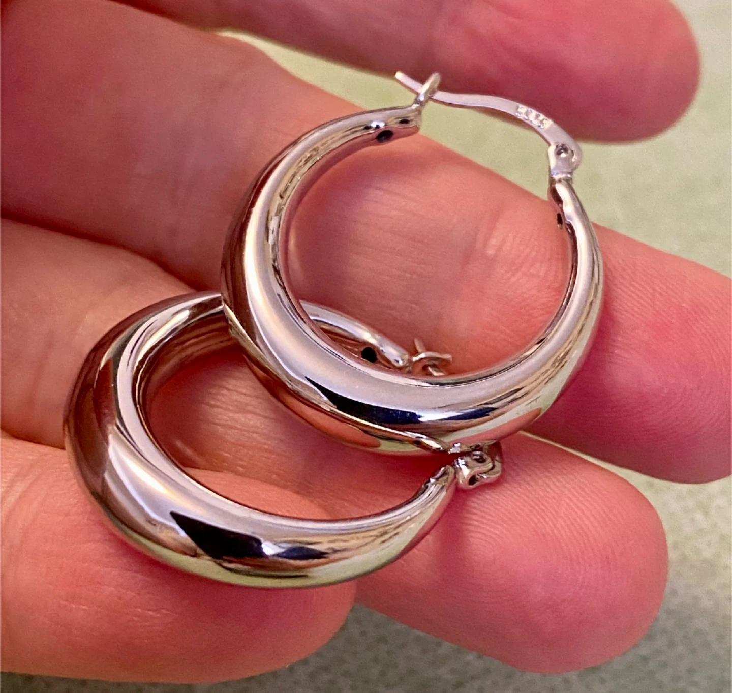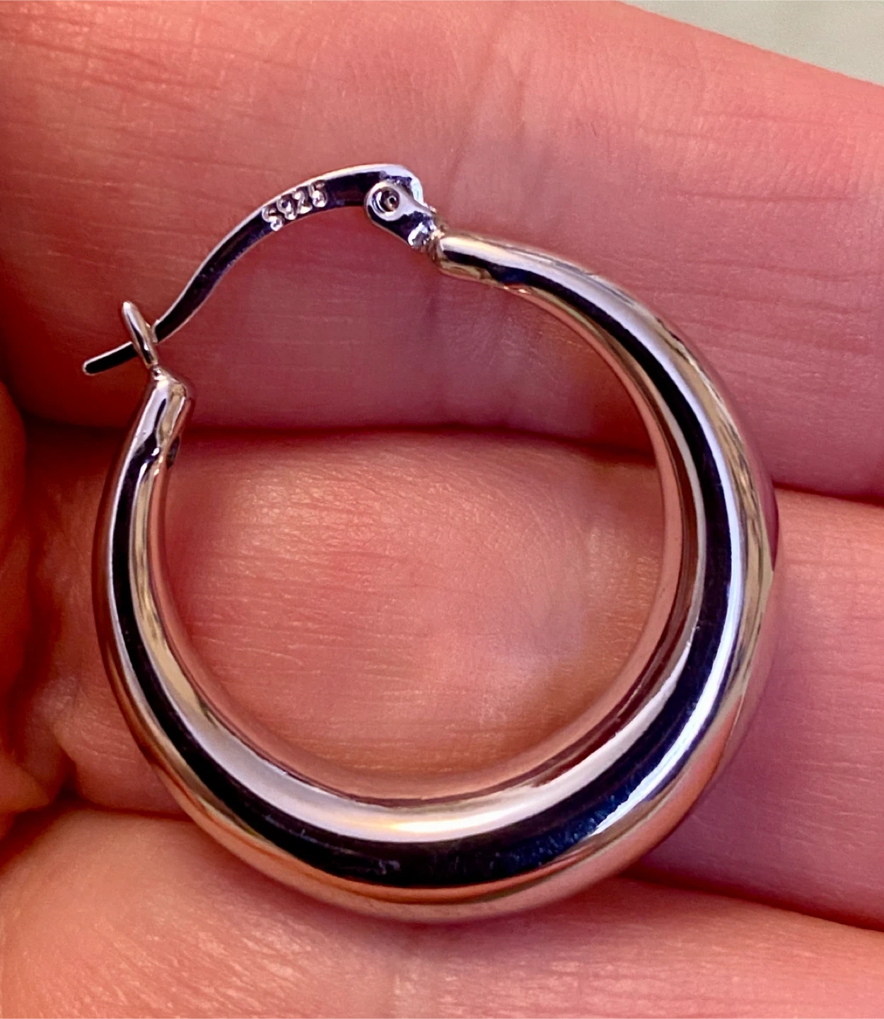 These are a pair of polished sterling silver 925 hoop earrings. They're substantial but not too heavy. These hoops would be a great everyday accessory!