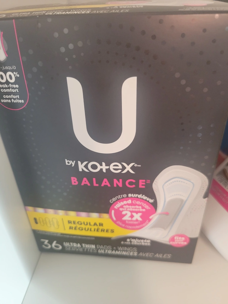 Selling a box of Kotex Balance Regular Ultra Thin Pads. This box contains 36 ultra thin pads with wings. They feature a raised center that absorbs quickly and fits curves for leak-free comfort
