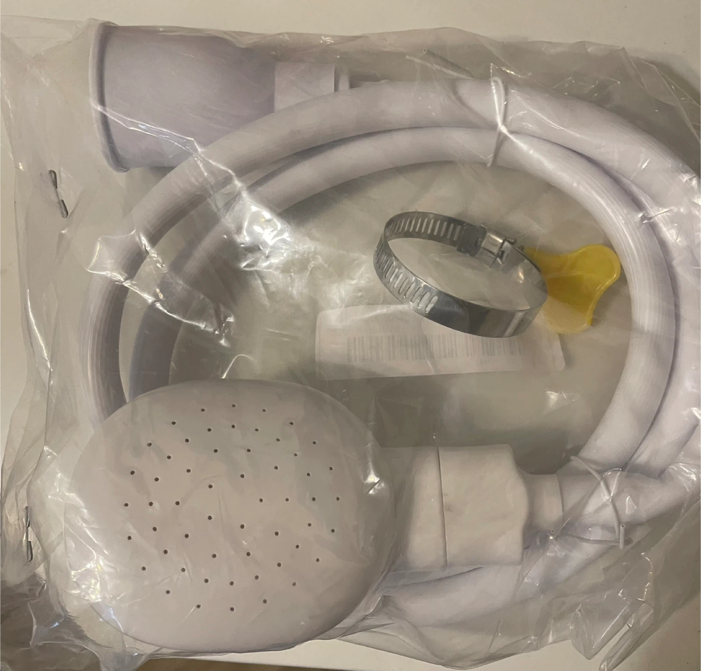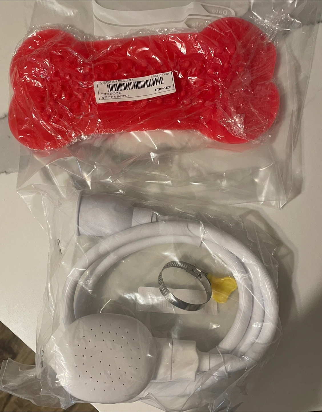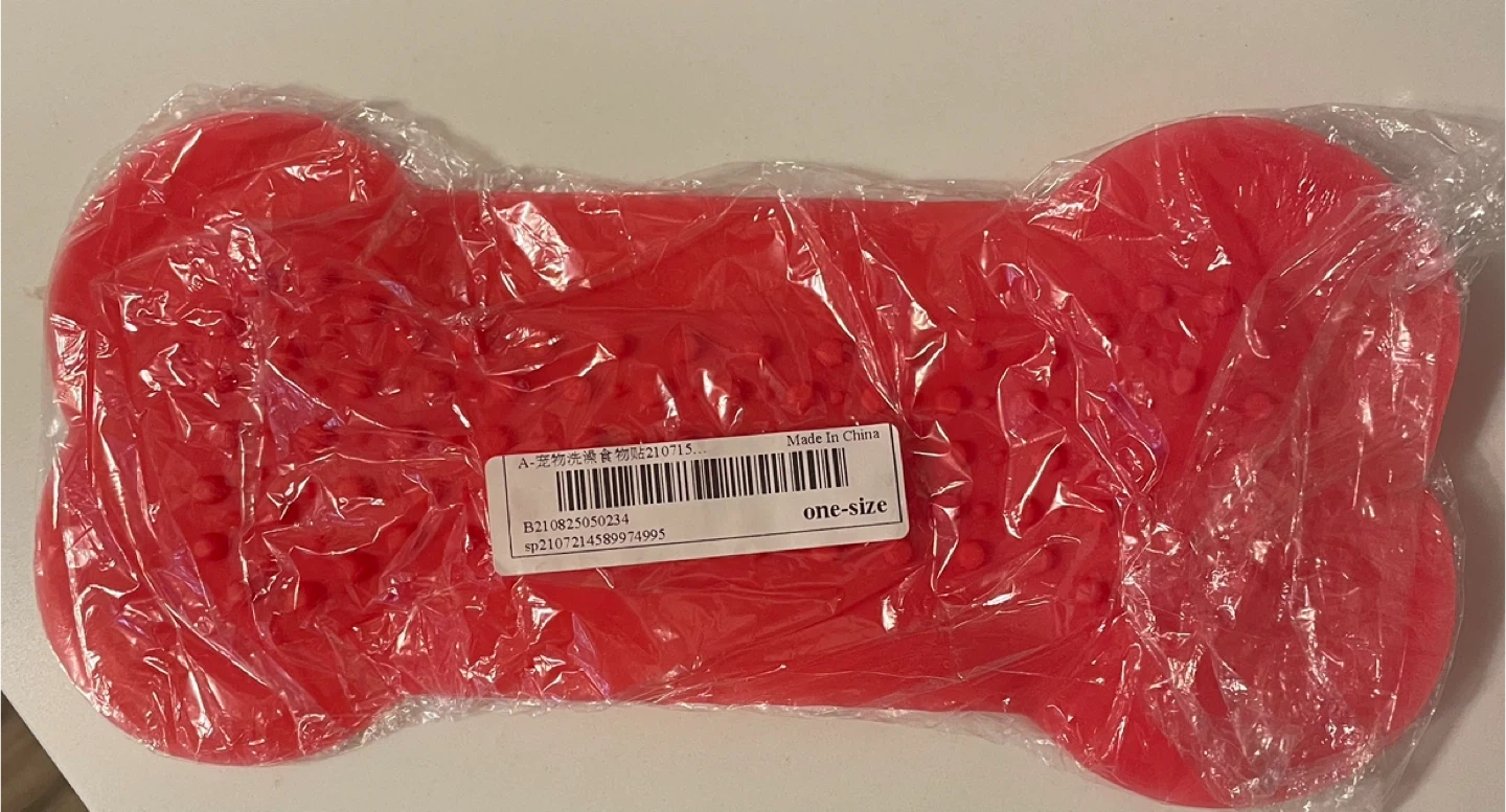 This set includes a red bone-shaped dog lick mat and a white shower head with hose. The lick mat is one-size and made of silicone. The shower head is designed for washing pets.