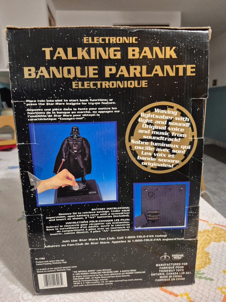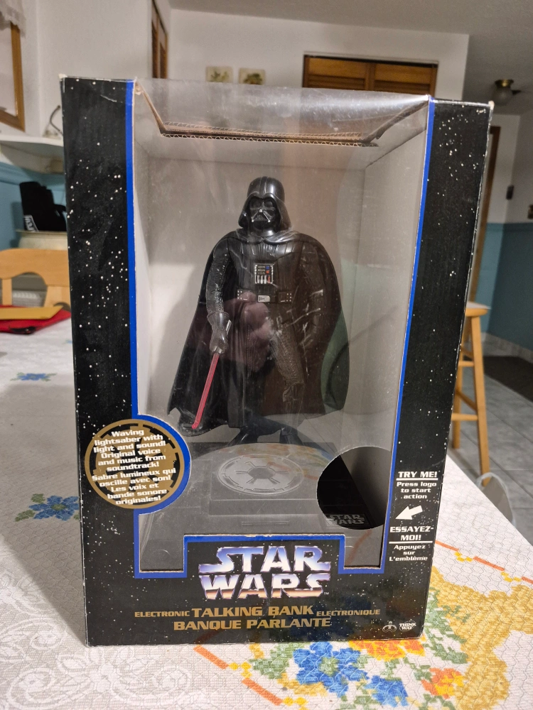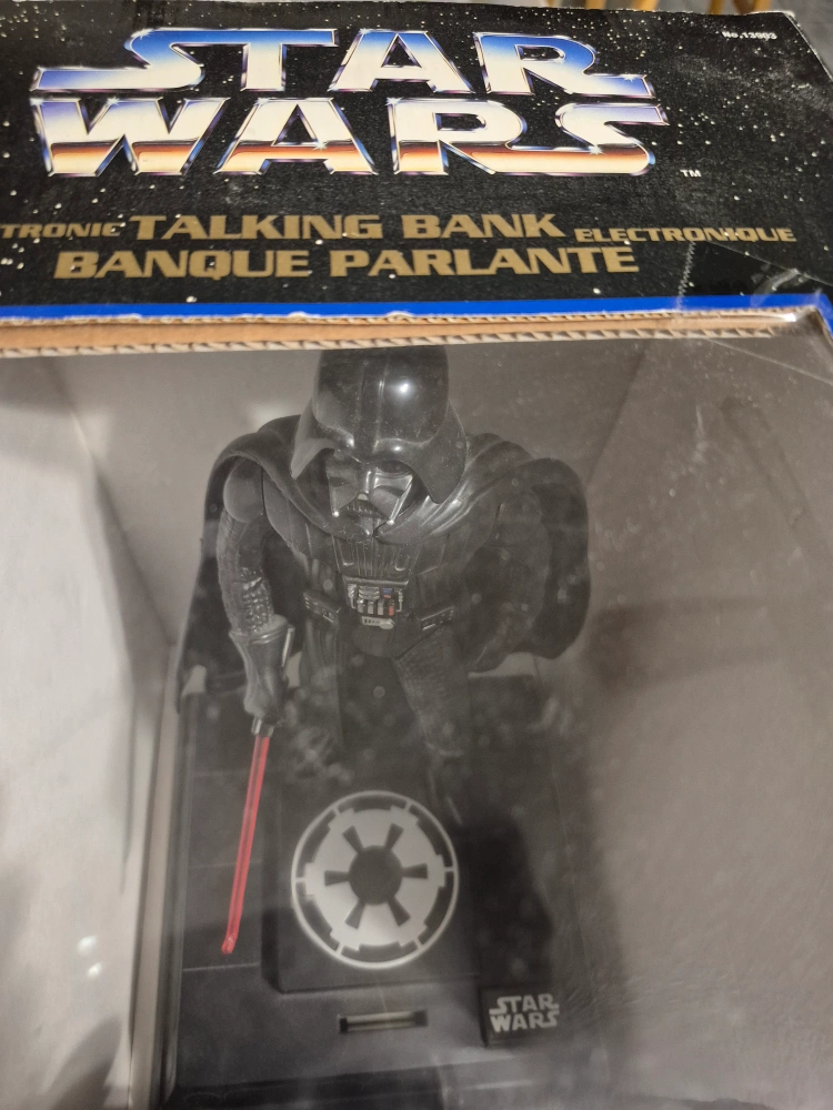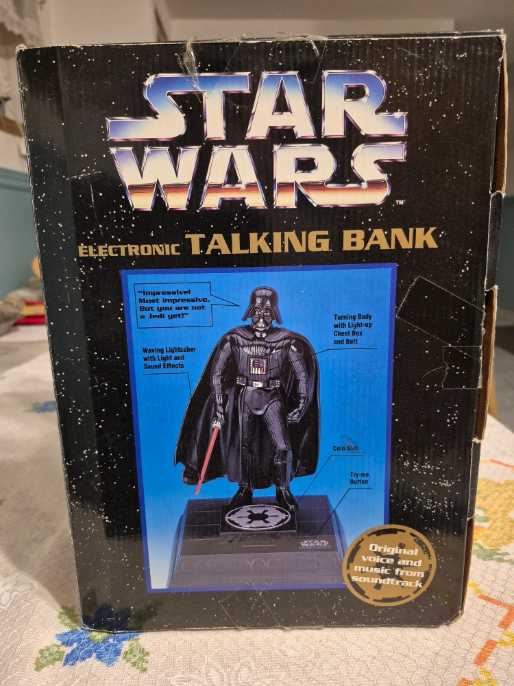 Collectible Darth Vader bank. Features lights and sounds. Original voice and music. In original box.
